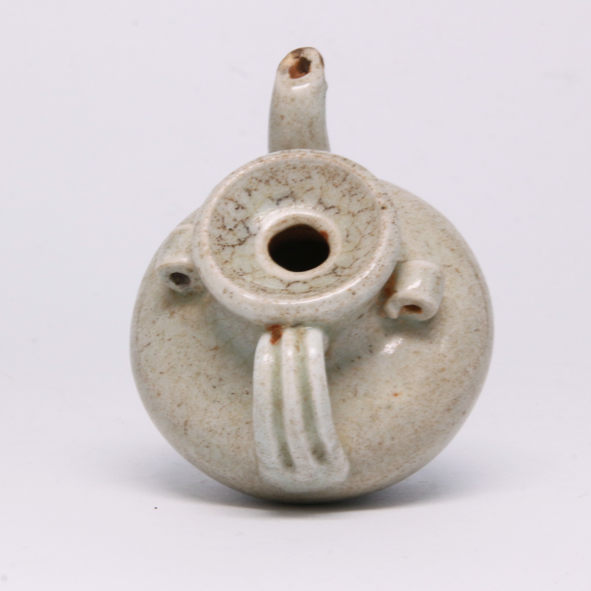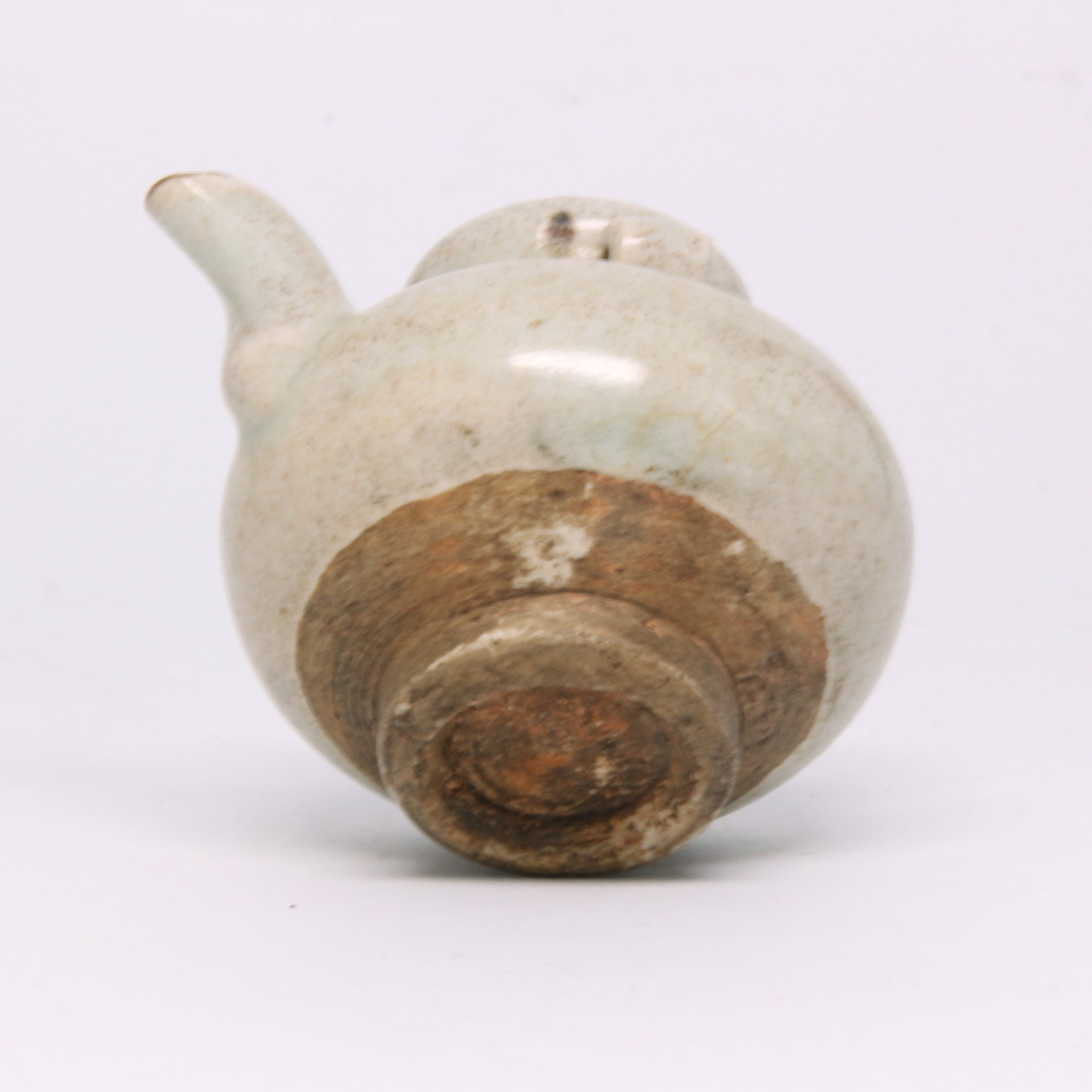 水滴是古代文人書齋中不可或缺的研墨輔助工具。使用時,文人透過控制頂部的小孔,將水滴入硯台內磨墨,其出水量細小如滴,故名「水滴」。這種器物體現了古代文人對於細節的極致追求——即便是一個小小的注水容器,也要兼顧工藝的美感與使用的手感。此件水滴胎質堅緻,底足露胎處呈現乾澀的土褐色,與溫潤的釉面形成視覺對比,是研究古代書寫文化與文房美學的重要實物。