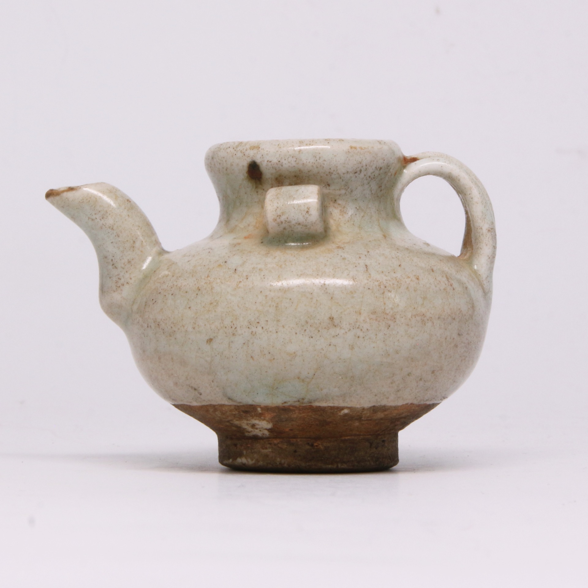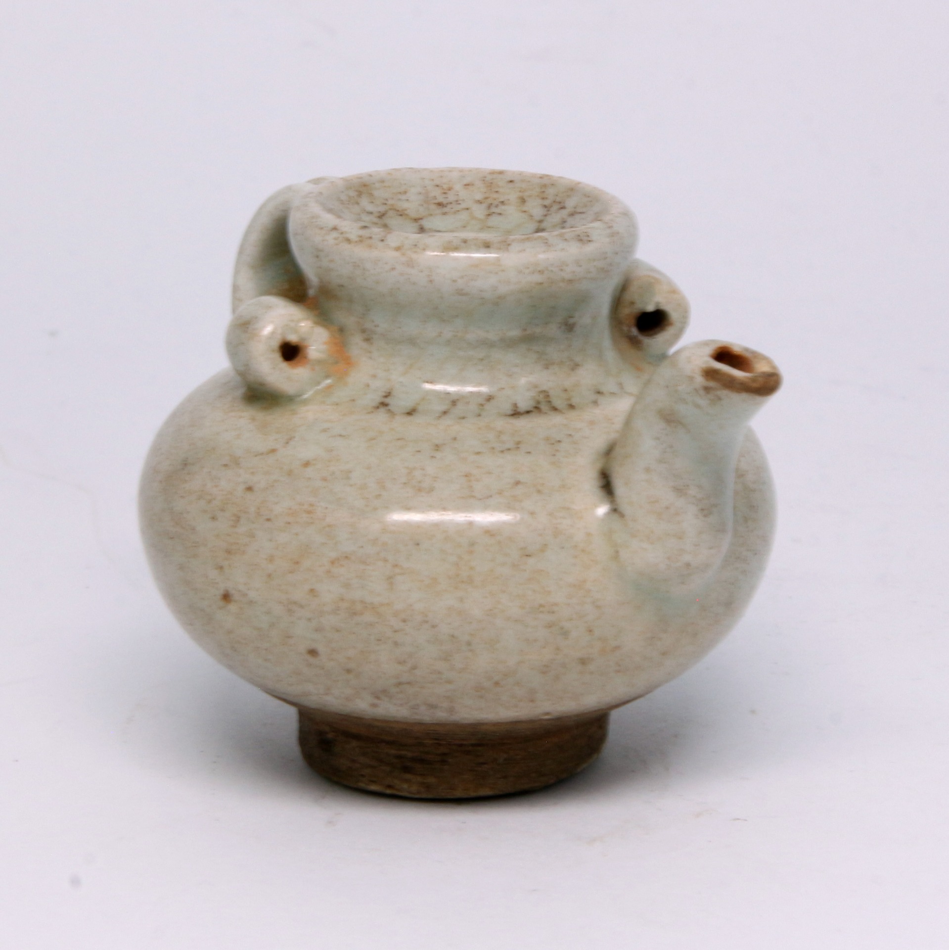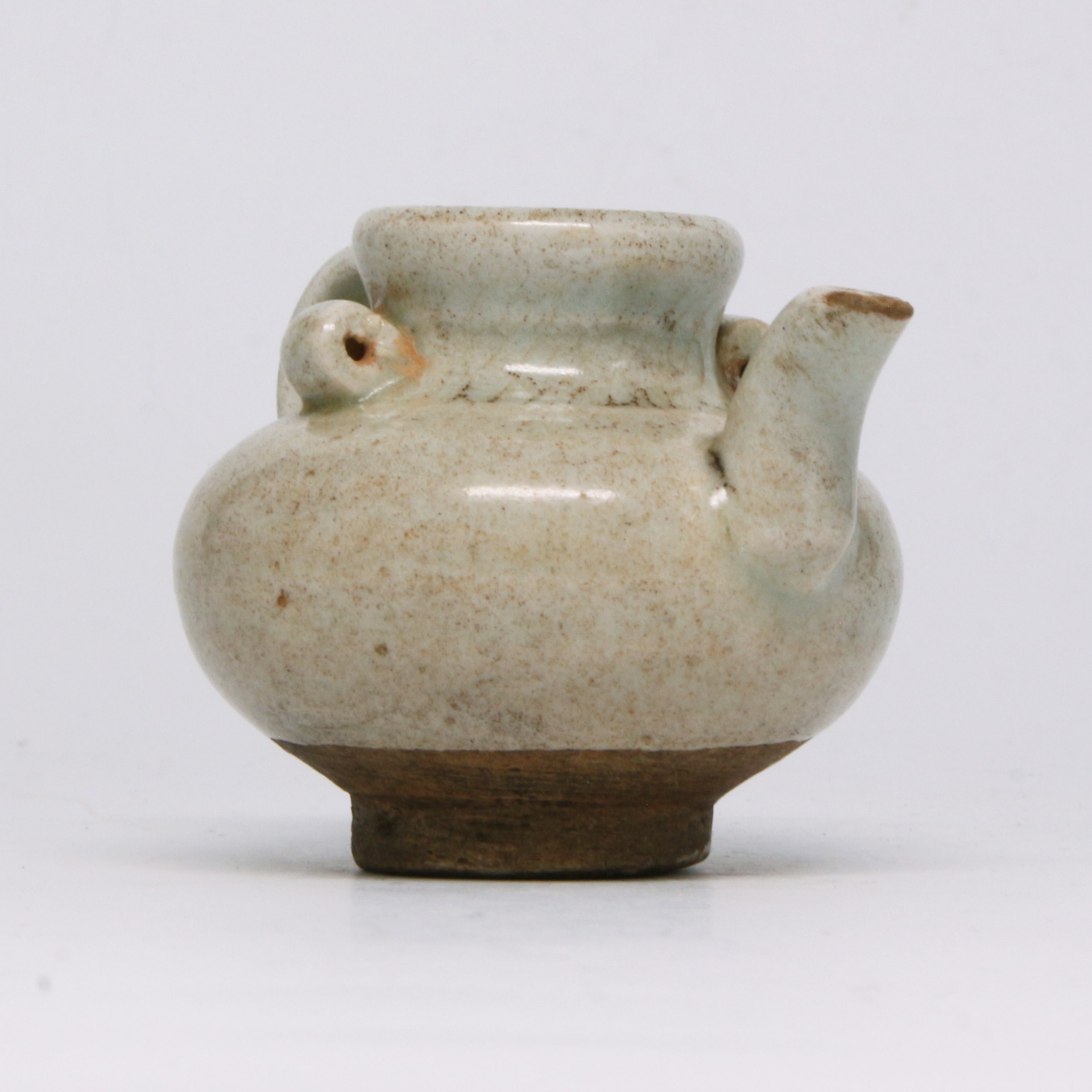 此件青白釉水滴(又稱水注)造型精巧玲瓏,器身呈圓鼓腹,重心下沉,給人穩重之感。其最具特色之處在於其多孔與流嘴設計:器肩兩側帶有圓形小繫孔,前方則伸出一短促有力的流嘴,便於精準控制出水量。全器施以青白釉,釉質晶瑩潤澤,釉層薄處顯白,積釉處則呈現淡淡的湖水綠色。器表散佈著自然的褐色沁點,增添了一種飽經歲月的滄桑古意,展現了宋元時期南方窯口青白瓷的典型風貌。
