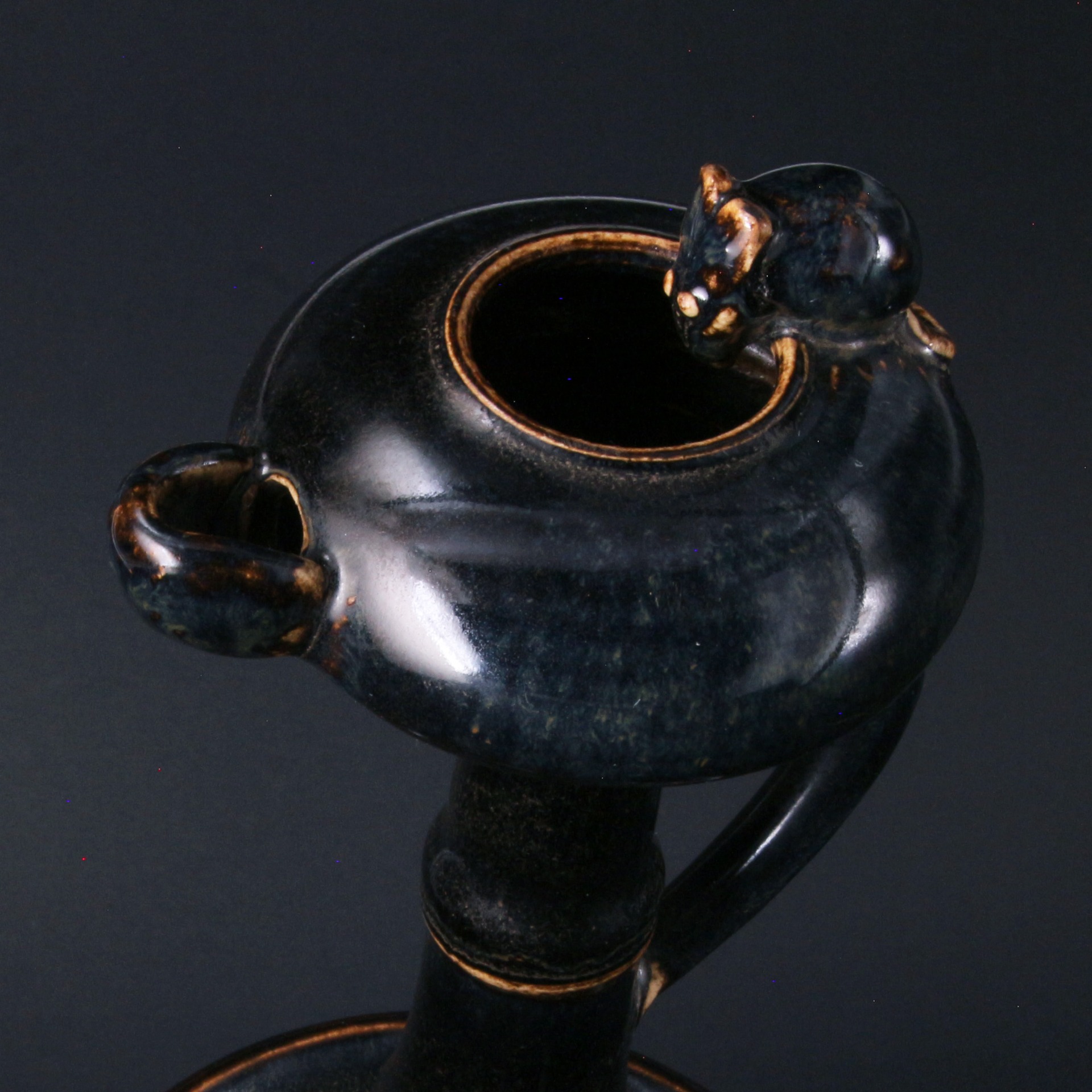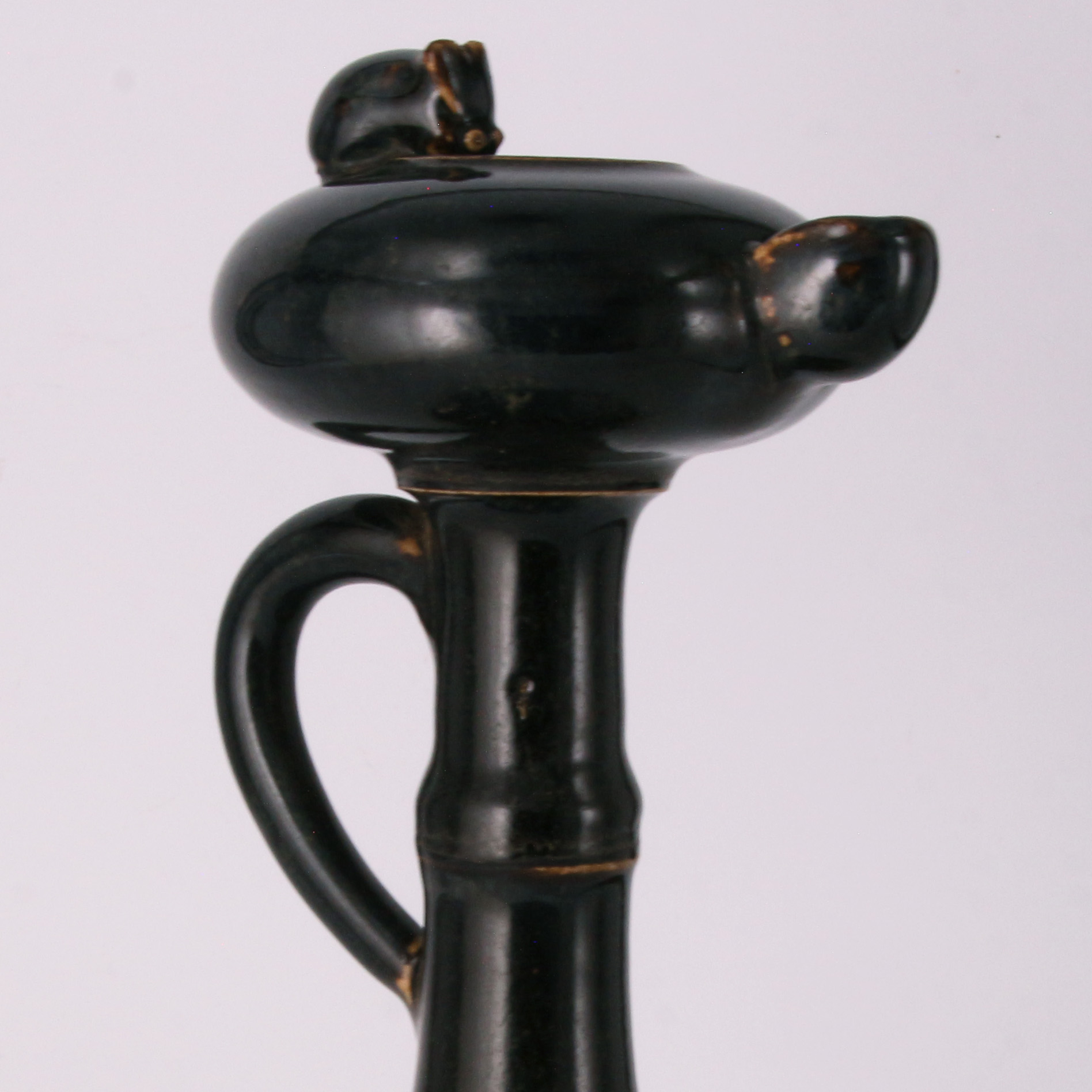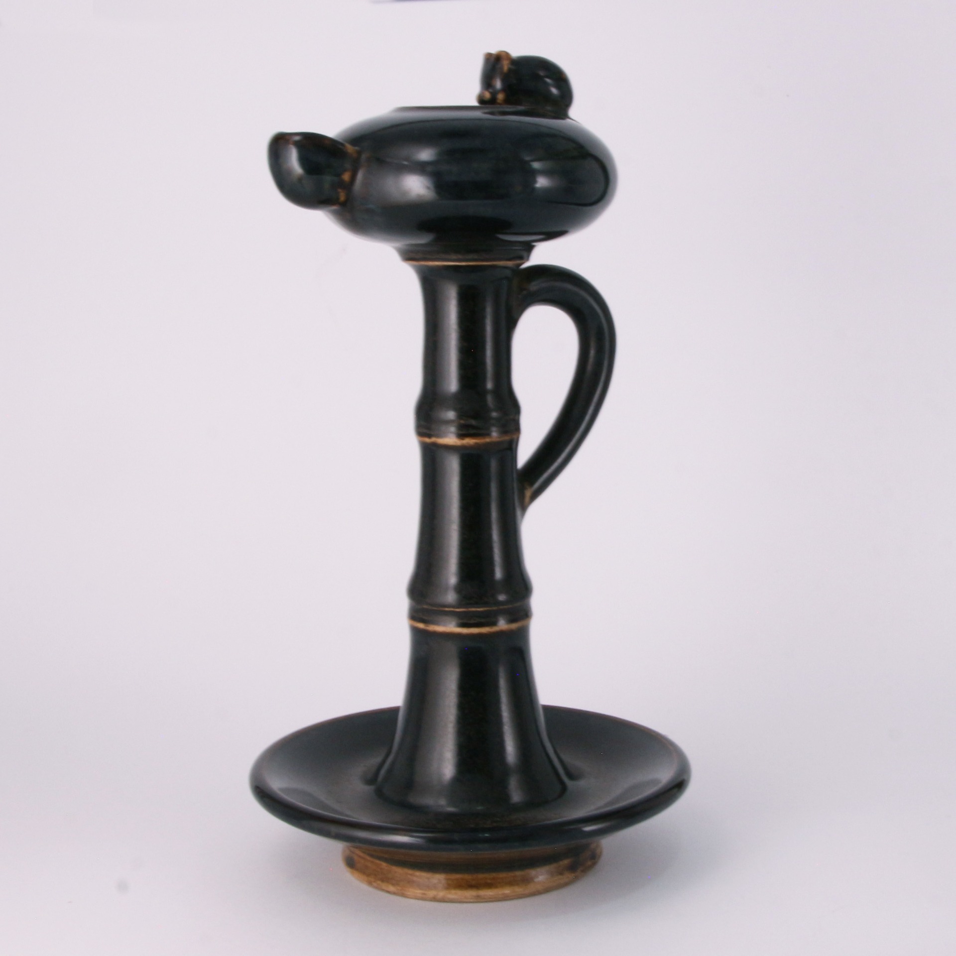 此燈盞通體施以濃郁的黑釉,釉質漆黑光亮,色澤深邃。器型設計獨具匠心,燈柱模擬竹節造型,節間稜線清晰,增強了視覺的節奏感與手持的穩固性。頂端燈盞圓潤,一側帶有傾注或出芯的流口,另一側則飾以生動的小鼠塑像。小鼠俯首於燈沿,姿態機敏傳神,賦予了冷峻黑釉器物一絲活潑的生活氣息。
