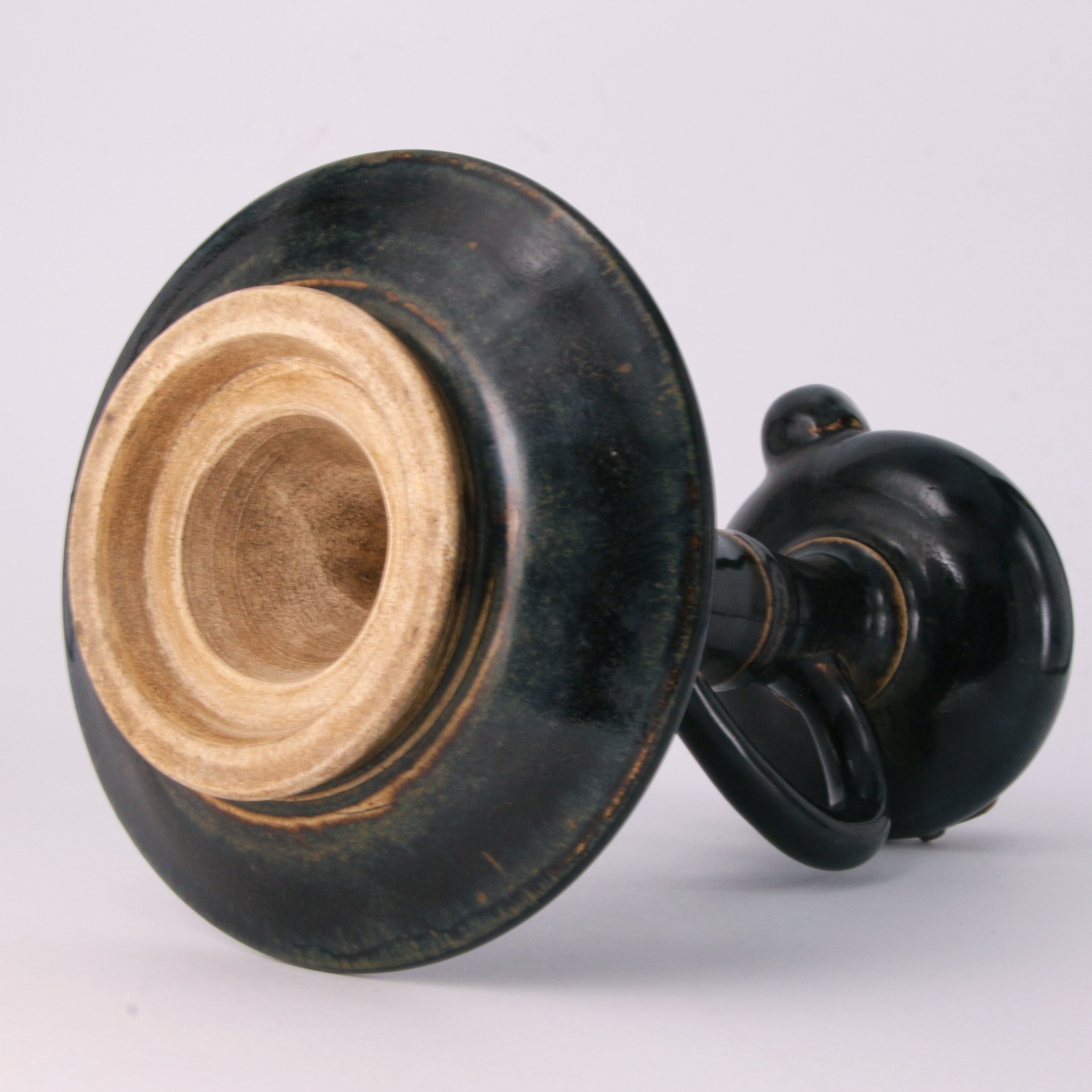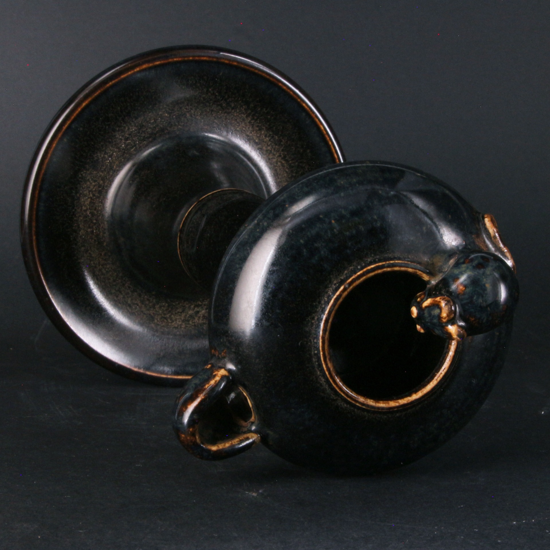 燈台結構分明,上部為承油的燈盞,中部為挺拔的竹節柄,下部則接寬大的圓盤形底座,既能平穩放置,也便於接承滴落的燈油。底足露胎處呈現定窯系特有的堅質細胎,釉與胎接合處線條乾淨利落。竹節象徵「節節高升」或「高風亮節」,而「鼠」在民俗中亦有招財之意,整件作品反映了金代黑釉瓷在造型上的多樣化與對日常雅趣的追求。