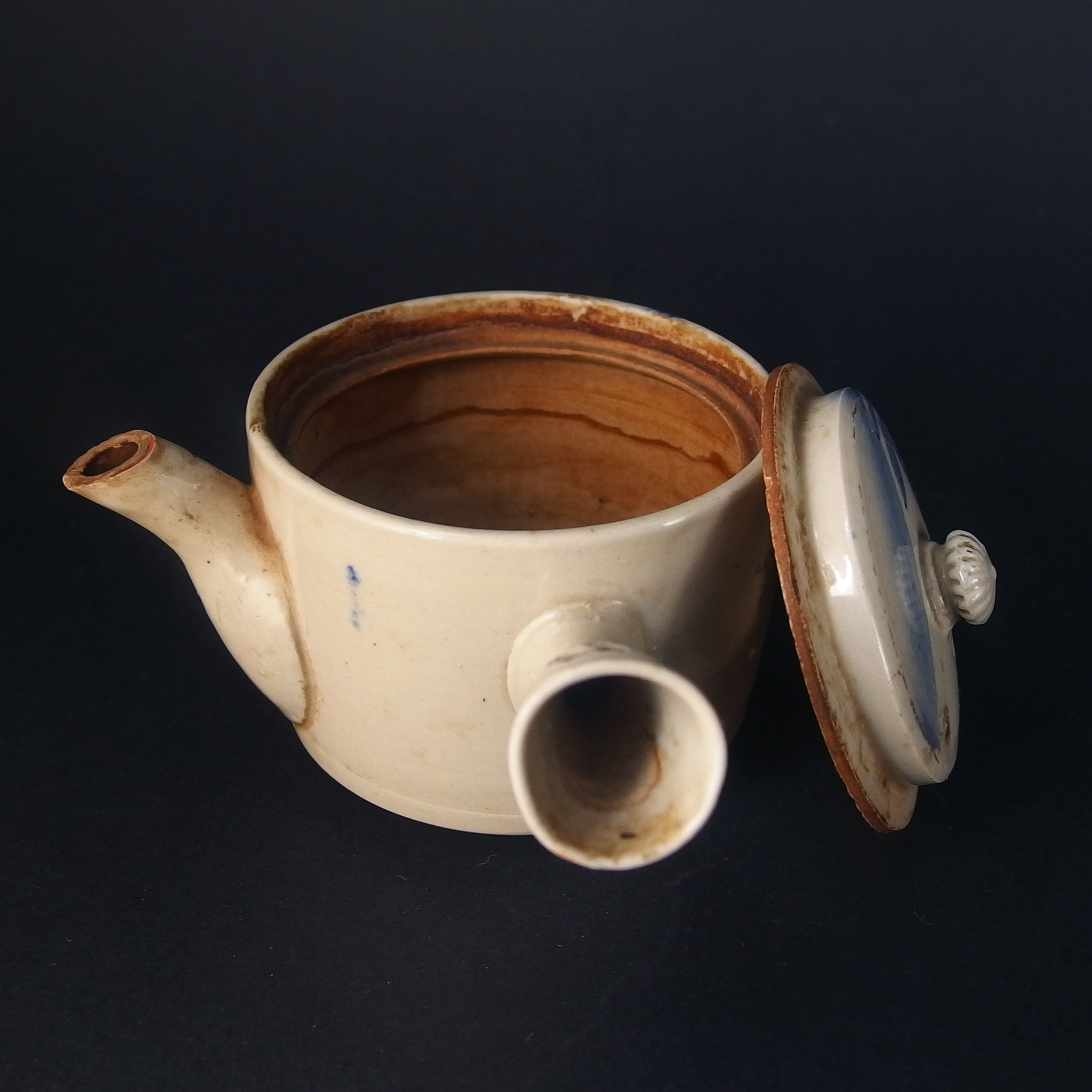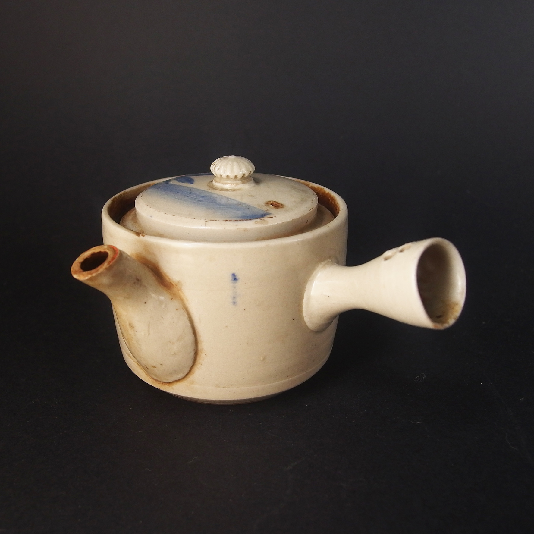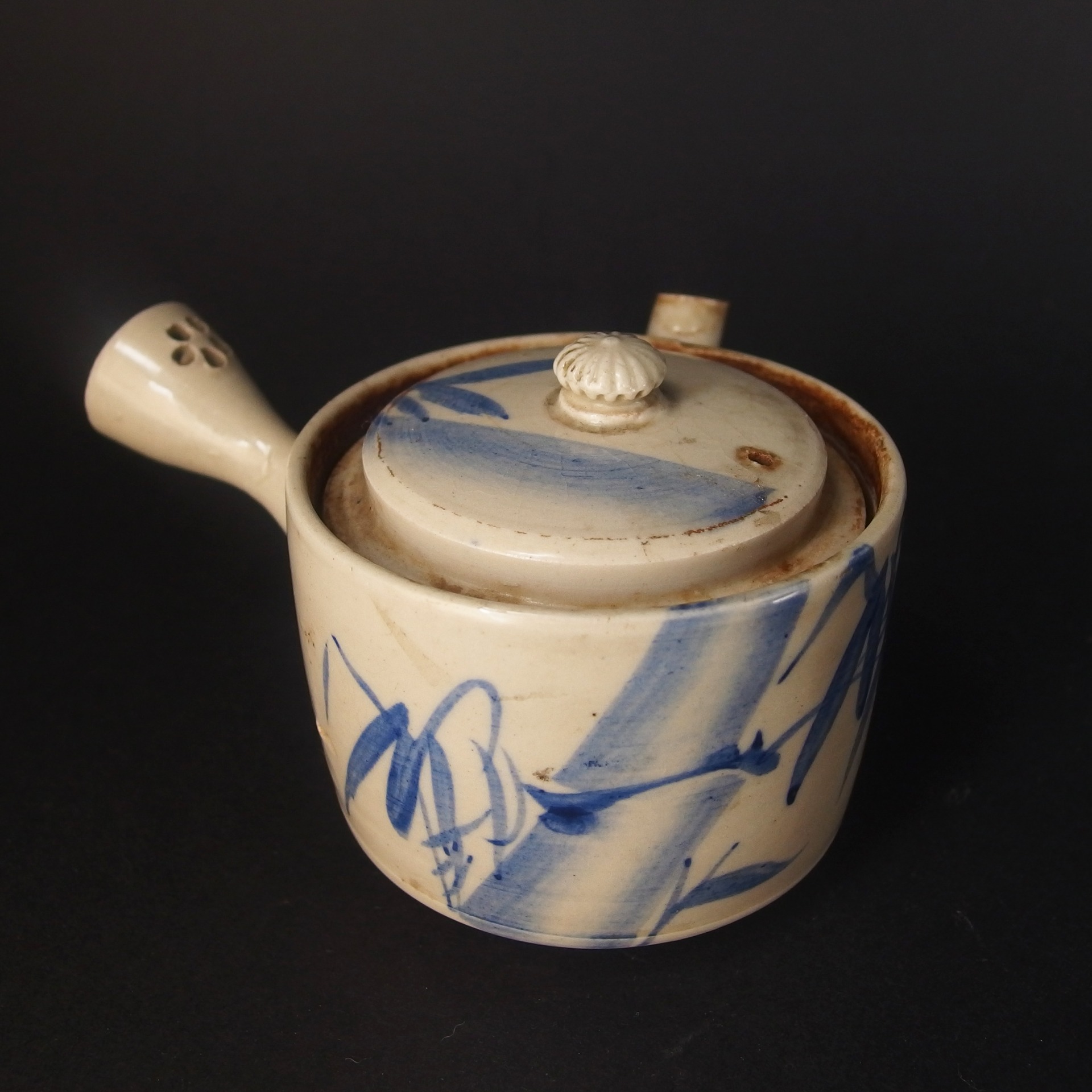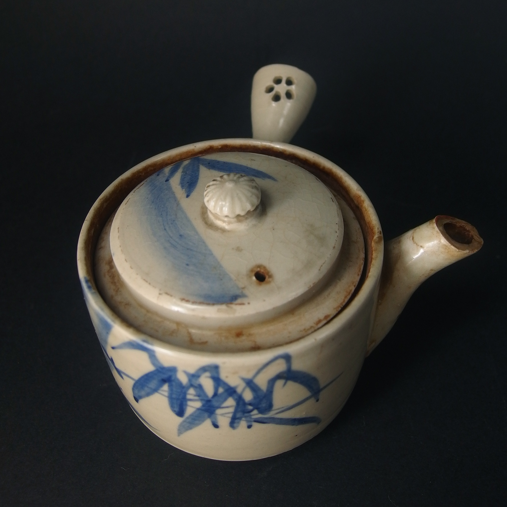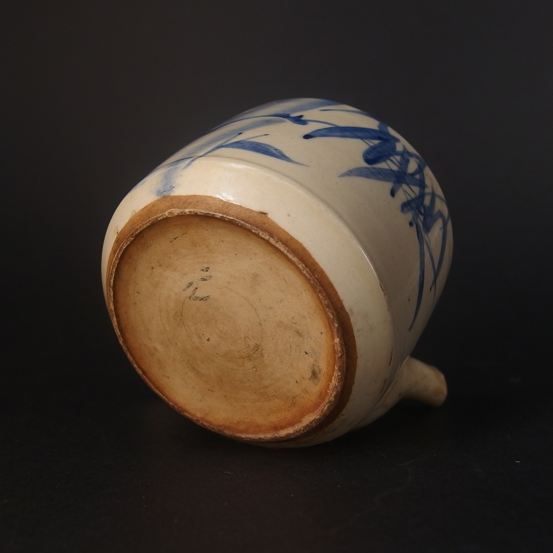 壺形樸厚,胎質略粗,釉面開片隨歲月滲染出溫潤的茶褐痕跡。青花以寥寥數筆勾勒竹葉,筆意瀟灑不飾,留白之間自有風骨。蓋鈕似菊瓣綻放,壺嘴與提梁各具手工氣息,構成一種未經修飾的自然之美。