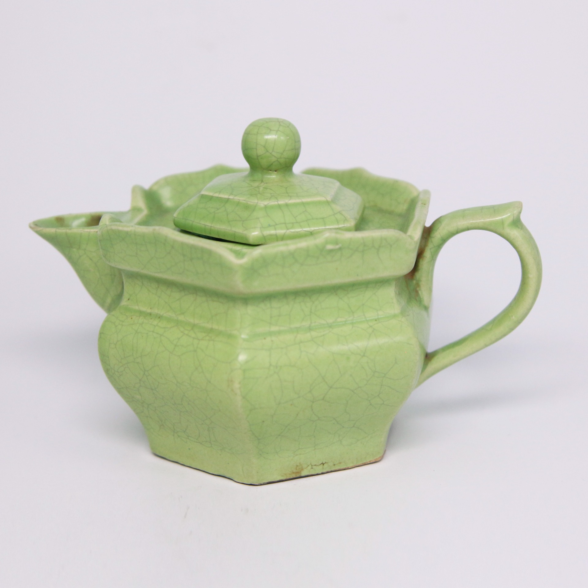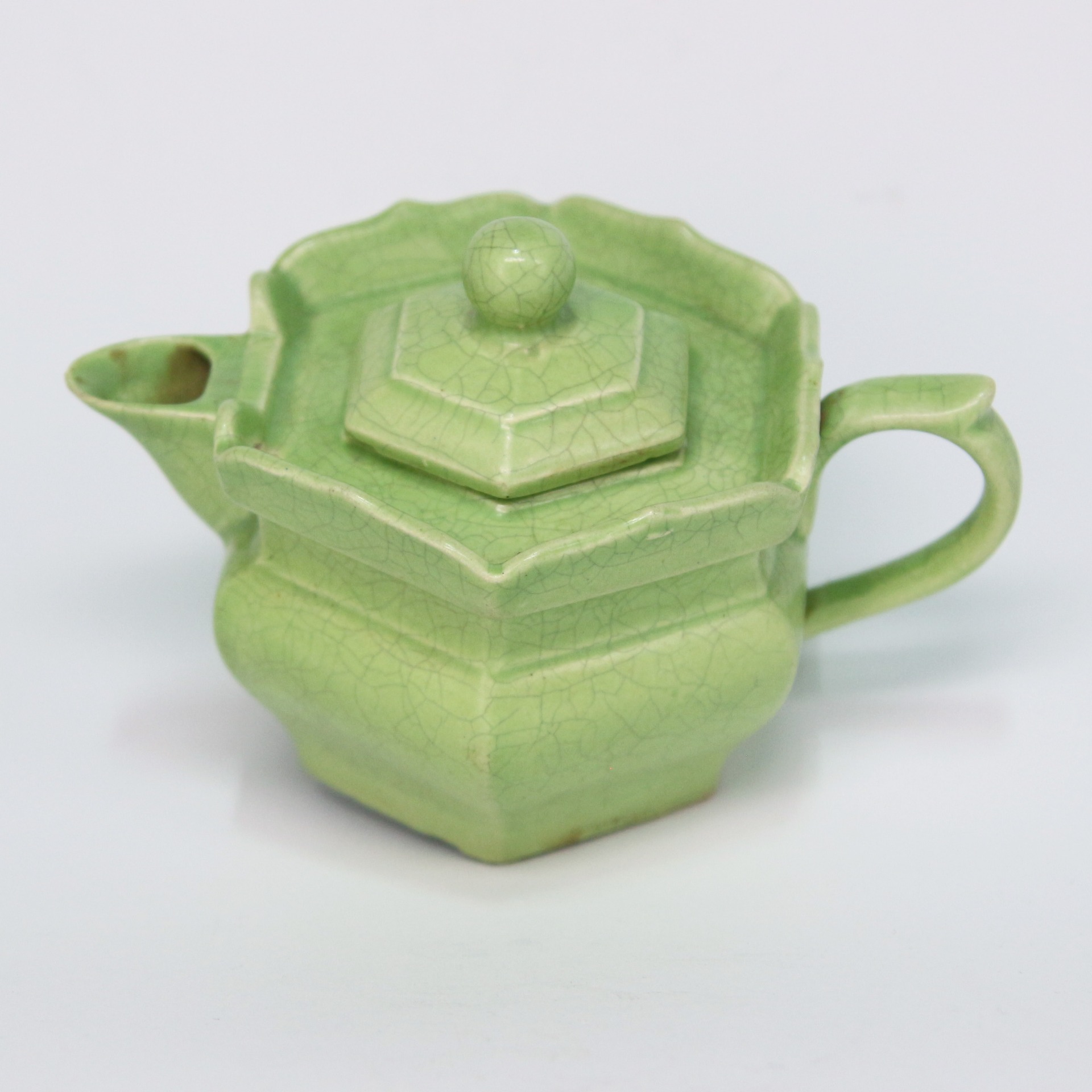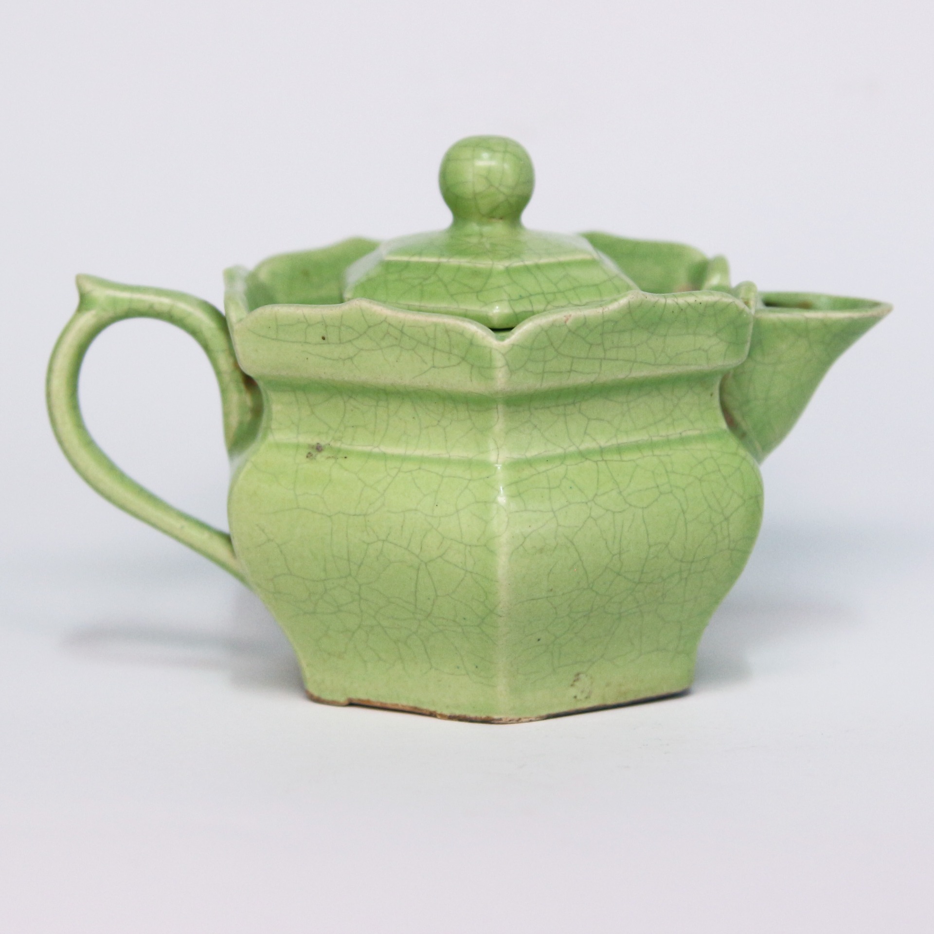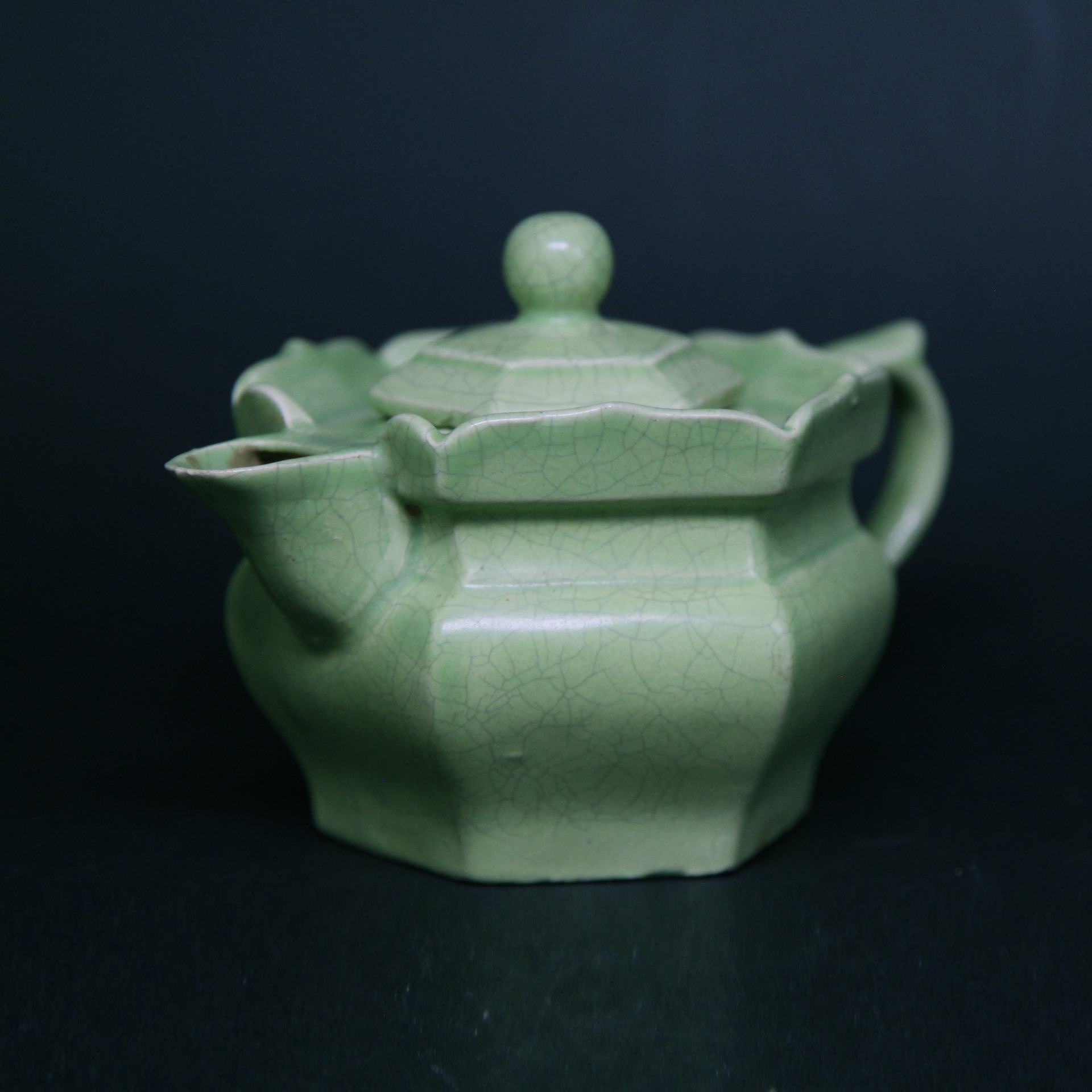 此壺器型獨特,因口沿延伸出如花瓣狀的階梯形邊緣,形似僧侶佩戴的帽子,故名「僧帽壺」。其造型稜角分明,展現出方中藏圓的結構感;蓋部呈多邊形,配以佛球狀壺鈕,與鴨嘴形的流口及寬大厚實的柄把相互呼應。這種設計最初源於北方游牧民族的金屬奶壺,帶有強烈的藏傳佛教色彩與文化融合的特徵。