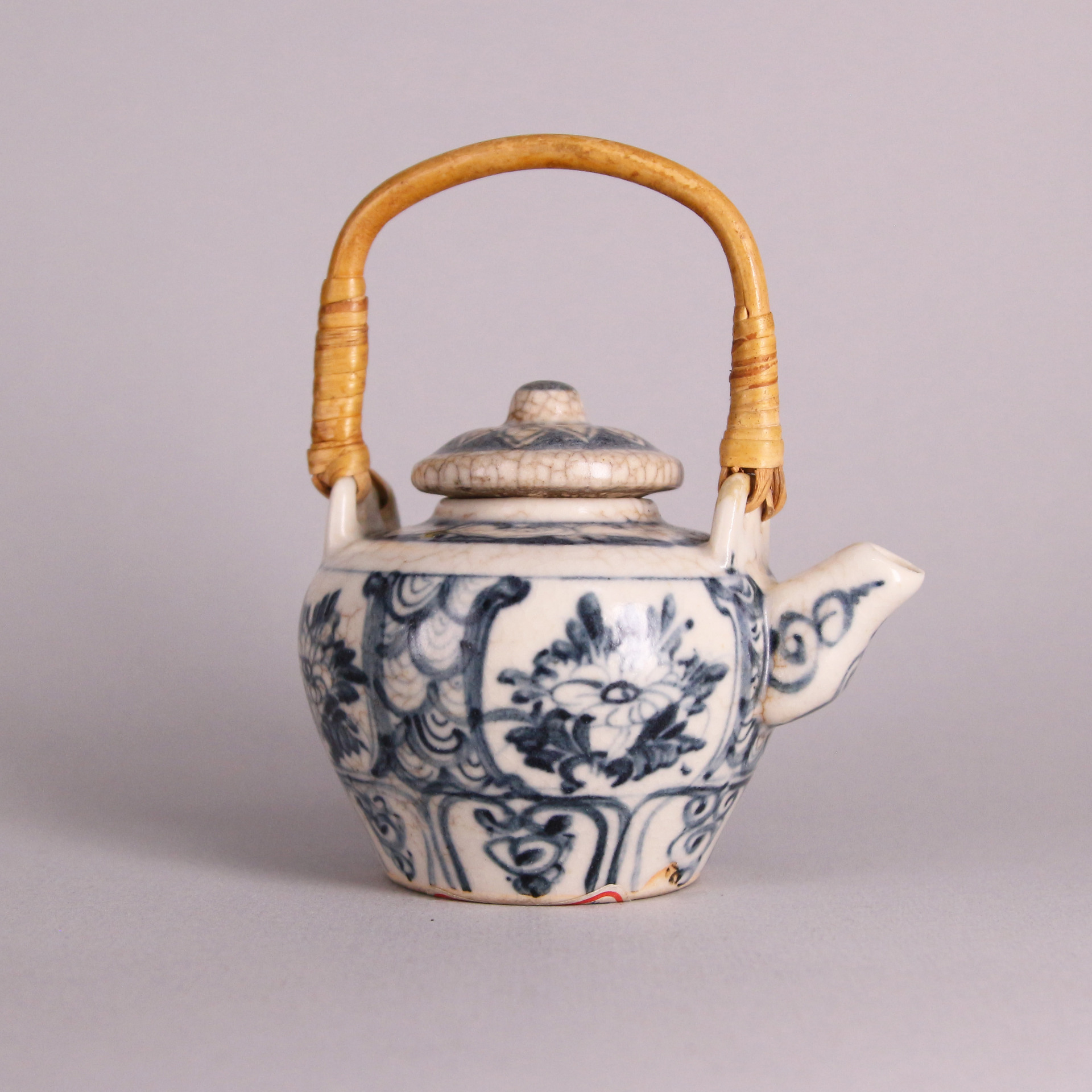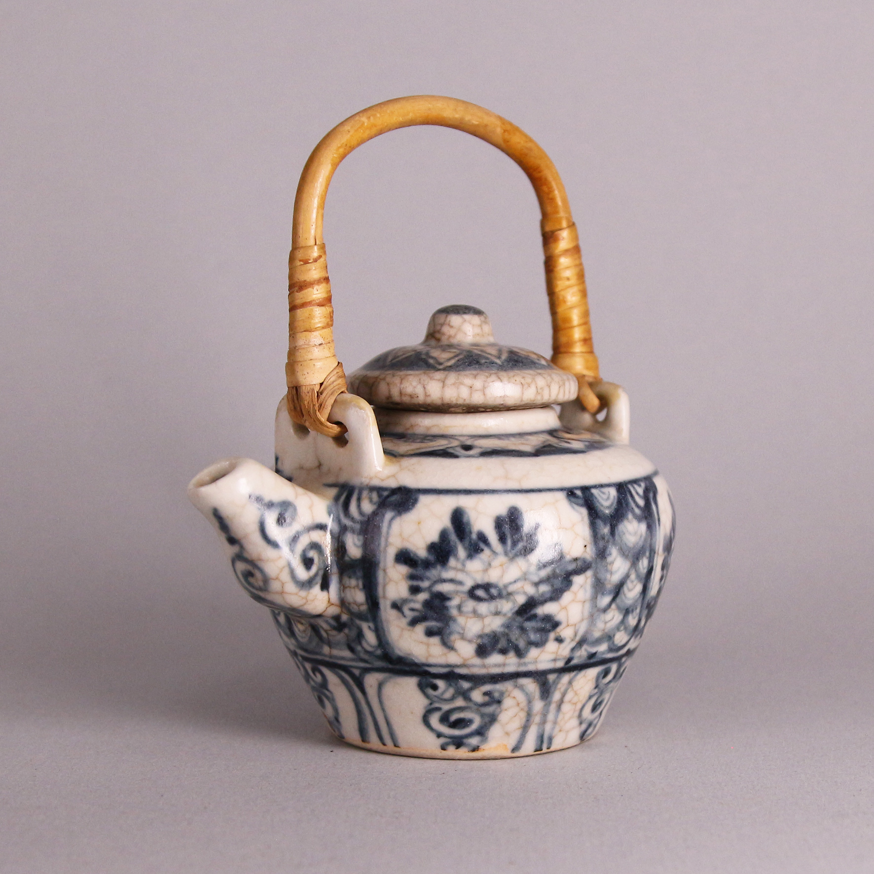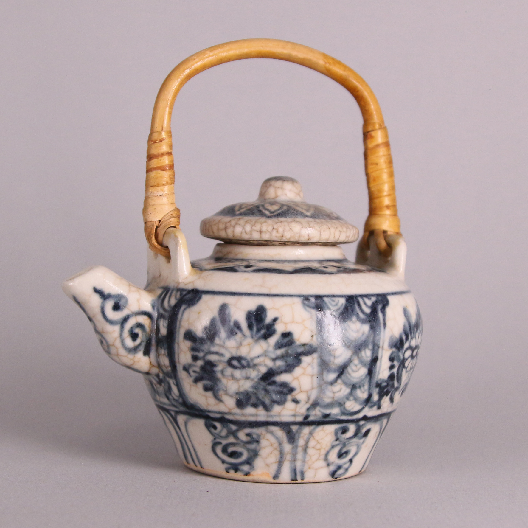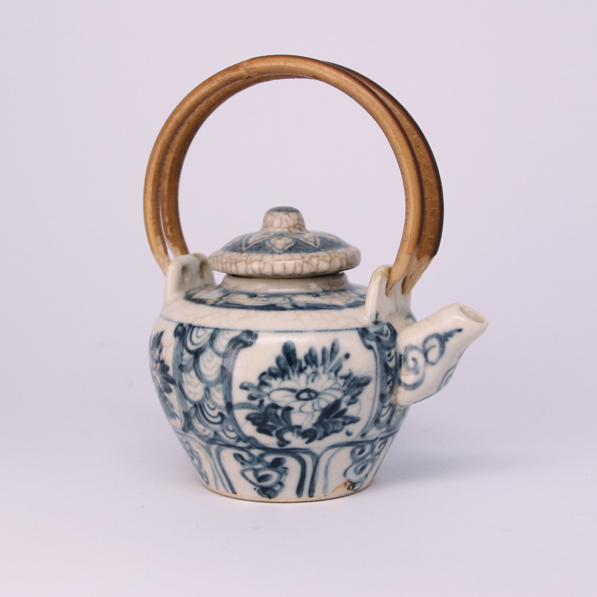 此件青花小壺為明代早期燒製,通體以「蘇麻離青」料繪飾,色澤濃豔明亮,藍中泛紫,具強烈的層次變化。壺體圓潤敦厚,短頸、直流、雙耳上繫竹編提梁是因腐朽而由近代後製。壺身以花卉紋為主題,構圖嚴謹、筆意流暢,釉面佈滿自然開片,顯現歲月溫潤之痕。