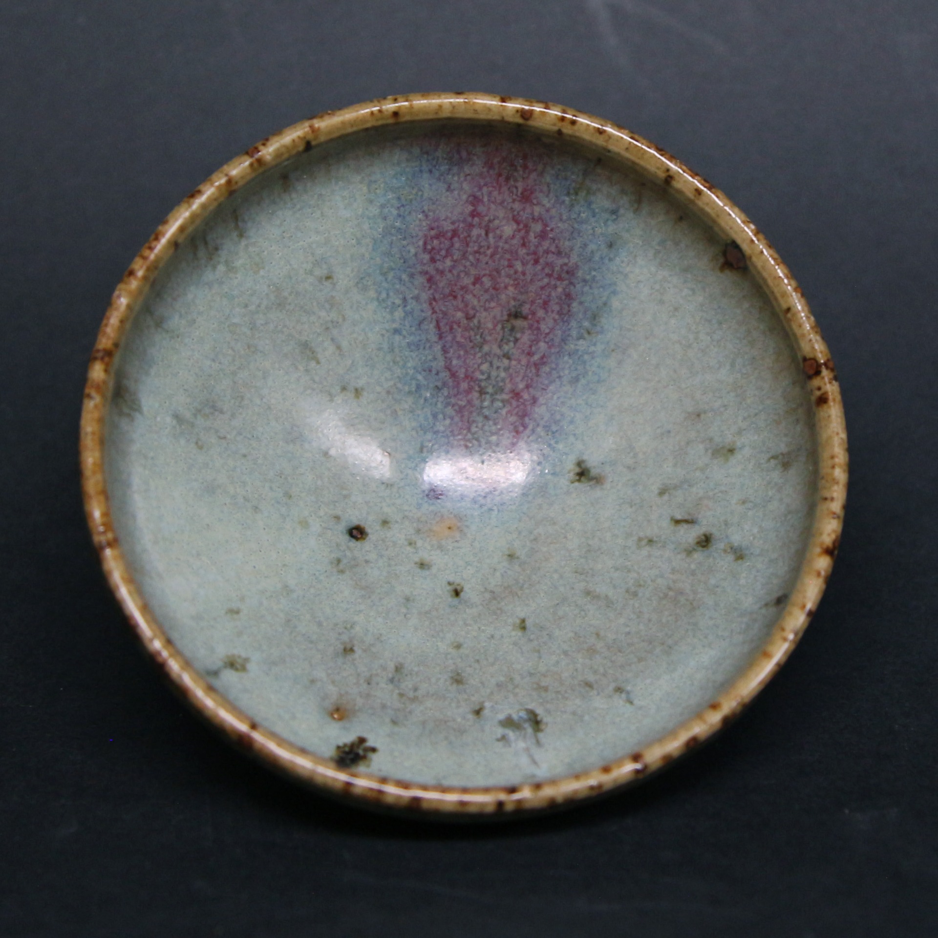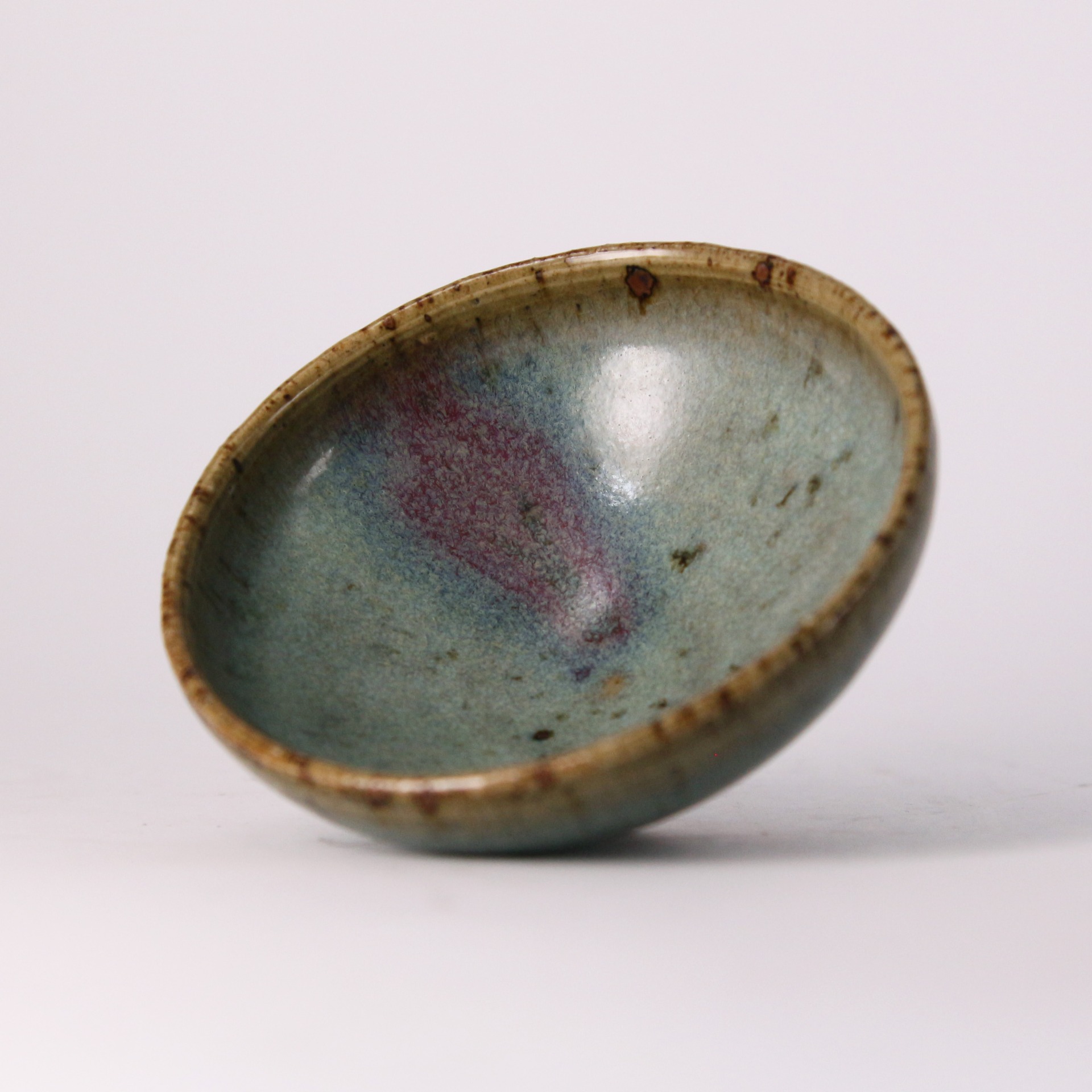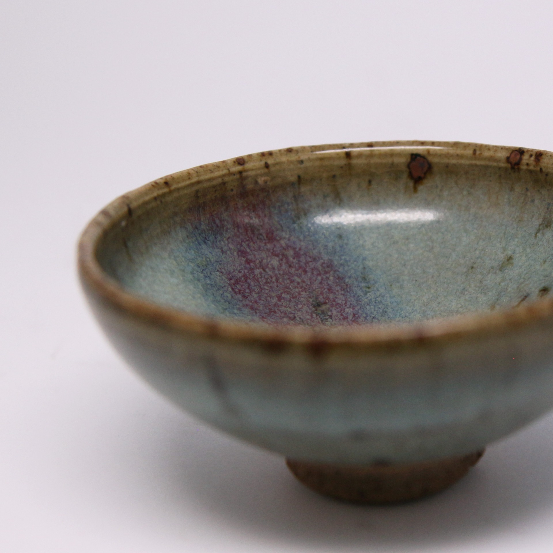 鈞窯以「入窯一色,出窯萬彩」著稱,元代作品尤重釉色表現與偶然之美,突破宋代對器形規整的嚴謹要求,轉而強調視覺張力與個性化風格。掛紅釉斑在茶盞中尤為少見,使其兼具實用與鑑賞價值。此器不僅反映元代飲茶文化的延續,也體現鈞瓷以窯變為美、順應自然的審美精神,為中國陶瓷史上極具代表性的藝術表現之一。