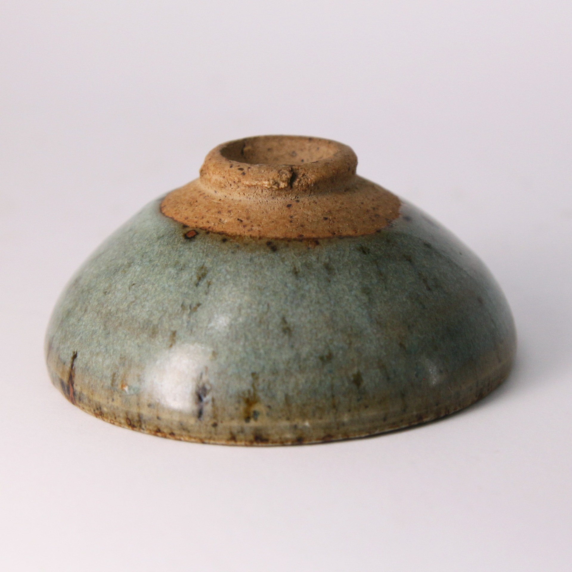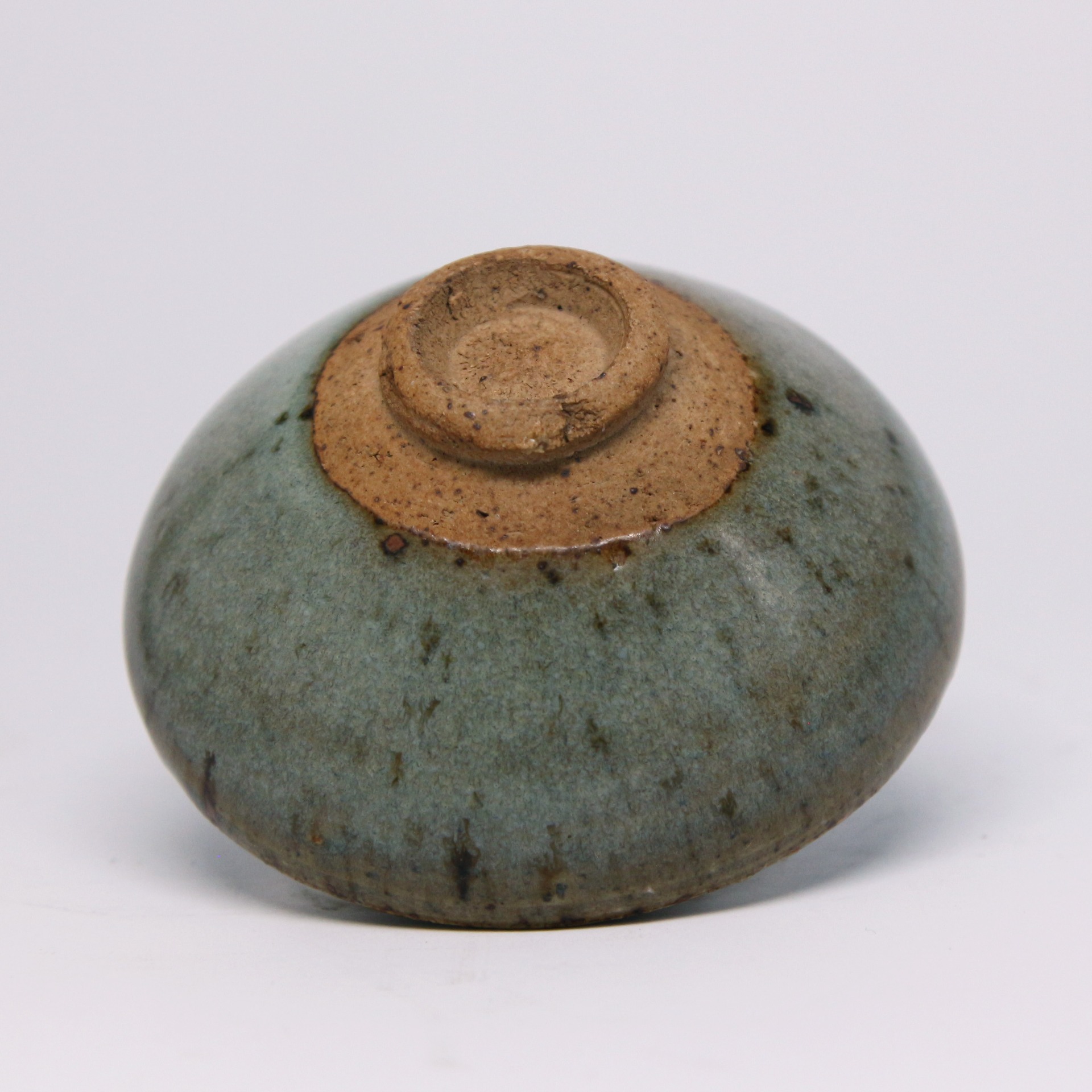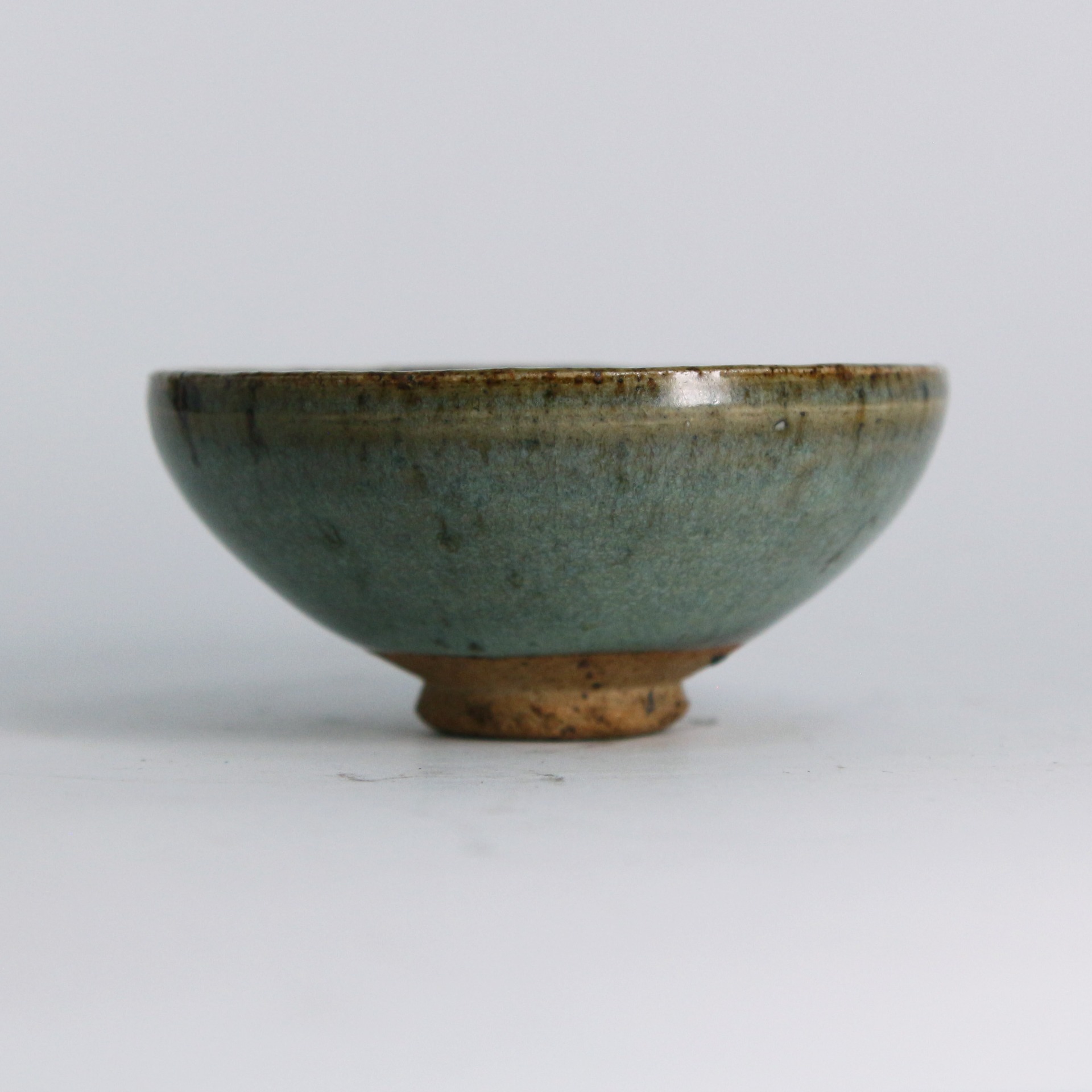 此件元代鈞窯茶盞,敞口微斂,弧腹渾厚,下承小圈足,造型穩健而富張力。通體施天青至藍綠色釉,釉層肥厚瑩潤,口沿與內壁可見自然垂落的紫紅色釉斑,俗稱「掛紅」,為鈞窯高溫還原氣氛下偶發而成的珍稀窯變效果。藍與紅於釉面交融滲化,如雲氣流動,呈現不可複製的自然美感。