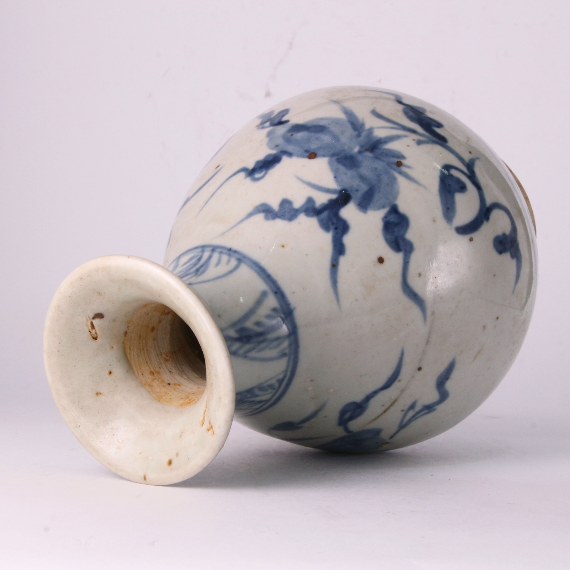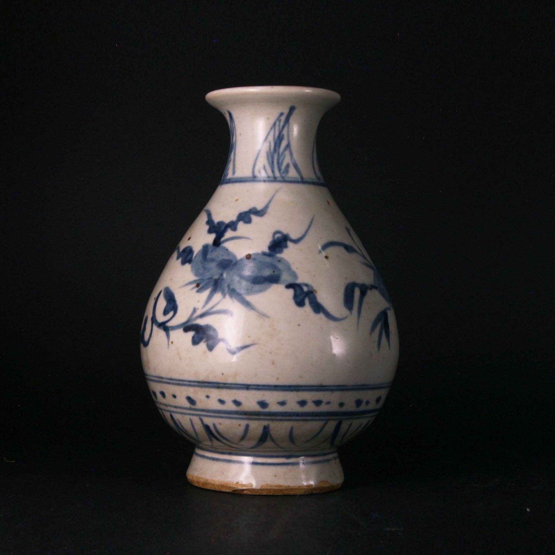 此玉壺春瓶撇口、細頸、垂腹,造型玲瓏秀美,展現元代瓷器挺拔而不失圓潤的體態。其裝飾靈魂在於腹部主體的桃樹紋飾,採用了元青花典型的**「一筆點畫」**技法——畫工不經勾勒填色,而是以飽蘸青料的筆觸直接在胎體上揮灑,一氣呵成。這種技法使葉片與果實呈現出深淺不一的料暈層次,線條自然流暢且極具書法張力,充分體現了元代匠人率真、豪放的藝術性格。