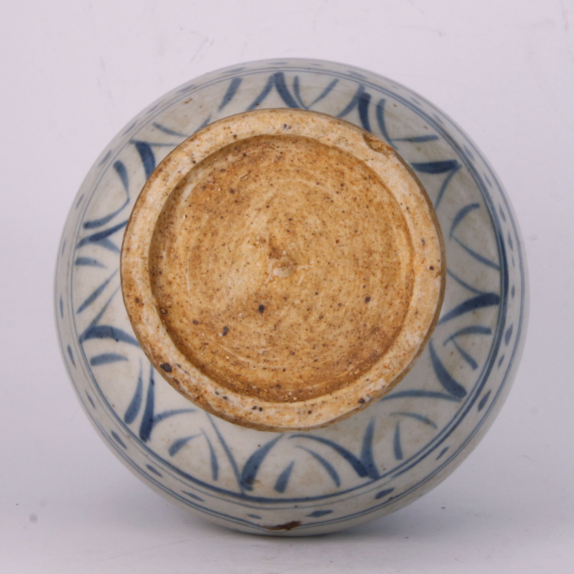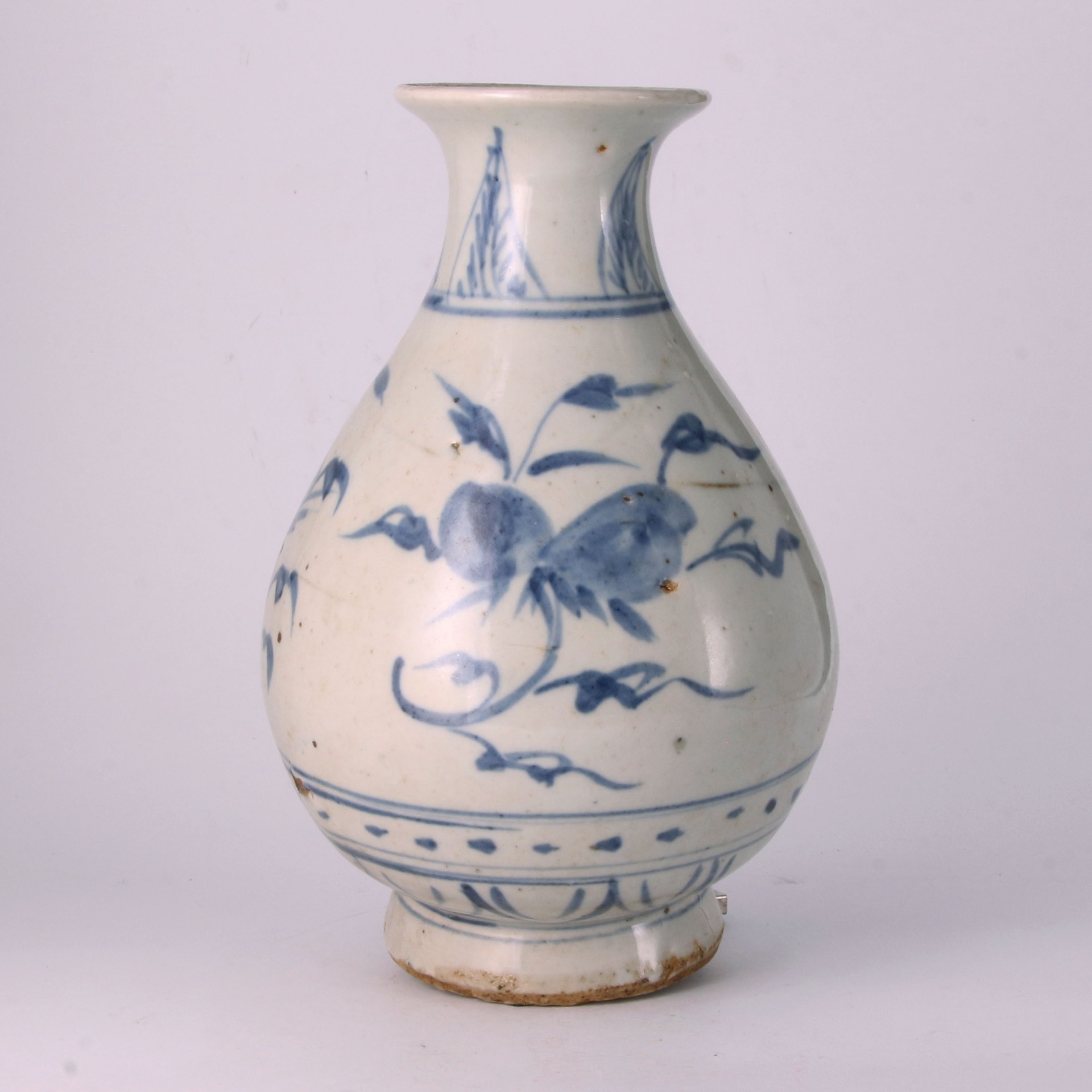 器身釉面呈現微青的卵白色,與濃淡相宜的青花發色相映成趣。除主題桃樹紋外,頸部飾以簡練的蕉葉紋,近足處則輔以元代常見的蓮瓣紋或圓圈紋,構圖疏朗,層次分明。全器胎質乾老、器底露胎處可見火石紅現象,盡顯時代特徵。其「一筆點畫」所勾勒出的桃實形象,不僅富有立體感,更寄寓了長壽吉祥的深厚內涵,是元代民窯青花中兼具工藝美感與文人畫意的代表之作。