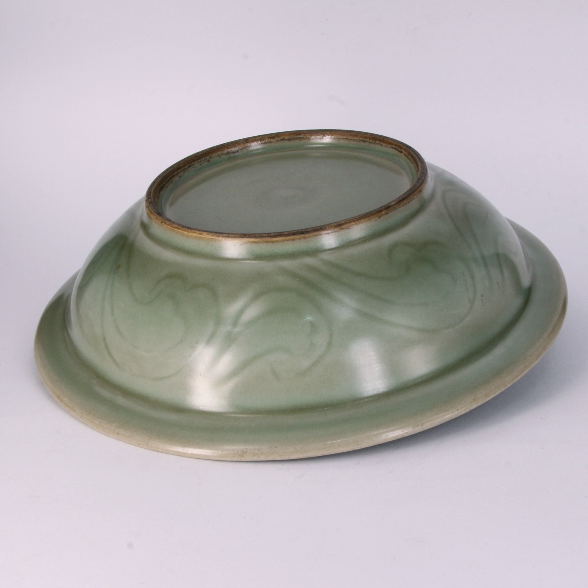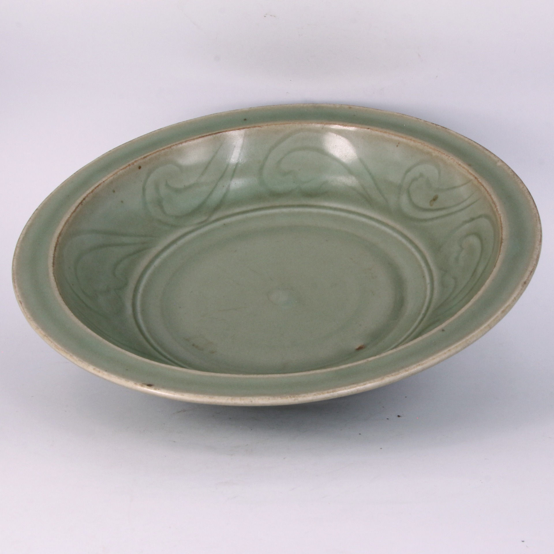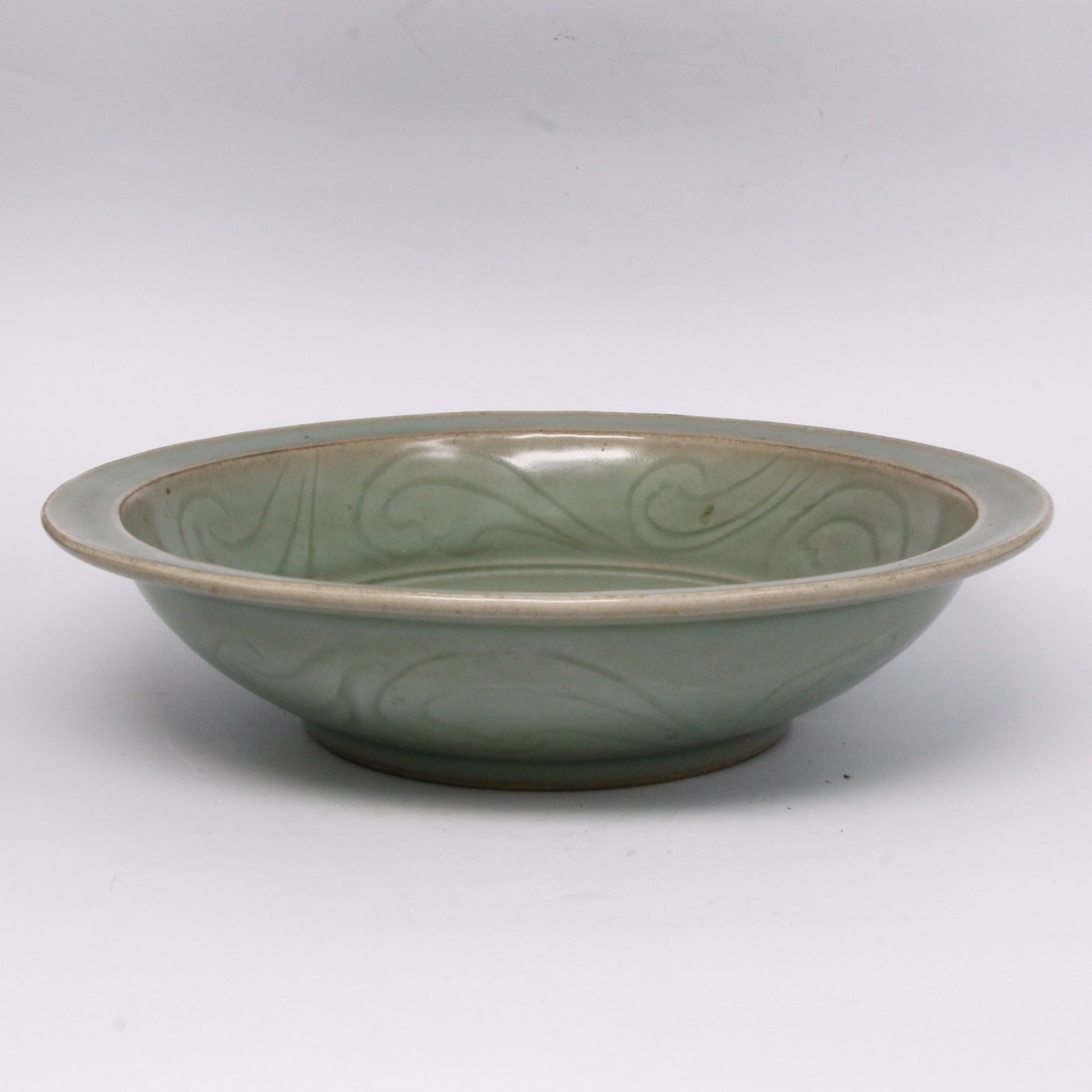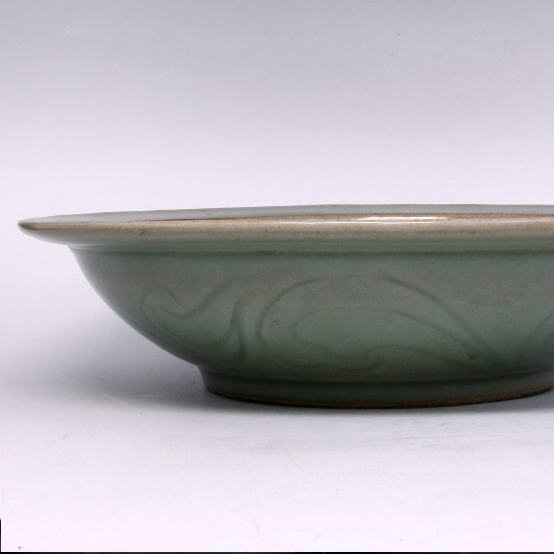 元代龍泉窯瓷器在延續宋代審美傳統的基礎上,更因應當時蓬勃的貿易需求,發展出更具裝飾意趣與實用性的風格。此件折沿盤不僅具備了堅實耐用的物理特質,其內壁印刻的花卉紋樣布局嚴謹,隨盤壁弧線舒展,富有流動的韻律美,將青瓷的靜謐與印花的動勢完美融合。作為元代社會生活中常見的實用重器,此盤既能滿足日常陳設之用,亦兼具了文人雅士對古雅器物的鑑賞需求,是研究元代龍泉窯生產規模與審美風尚的重要實物,極具收藏價值。