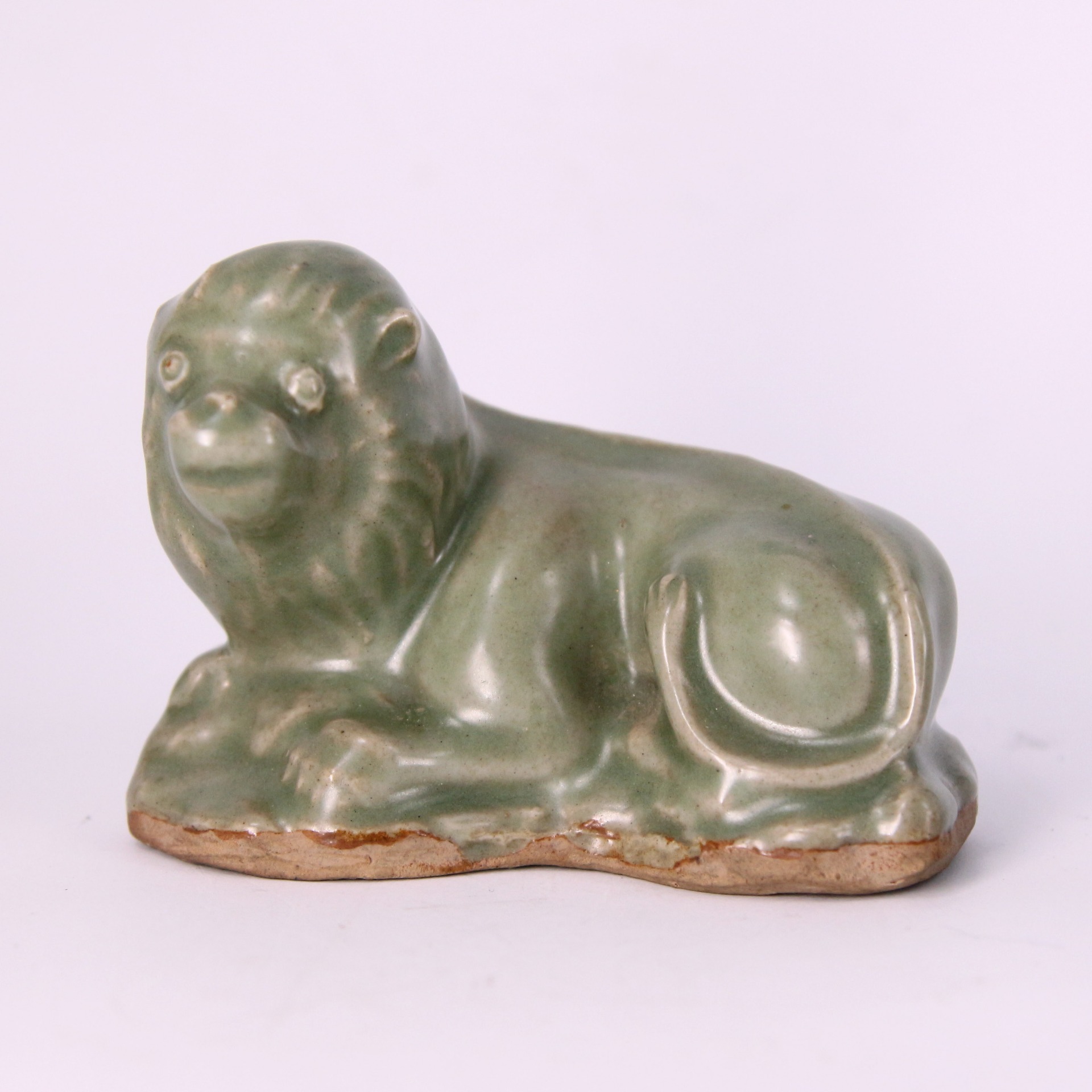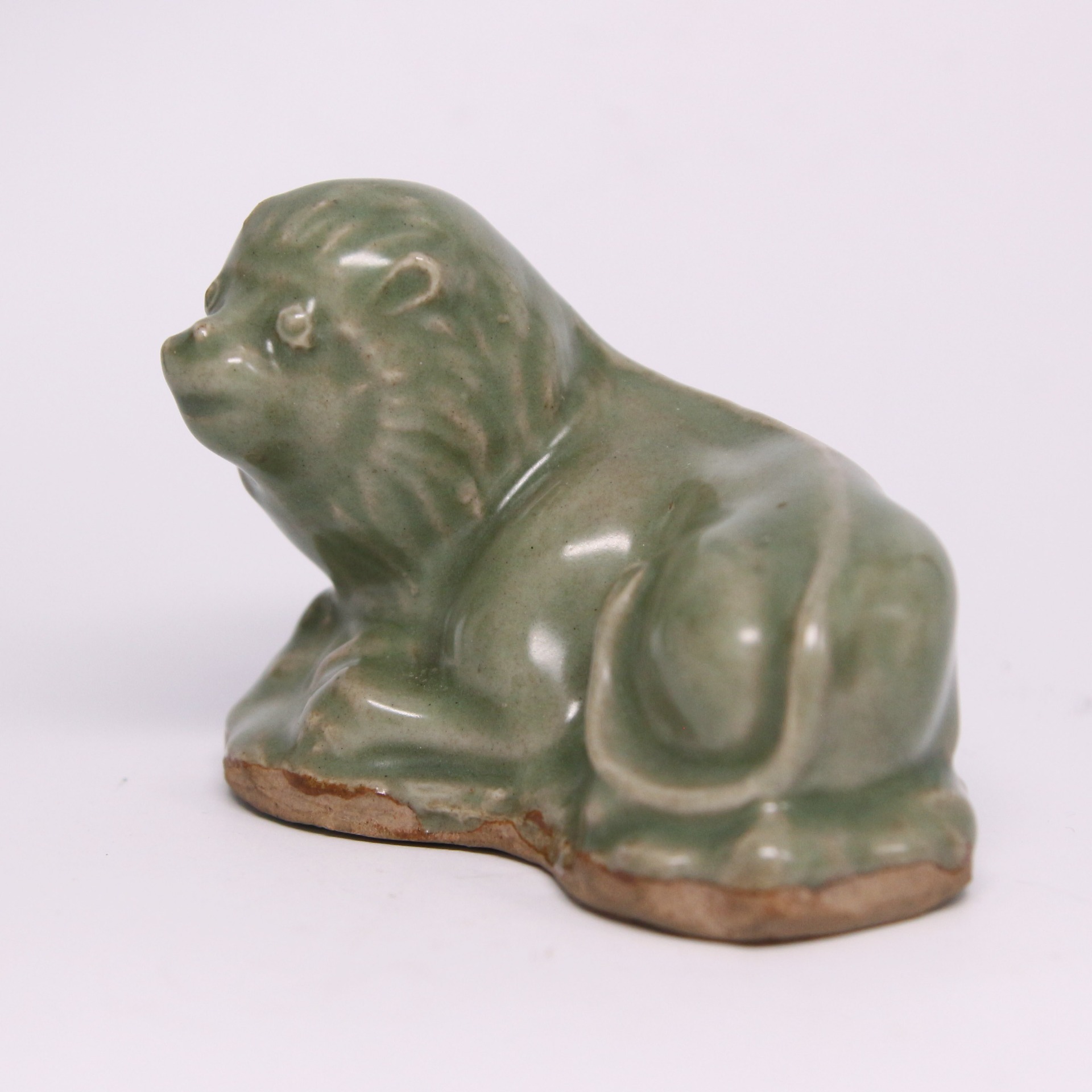 此器通體施以龍泉窯經典的青釉,釉質滋潤肥厚,色澤呈現典雅的青綠色。釉面隨獅子的肌理起伏而產生深淺變化:在鬃毛與肢體轉折的刻劃處,釉層堆積使顏色顯得青翠深邃;而在突起部分則因釉薄而透出淡淡的胎色,形成了豐富的視覺層次。底部的露胎處可見堅硬的胎質與火石紅現象,充分展現了元代龍泉窯外銷巔峰時期的工藝水準與厚重的時代美感。