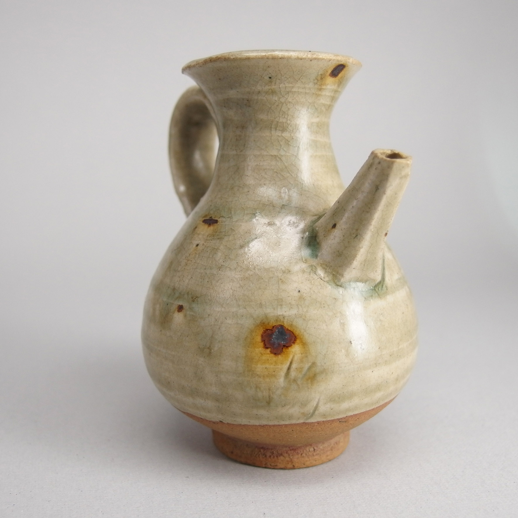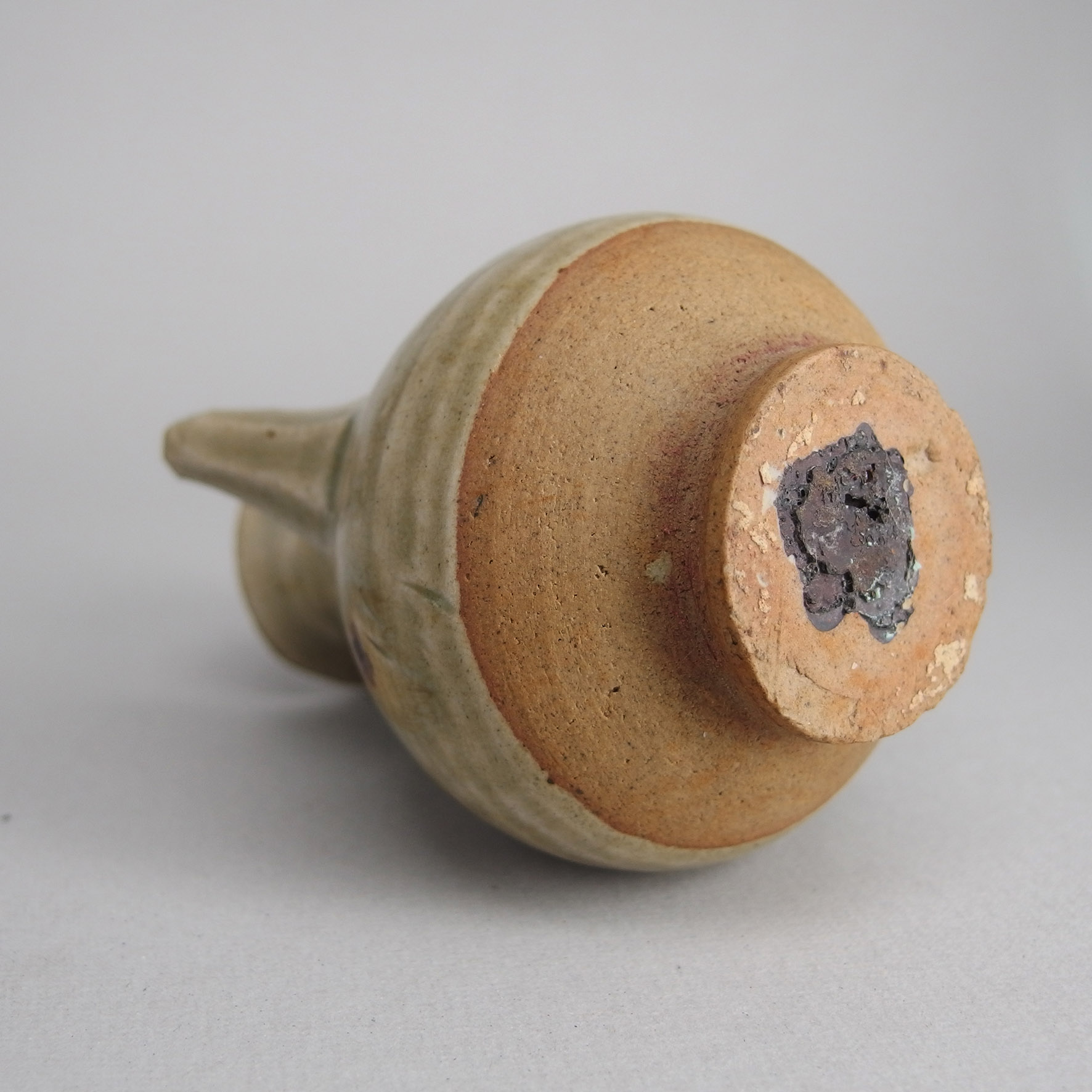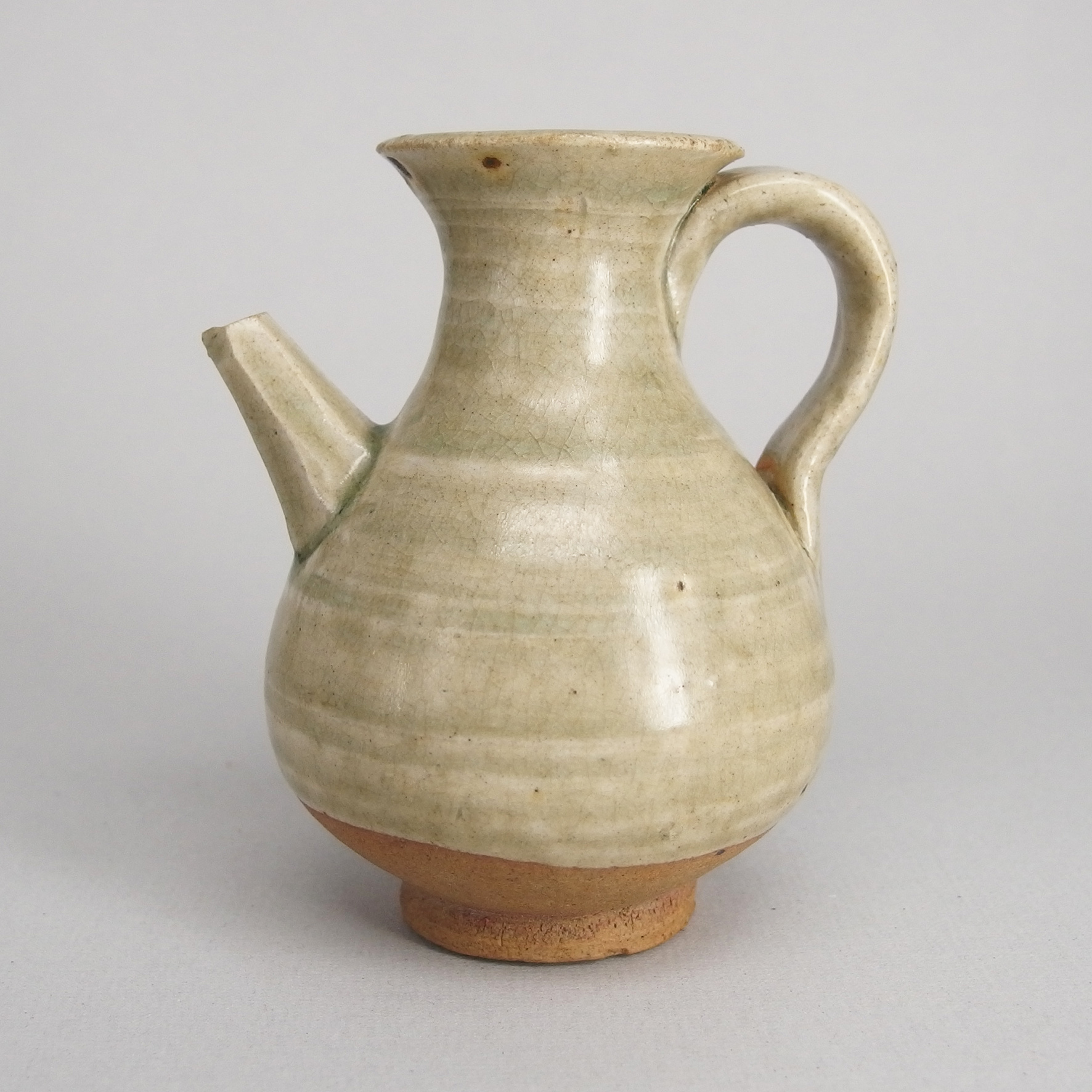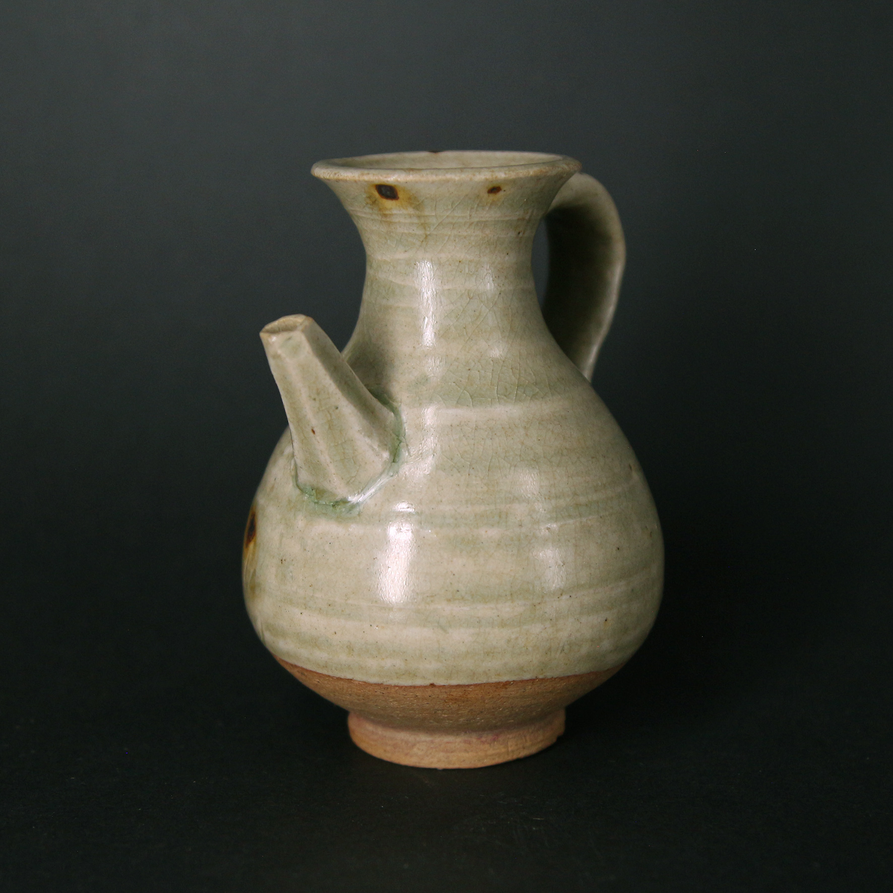 這件唐代秘色瓷小壺,通體施青釉,色澤柔潤如玉,釉面開片自然,散發出歲月的溫潤光澤。壺體線條圓潤飽滿,短流斜出,口沿外撇,造型樸實而富韻致。秘色瓷為越窯系名品,以「青如天、明如鏡、薄如紙、聲如磬」著稱,此器即具其典雅之神韻,壺嘴仿青銅器造型,秘色窯出土有同款(附圖)。