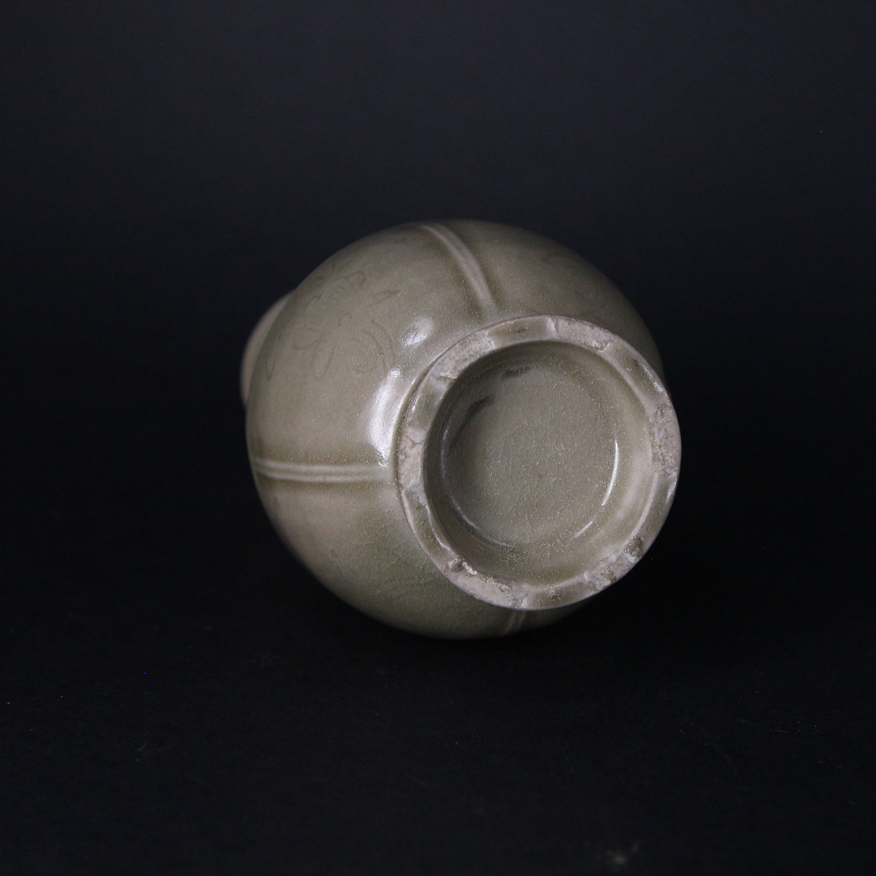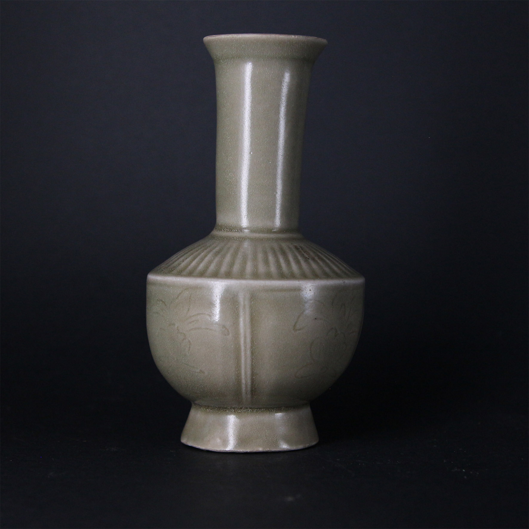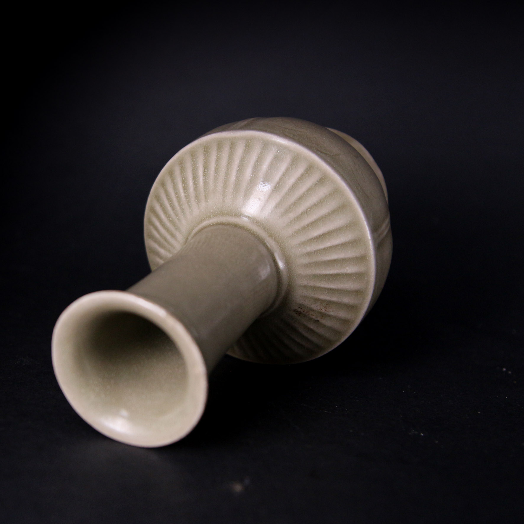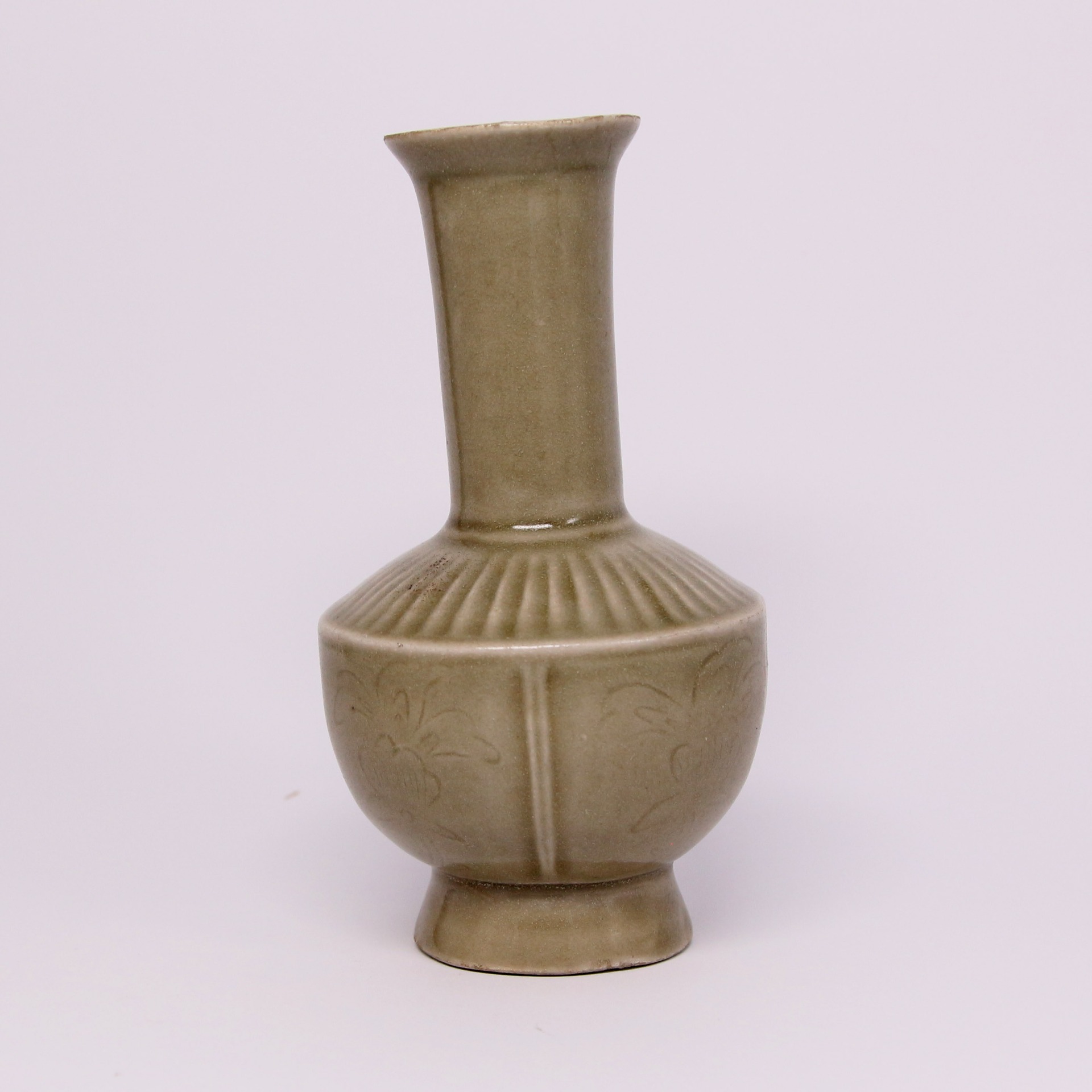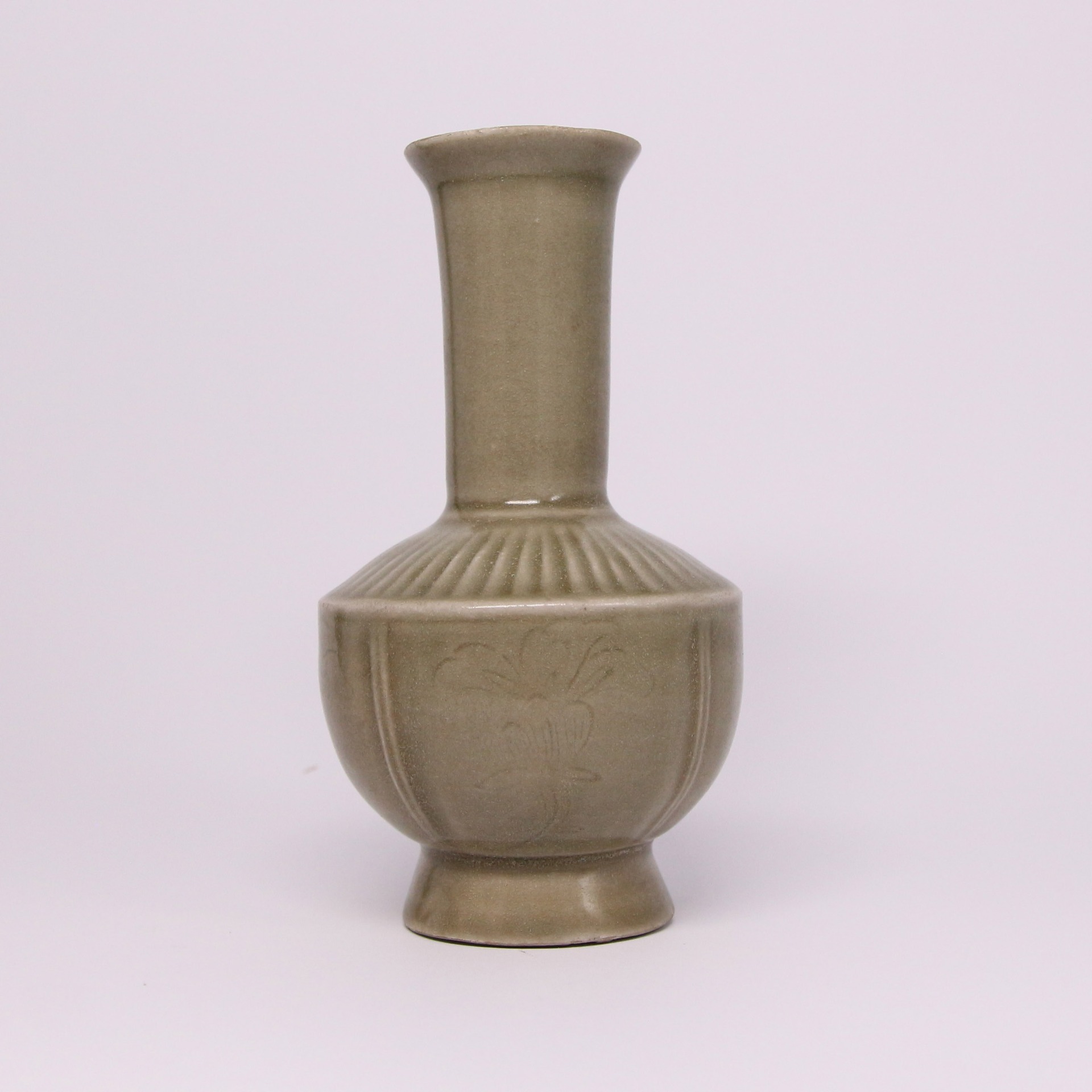 這件青瓷瓶在造型上具有唐代中晚期越窯的典型特徵。它為長頸、鼓腹、圈足的器型,線條流暢優美。其裝飾工藝採用了劃花(或稱刻花)技法,在瓶身下半部劃刻有花卉紋飾(如蓮花或牡丹等),圖案清晰簡練。瓶腹上半部和頸部則飾有直棱紋,與下部的劃花形成對比,增添了層次感。通體施青釉,釉色呈現出越窯秘色瓷特有的溫潤青灰或青黃色調,釉面光潔,體現了唐代越窯製瓷工藝的精湛水平。