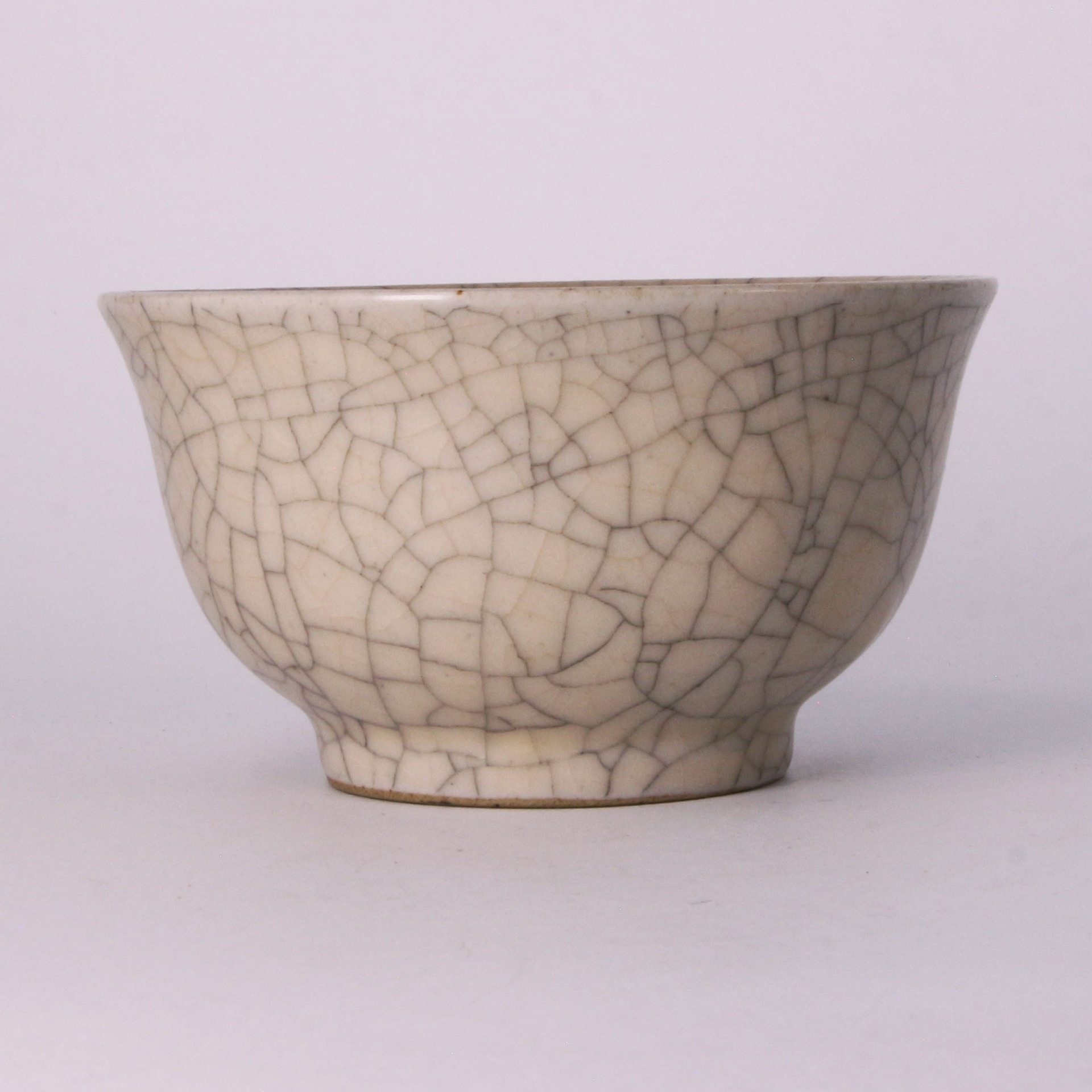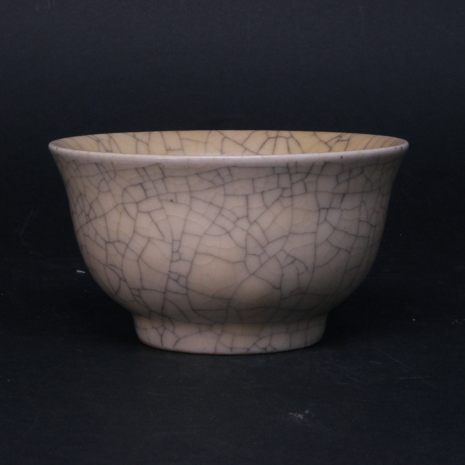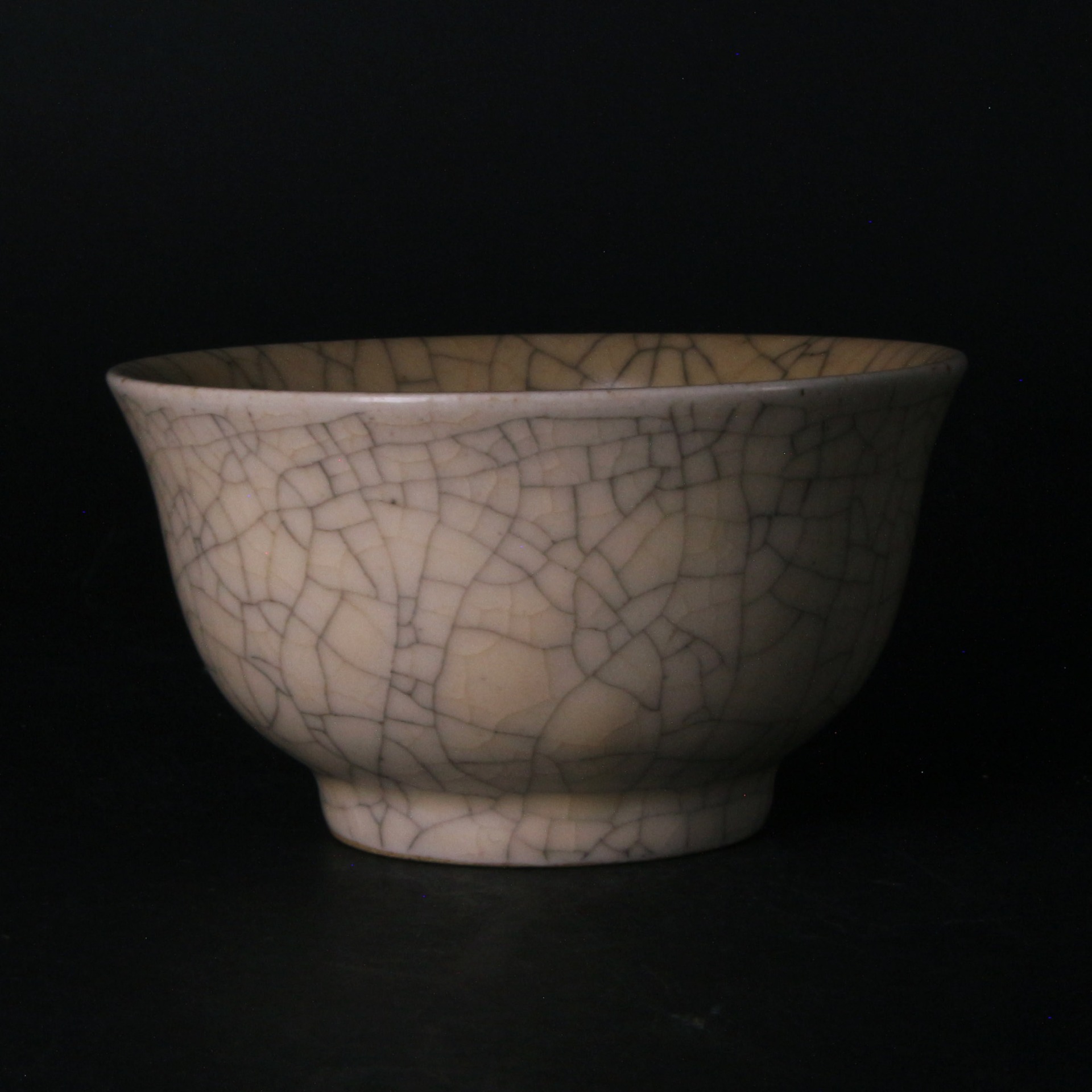 在工藝特質上,此盞釉層極為肥厚瑩潤,色澤多呈柔和的米黃或灰青色,光澤內斂不刺眼,呈現出一種如玉般的凝脂質感。由於釉中含有微小氣泡,使光線產生散射,產生了哥窯特有的「酥光」現象。整器工藝嚴謹,開片分佈自然而不凌亂,堪稱宋代陶瓷藝術中以瑕為美、化腐朽為神奇的巔峰之作。