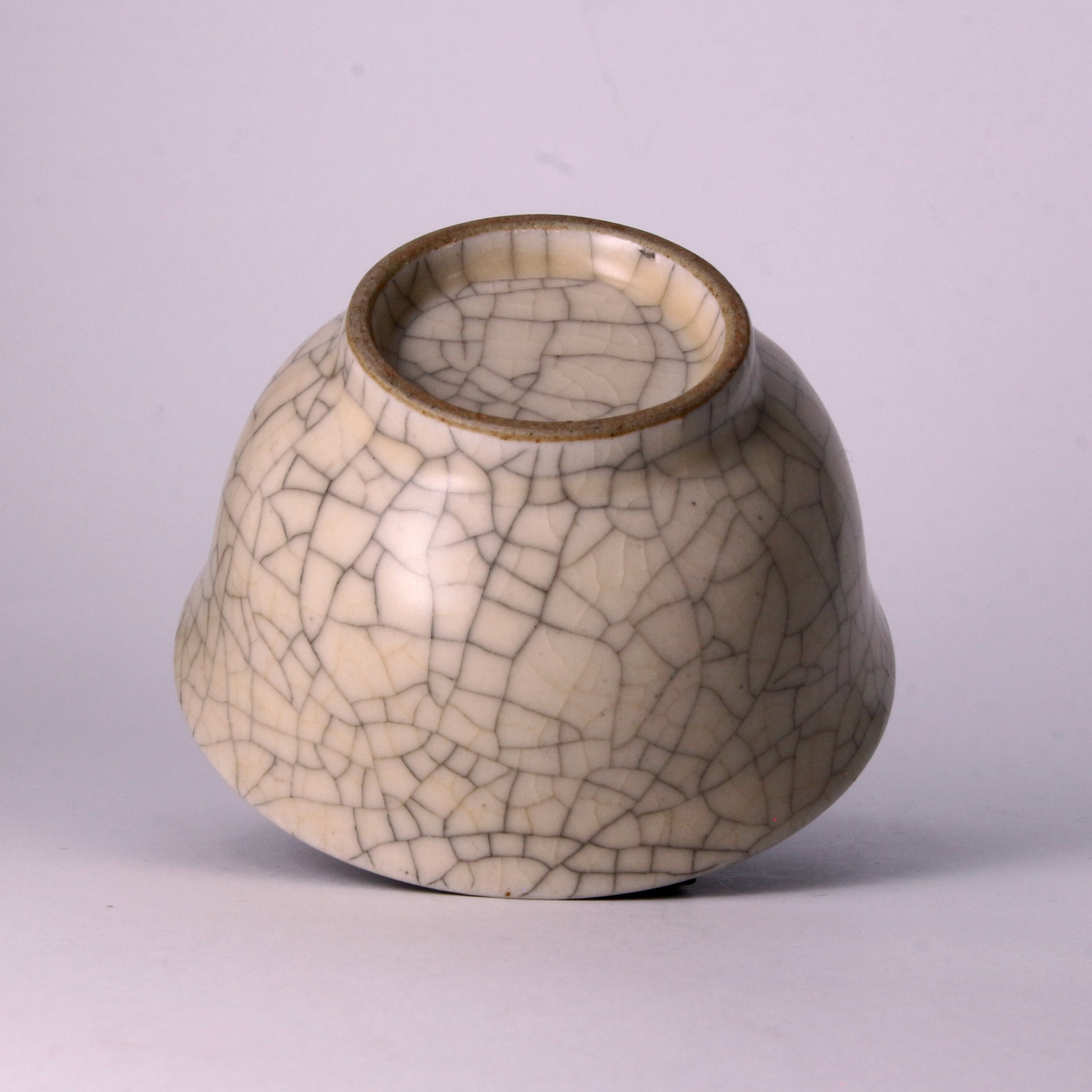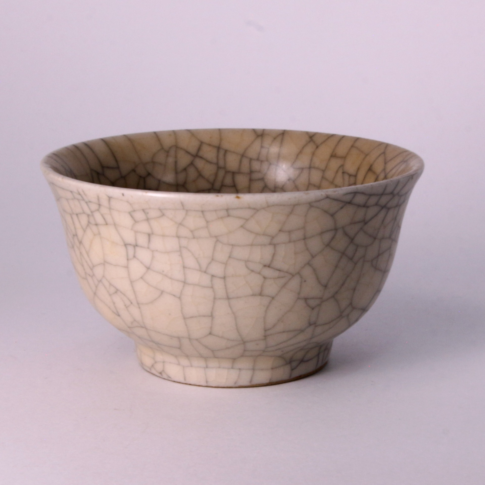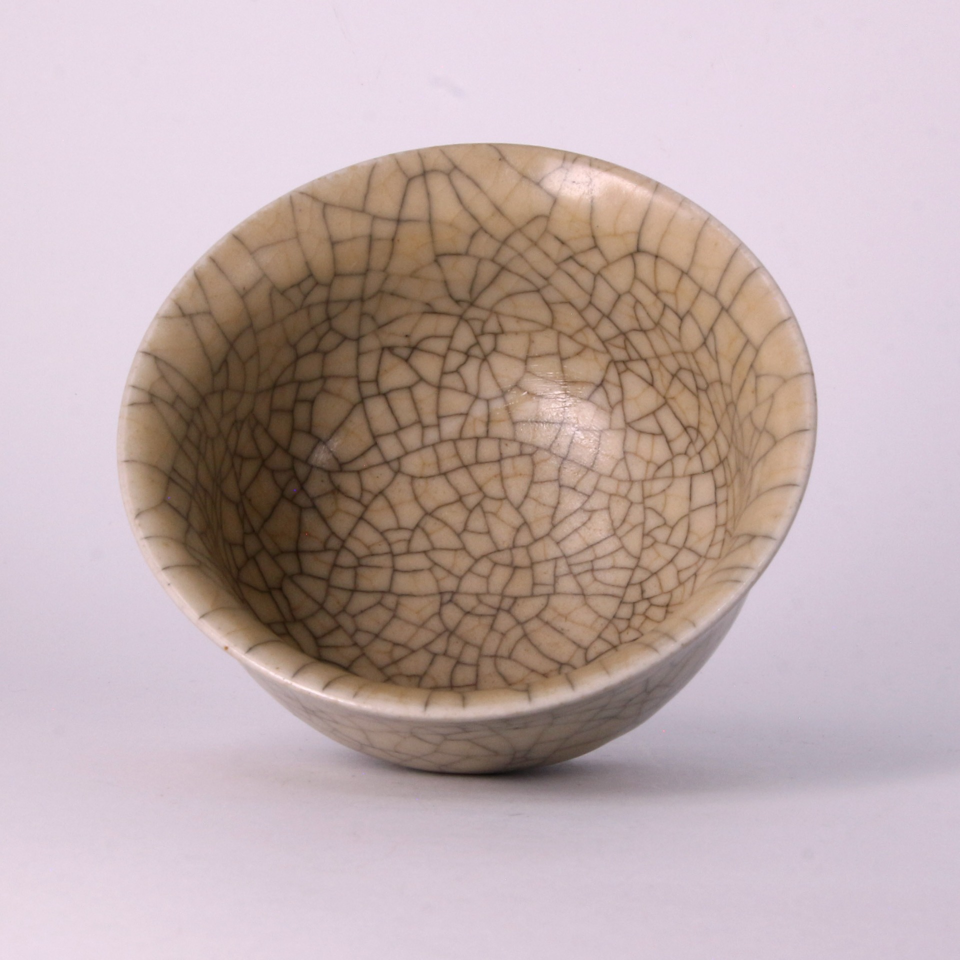 在工藝特質上,此盞釉層極為肥厚瑩潤,色澤多呈柔和的米黃或灰青色,光澤內斂不刺眼,呈現出一種如玉般的凝脂質感。由於釉中含有微小氣泡,使光線產生散射,產生了哥窯特有的「酥光」現象。整器工藝嚴謹,開片分佈自然而不凌亂,堪稱宋代陶瓷藝術中以瑕為美、化腐朽為神奇的巔峰之作。