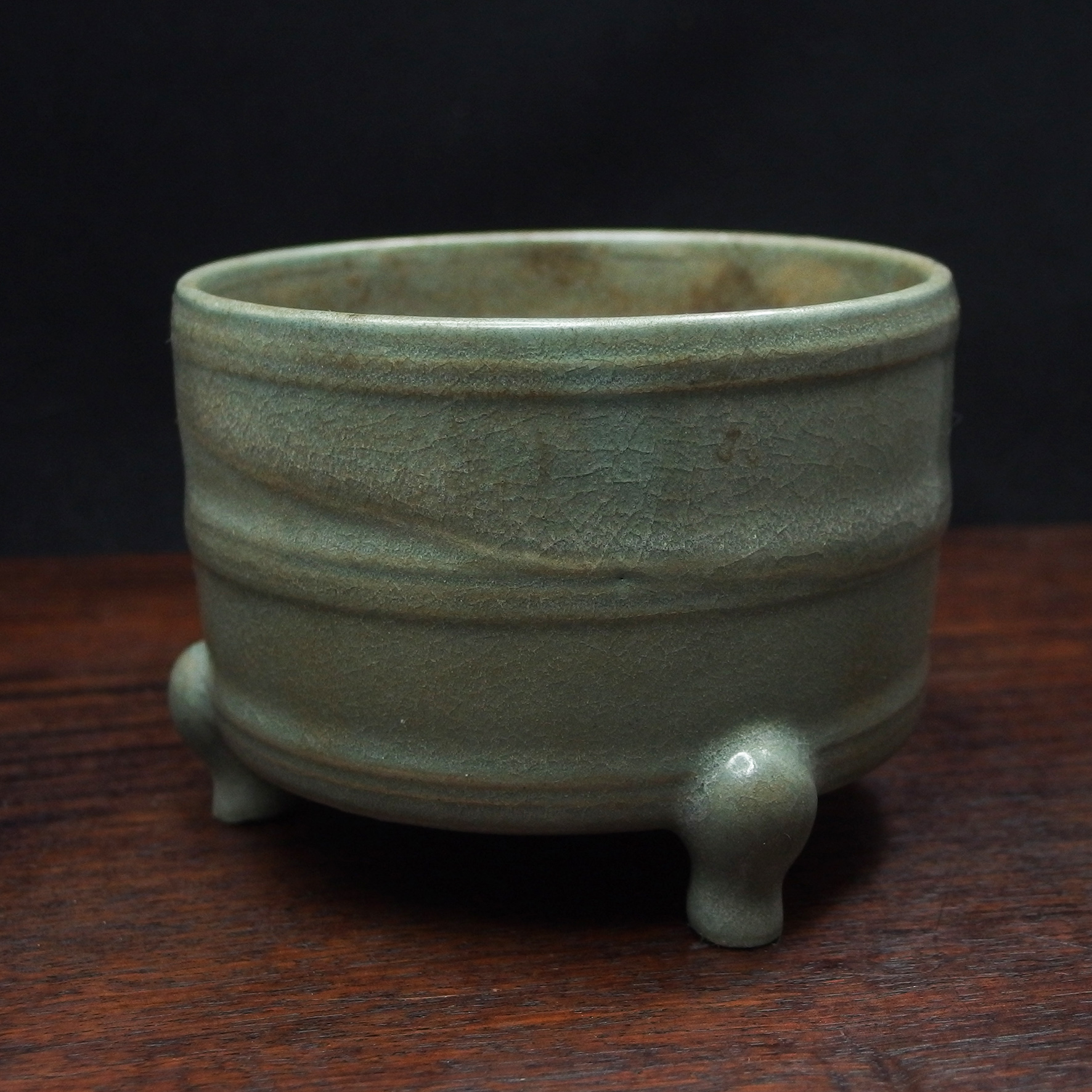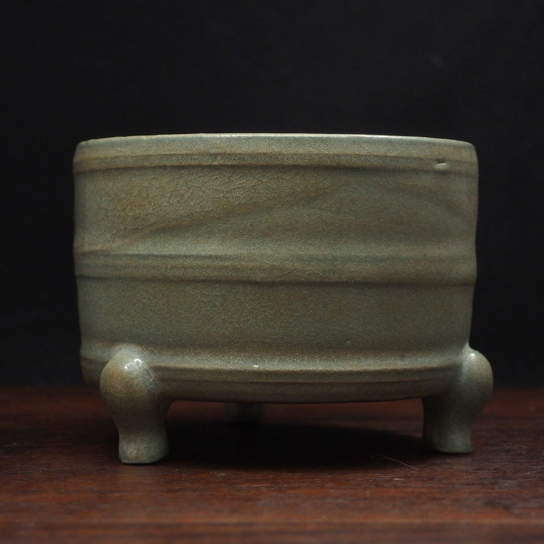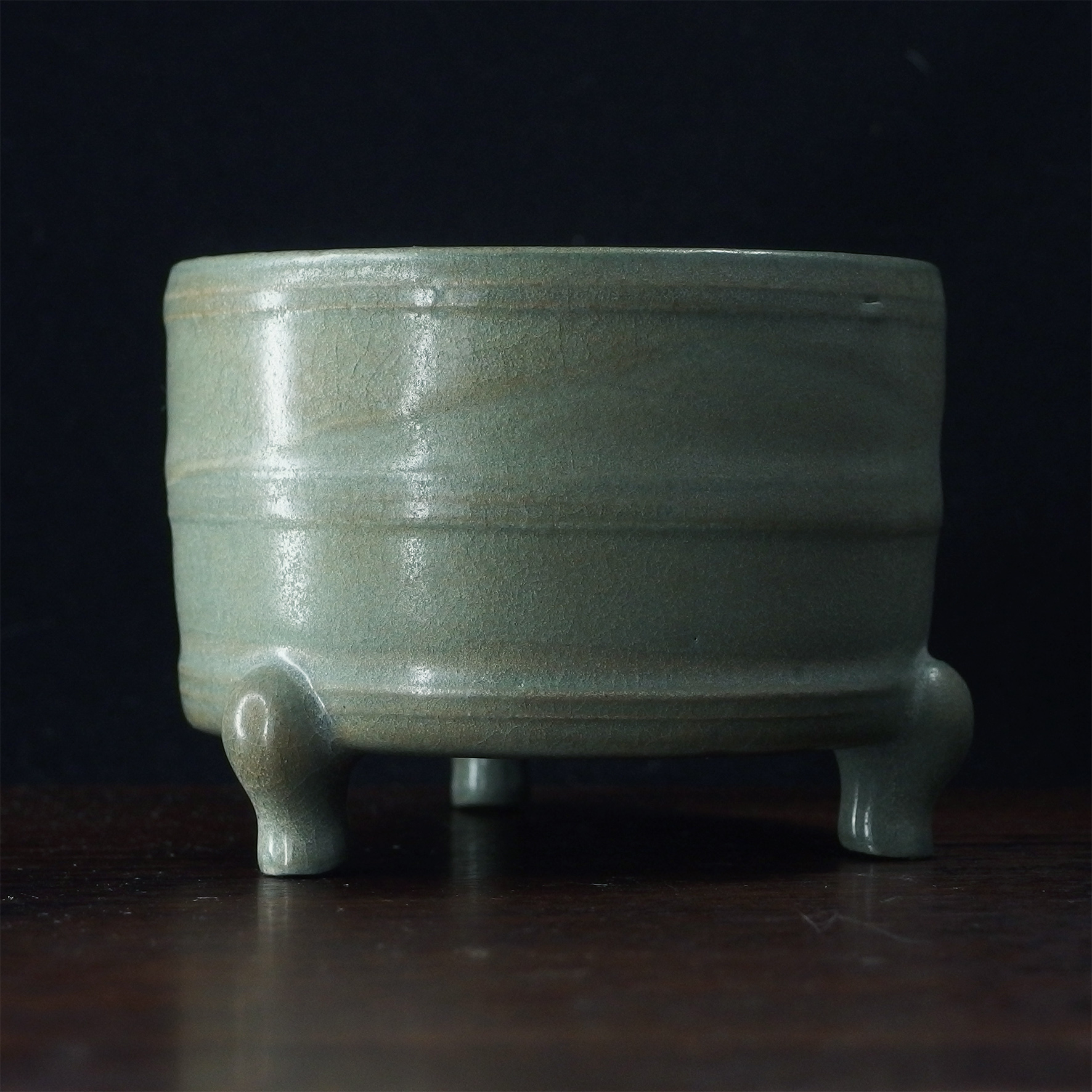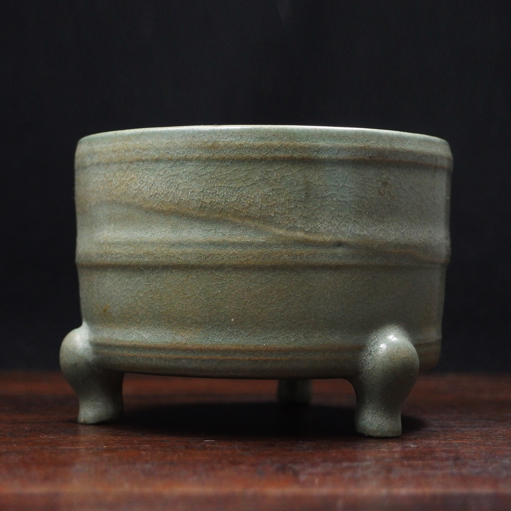 此三足奩造型穩重而典雅,口沿微斂,腹壁圓鼓,通體比例勻稱端莊。外壁以數道弦紋環繞成帶,線條柔和內斂,隨器身起伏如水波暗湧。釉色為典型汝窯天青釉,色澤溫潤含蓄,呈「雨過天青」之境。釉層肥厚細膩,天然垂釉土沁是贗品無法仿製,隱見細碎開片,如冰裂蟬翼,在光影流轉下呈現若有似無的光澤感,帶有玉質般的柔和觸感。三足短而渾圓,形如獸蹄,承托器身,使整器呈現出輕微凌空之勢,既穩健又不失靈動。