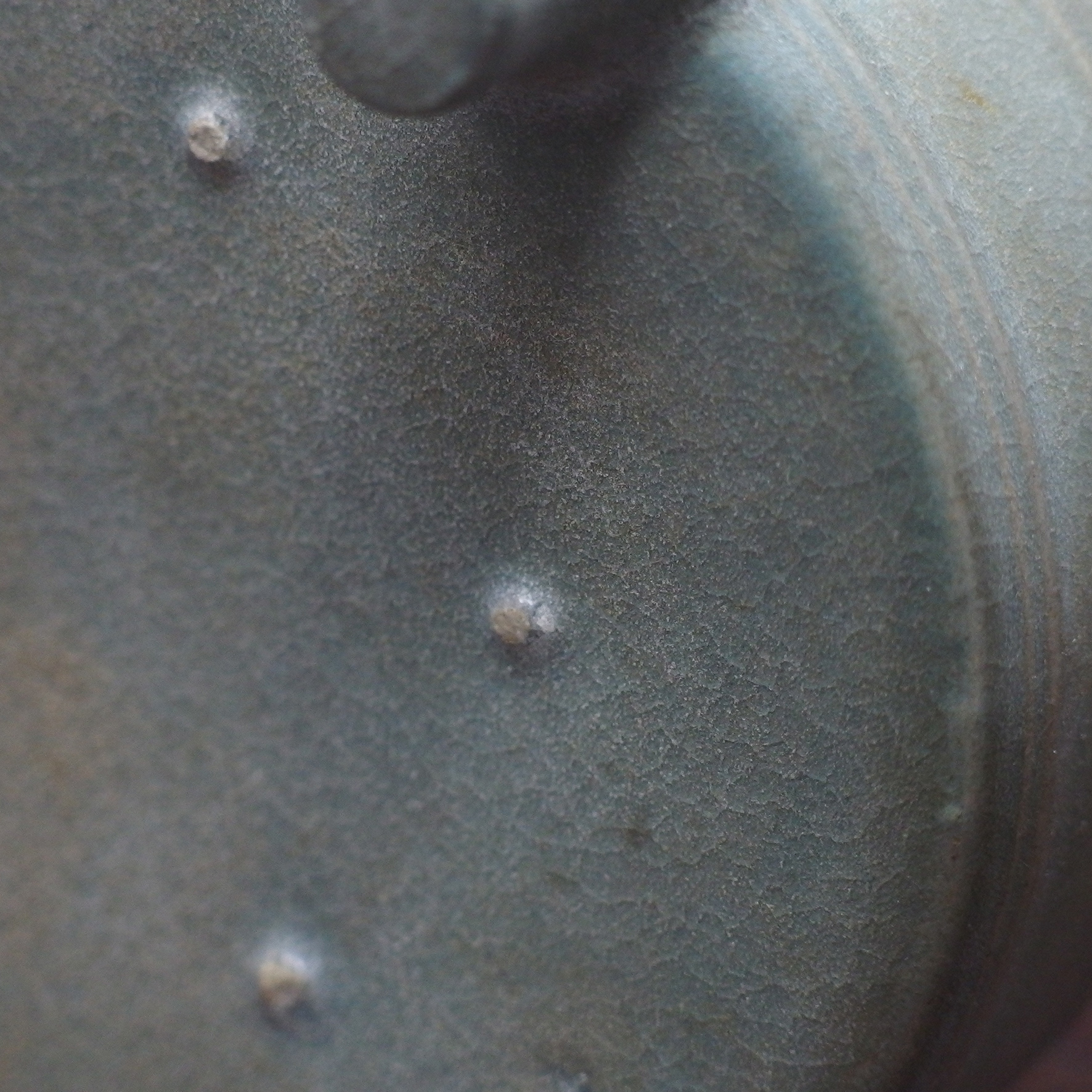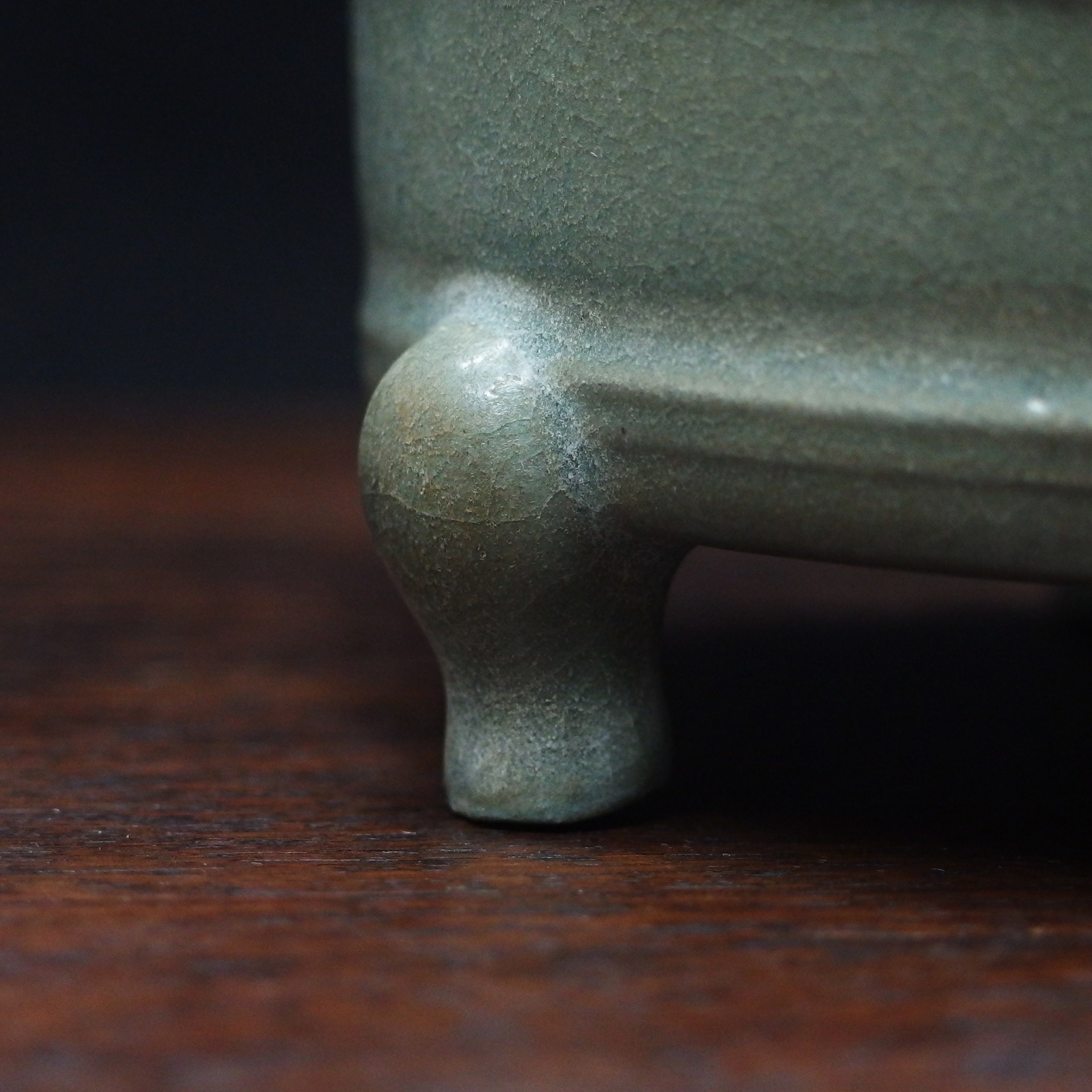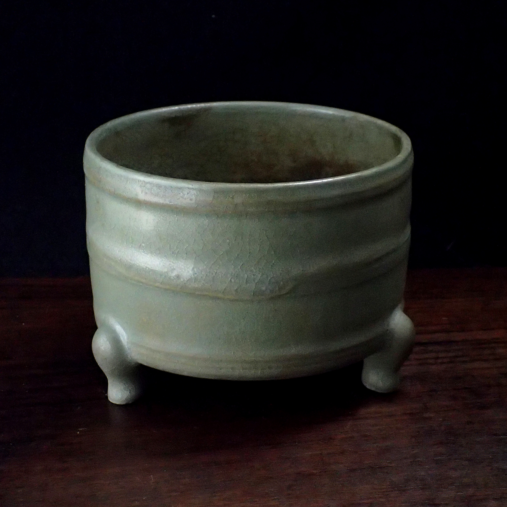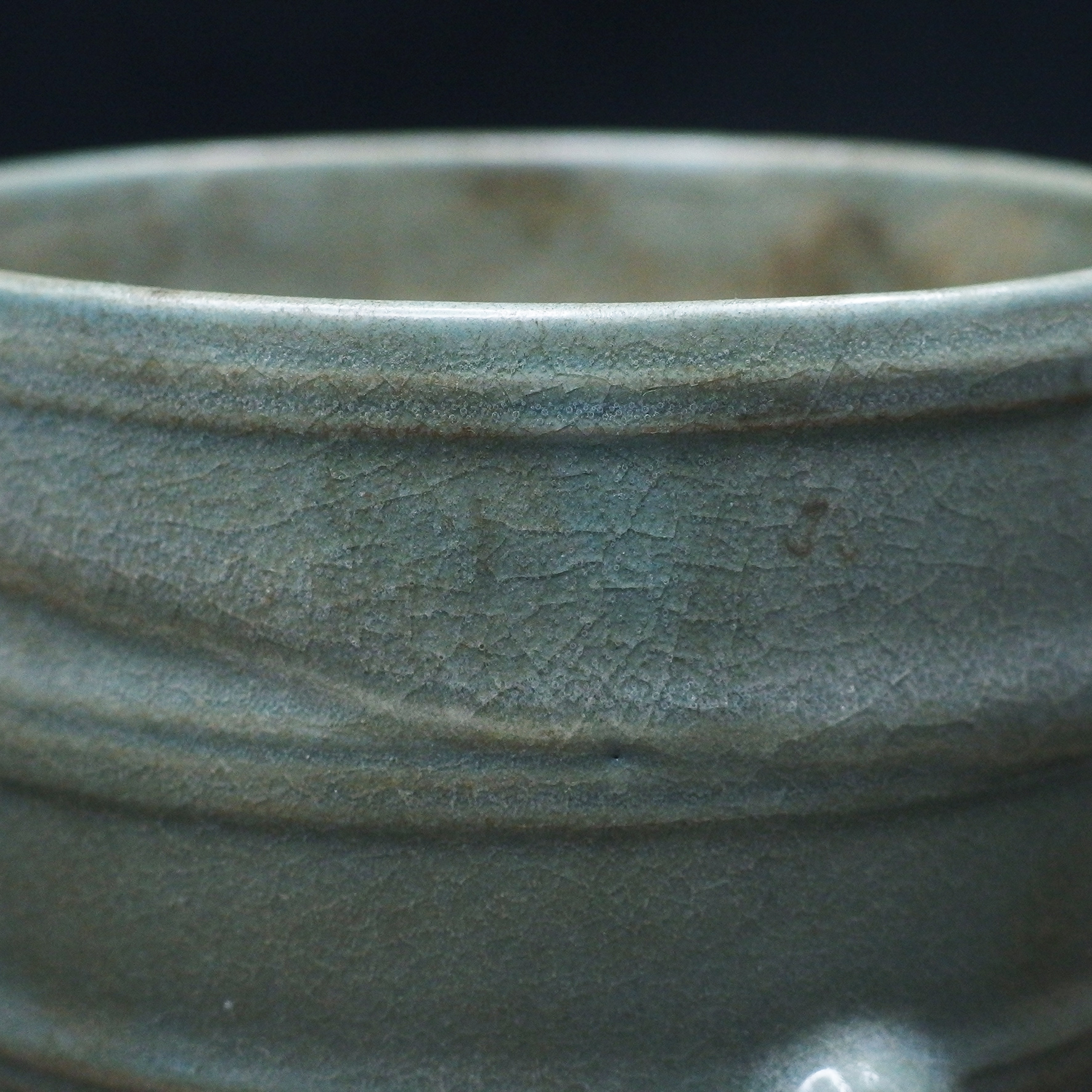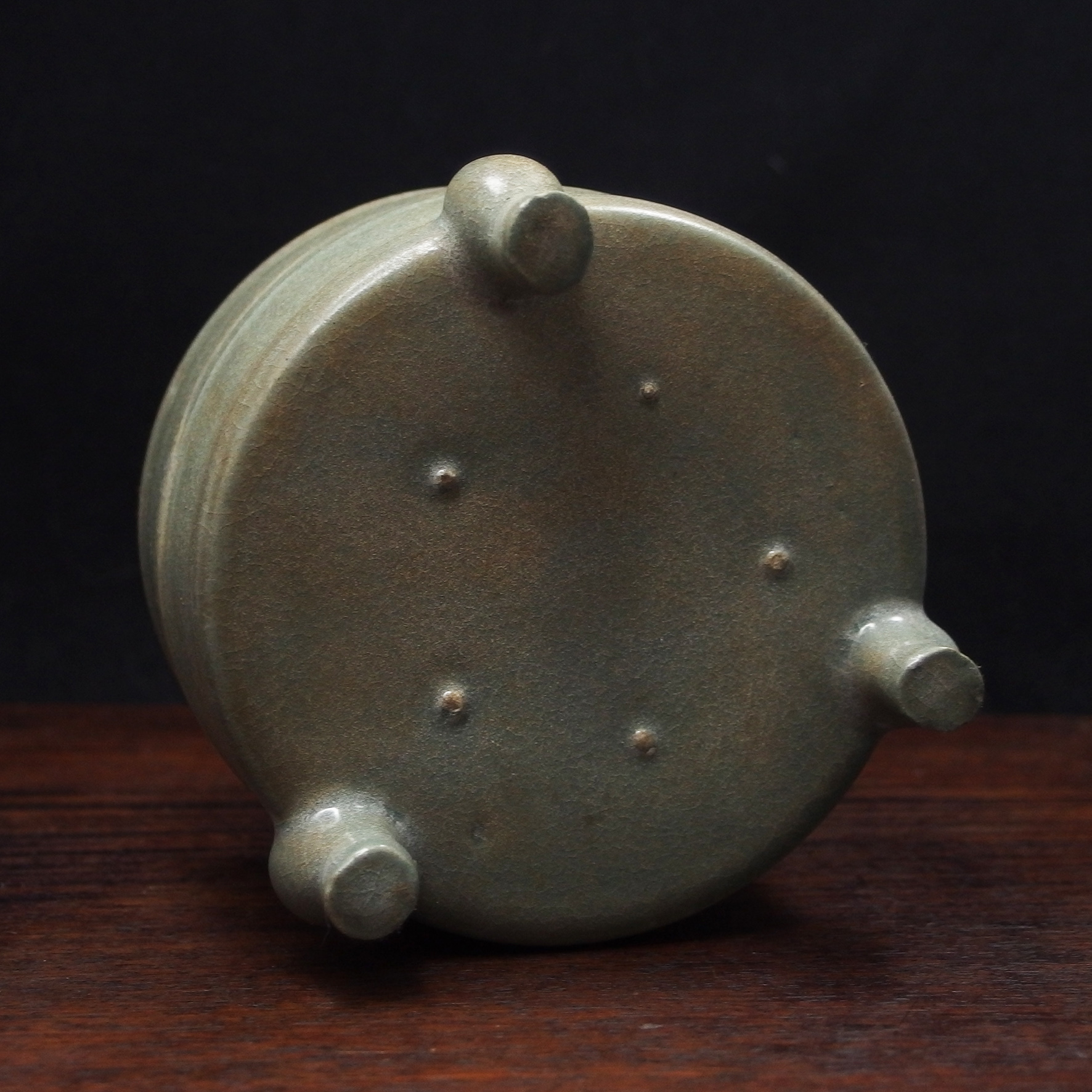此三足奩造型穩重而典雅,口沿微斂,腹壁圓鼓,通體比例勻稱端莊。外壁以數道弦紋環繞成帶,線條柔和內斂,隨器身起伏如水波暗湧。釉色為典型汝窯天青釉,色澤溫潤含蓄,呈「雨過天青」之境。釉層肥厚細膩,天然垂釉土沁是贗品無法仿製,隱見細碎開片,如冰裂蟬翼,在光影流轉下呈現若有似無的光澤感,帶有玉質般的柔和觸感。三足短而渾圓,形如獸蹄,承托器身,使整器呈現出輕微凌空之勢,既穩健又不失靈動。