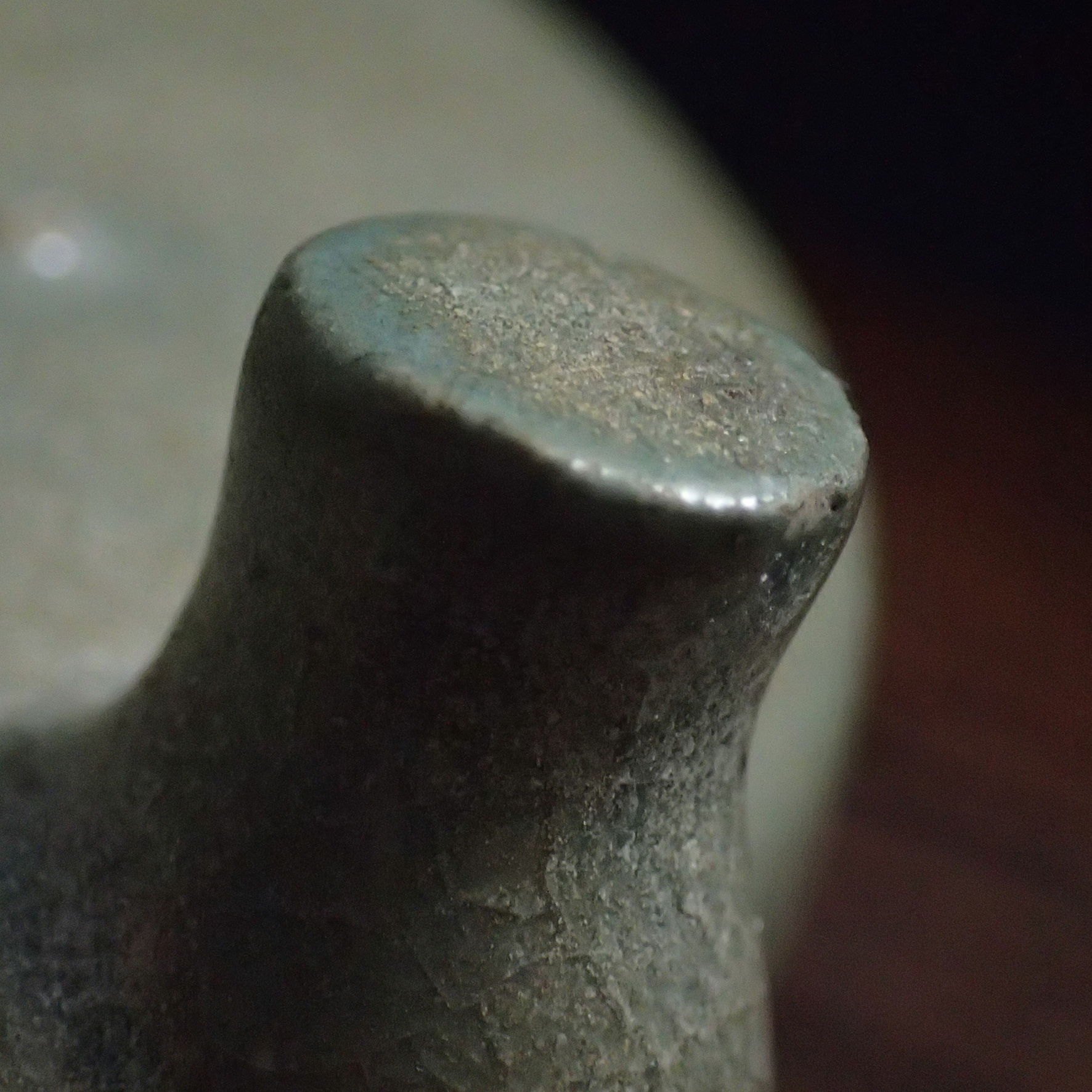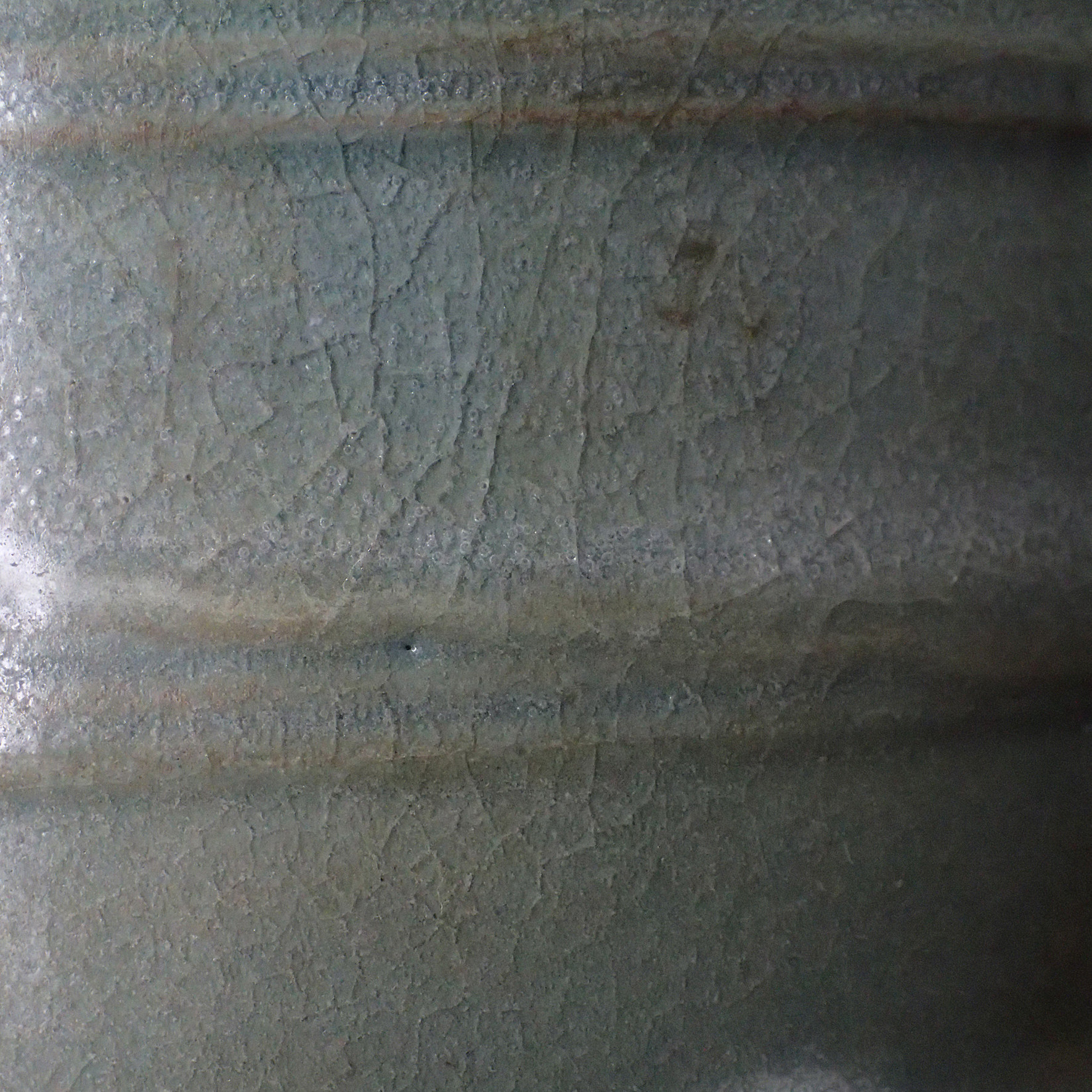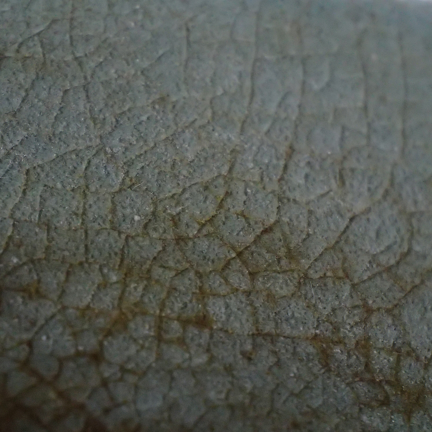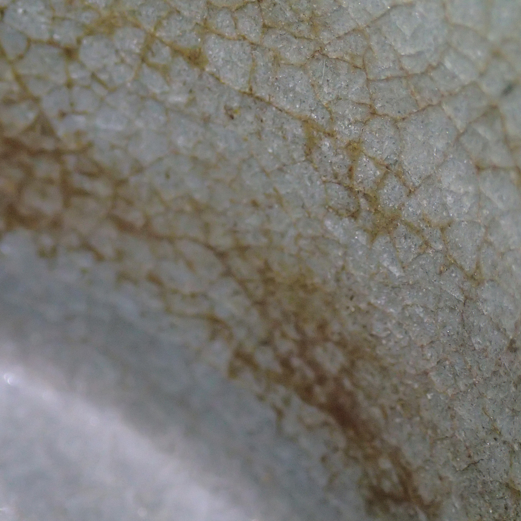 此三足奩造型穩重而典雅,口沿微斂,腹壁圓鼓,通體比例勻稱端莊。外壁以數道弦紋環繞成帶,線條柔和內斂,隨器身起伏如水波暗湧。釉色為典型汝窯天青釉,色澤溫潤含蓄,呈「雨過天青」之境。釉層肥厚細膩,天然垂釉土沁是贗品無法仿製,隱見細碎開片,如冰裂蟬翼,在光影流轉下呈現若有似無的光澤感,帶有玉質般的柔和觸感。三足短而渾圓,形如獸蹄,承托器身,使整器呈現出輕微凌空之勢,既穩健又不失靈動。