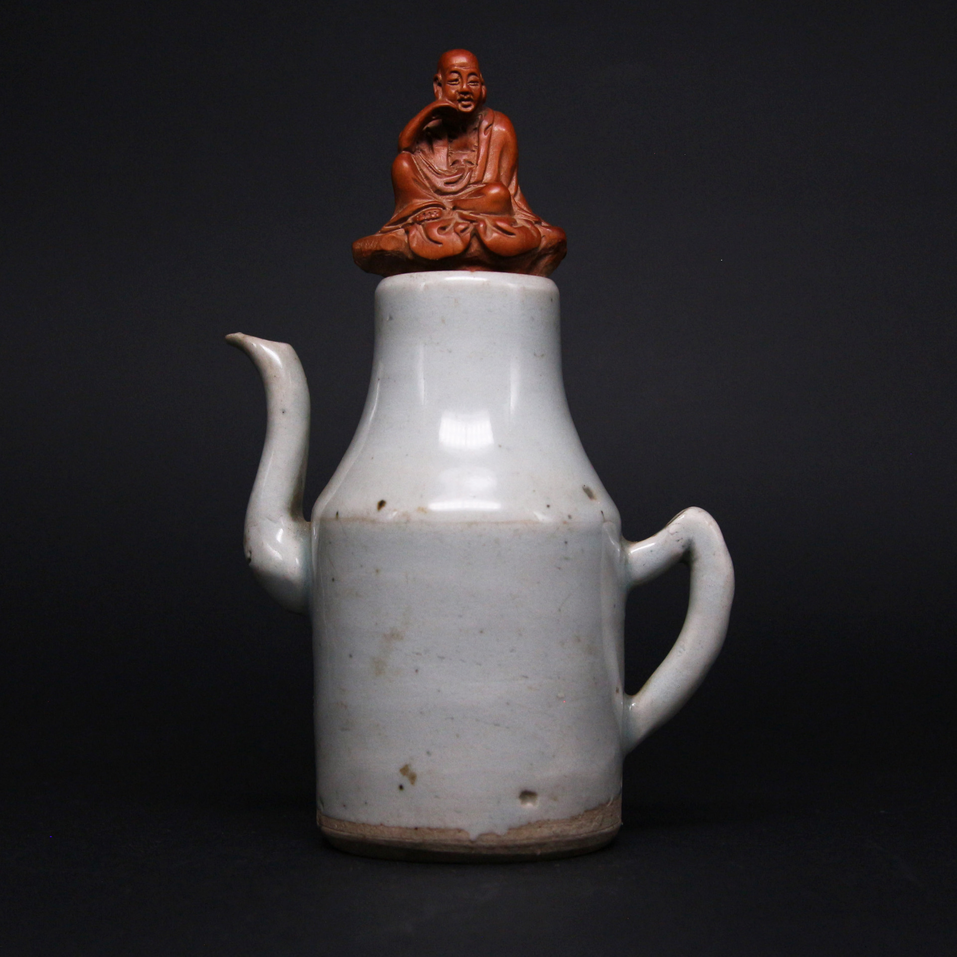 壺蓋上塑羅漢小像,神態安然自若,靜觀世事,寓意超然出塵。青瓷與雕塑的對比,構成動靜之間的詩意呼應——如禪茶一味,清淡中見深意,於日常之器中體現宋人心境的靜謐與從容。