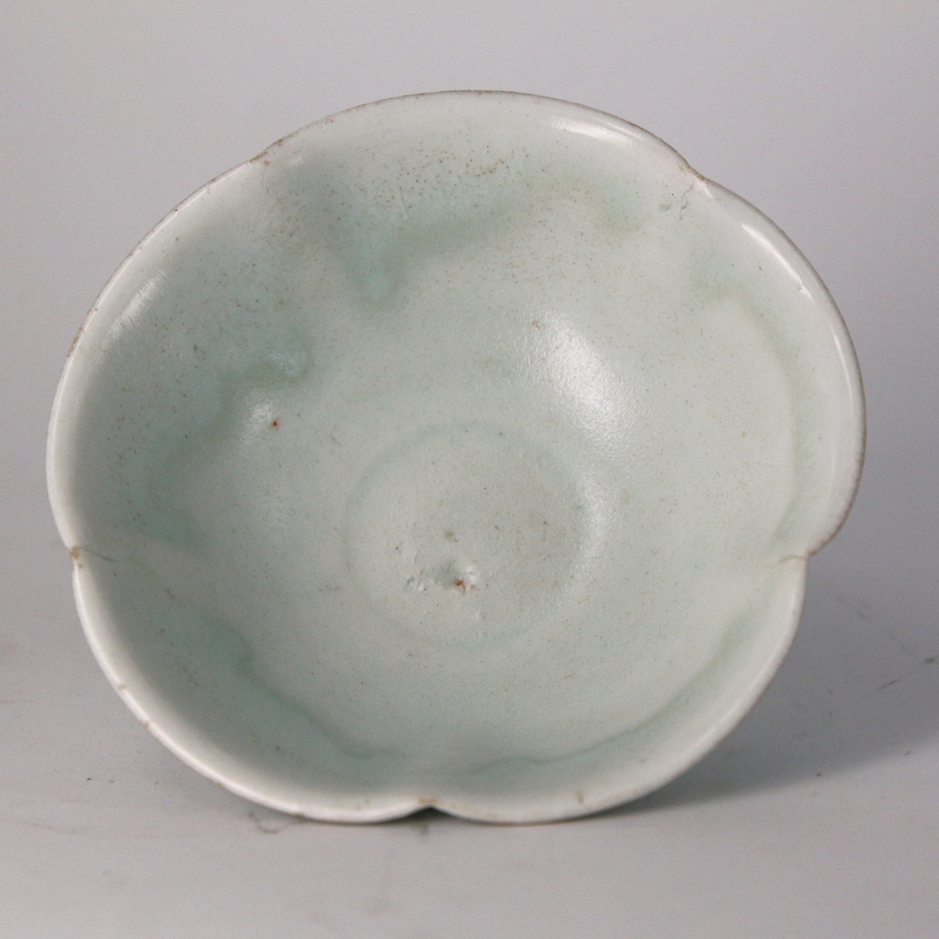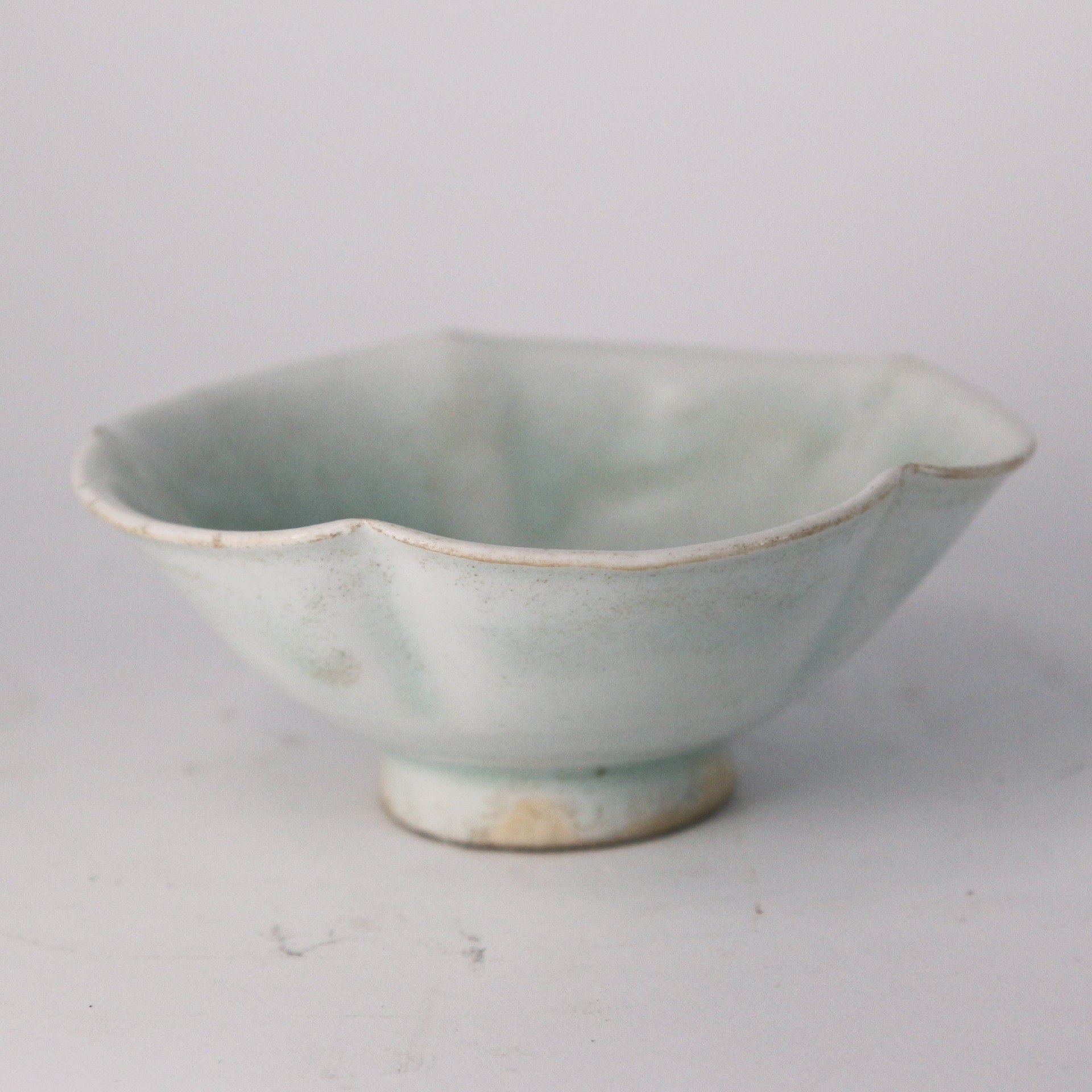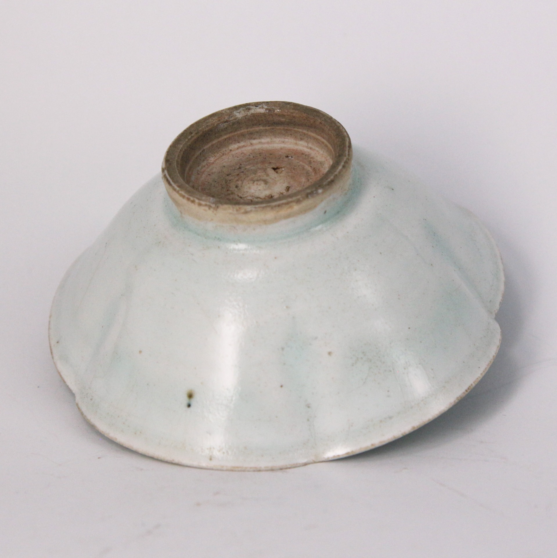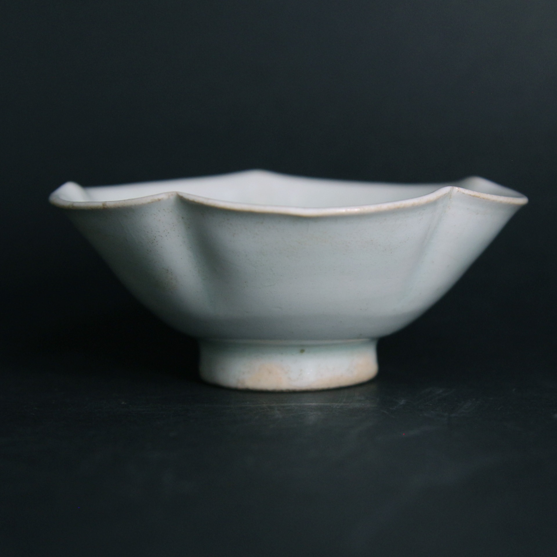此盞器形優雅,口沿作六瓣葵花口設計,猶如盛開的荷花或秋葵,線條流暢自然。胎體細膩潔白,壁薄透光,充分展現了宋代高超的製瓷工藝。釉色呈現典型的影青釉(青白釉),釉質滋潤透明,玻璃質感強。在器物轉折及積釉處,色澤呈現淡淡的湖水青色,與薄釉處的瑩白色交相輝映,呈現出「色白花青」的雅致韻味。