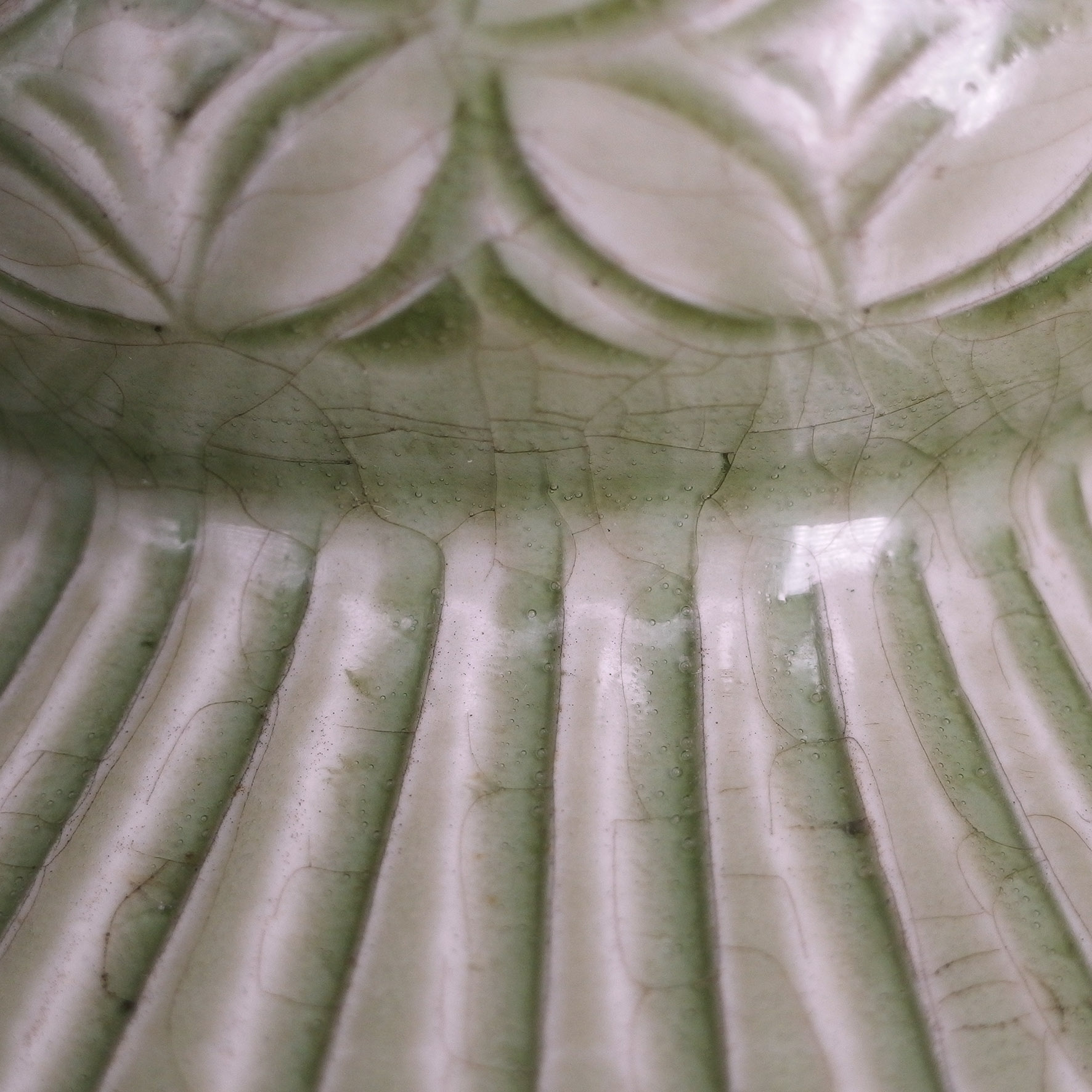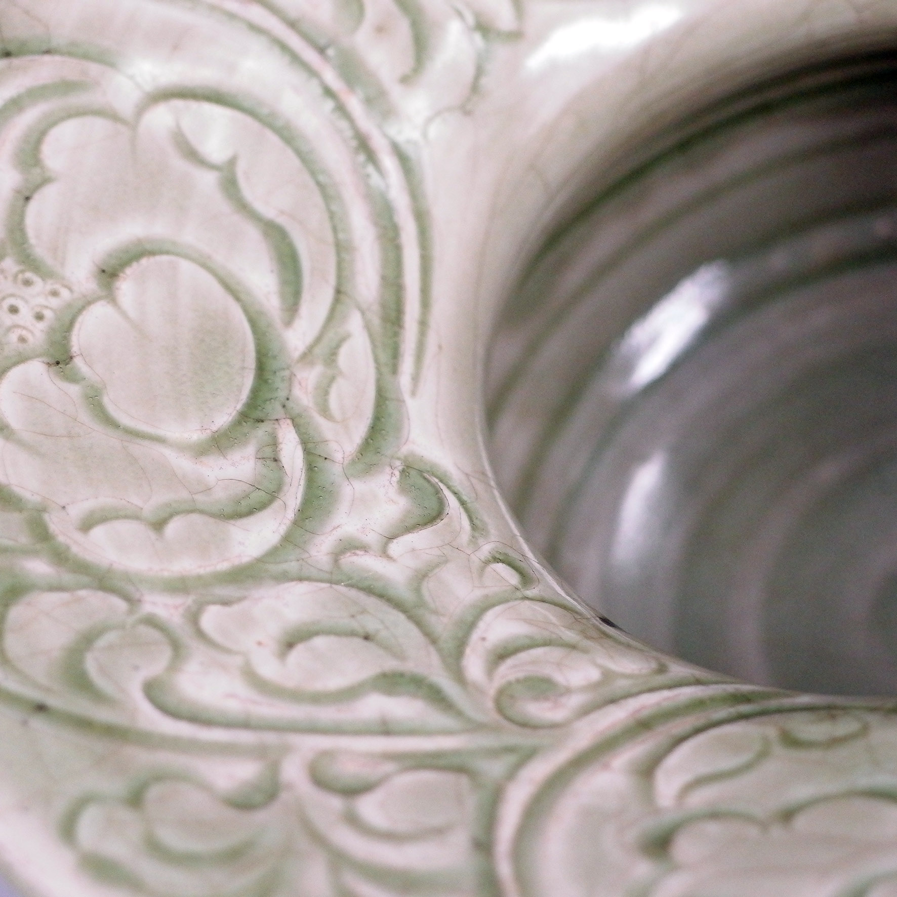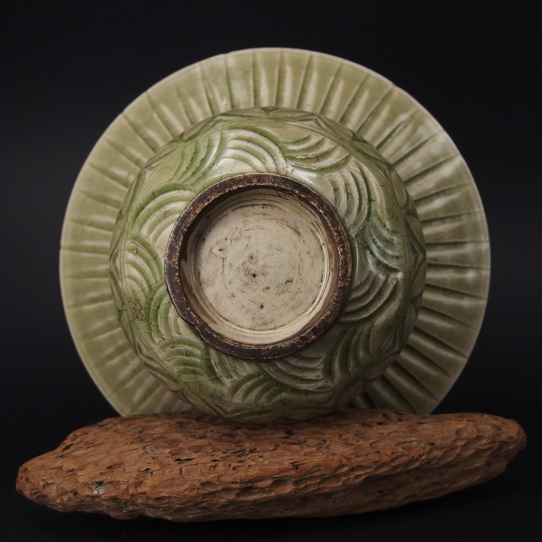 此件渣斗用途多為文房、宴飲時的洗滌之器,然其造型與裝飾之精,已超越實用層面,成為宋人審美精神的具象化。耀州青釉的深翠與淺翠交融,展現出柔和卻不失力度的工藝語彙,是宋代北方窯系青瓷成熟階段的代表之作。