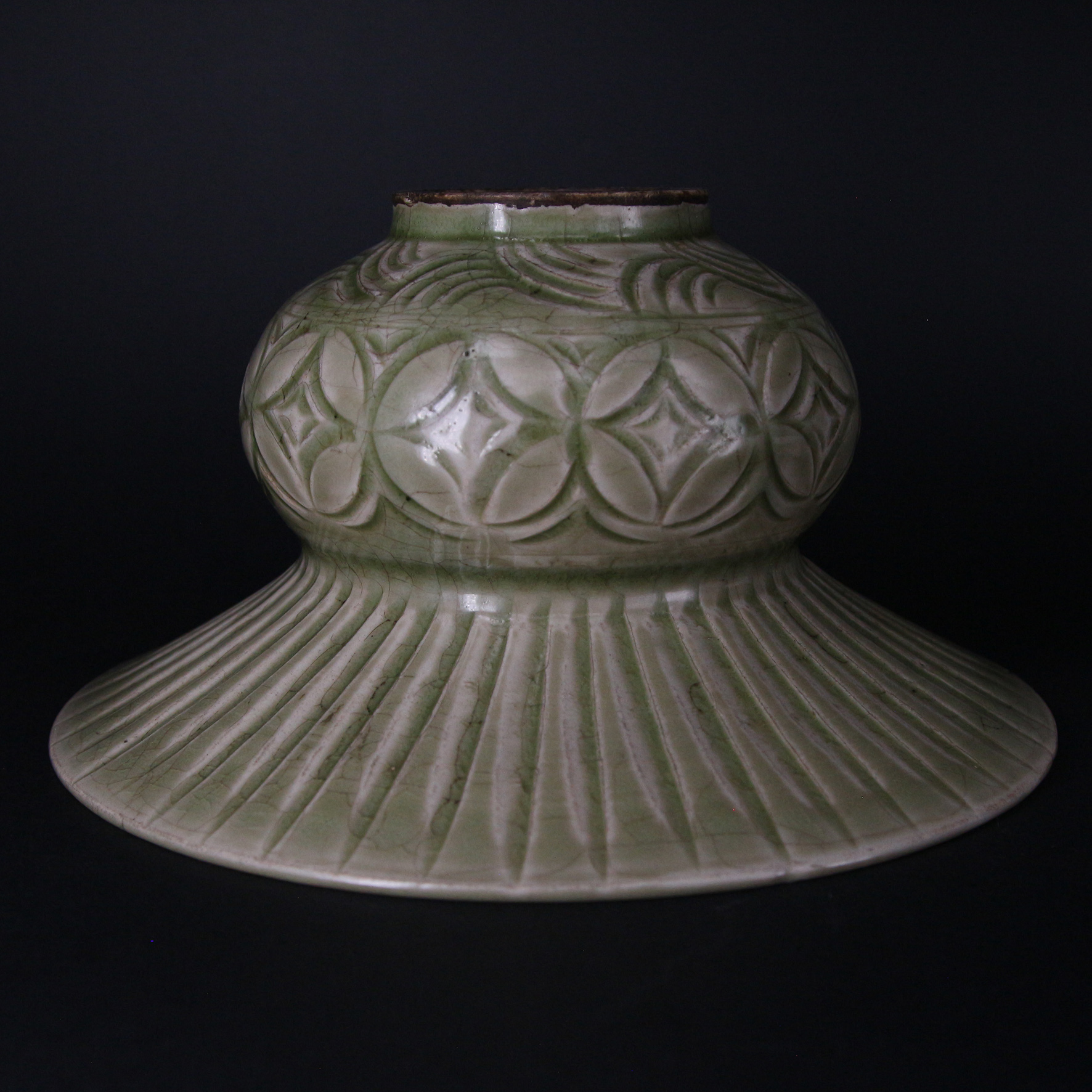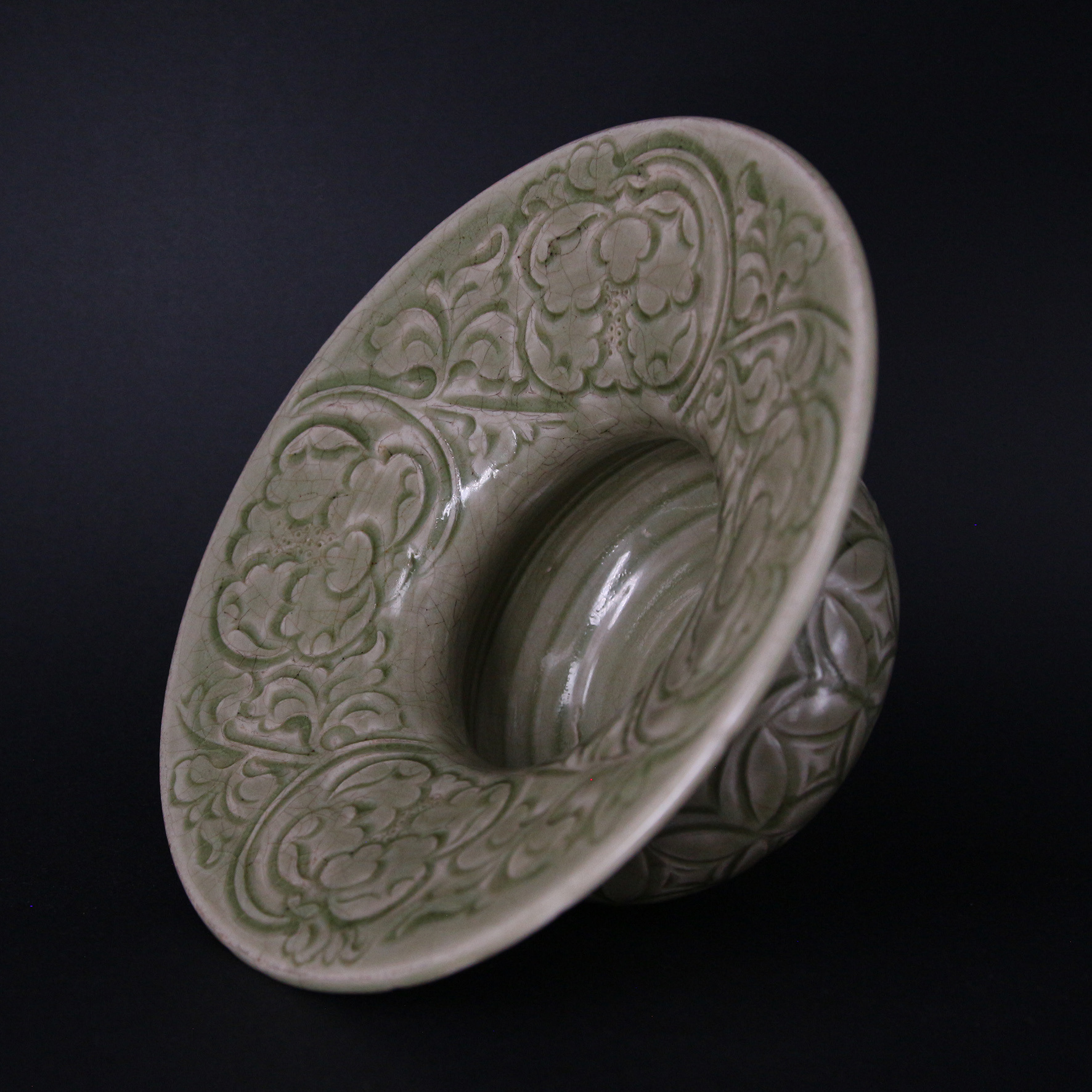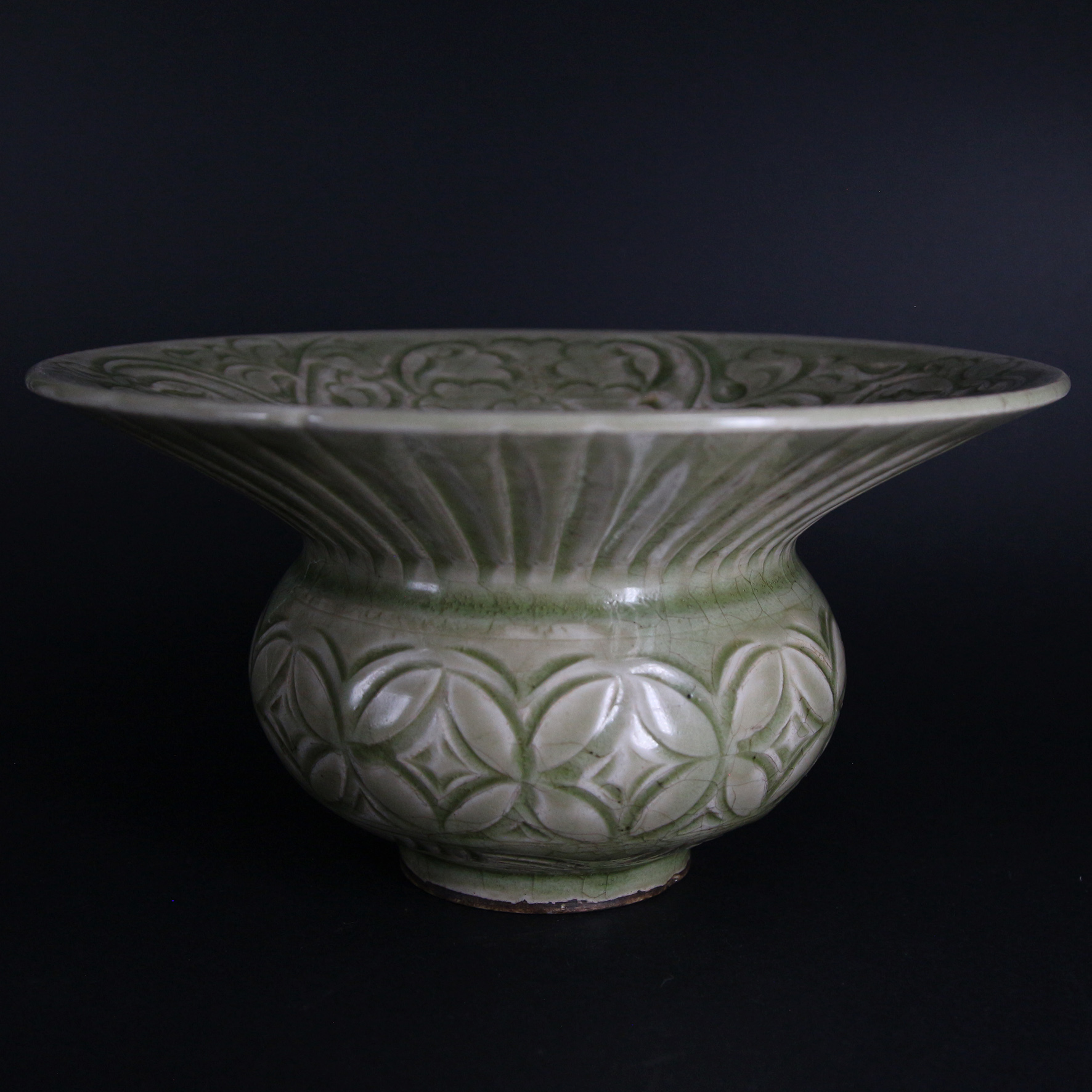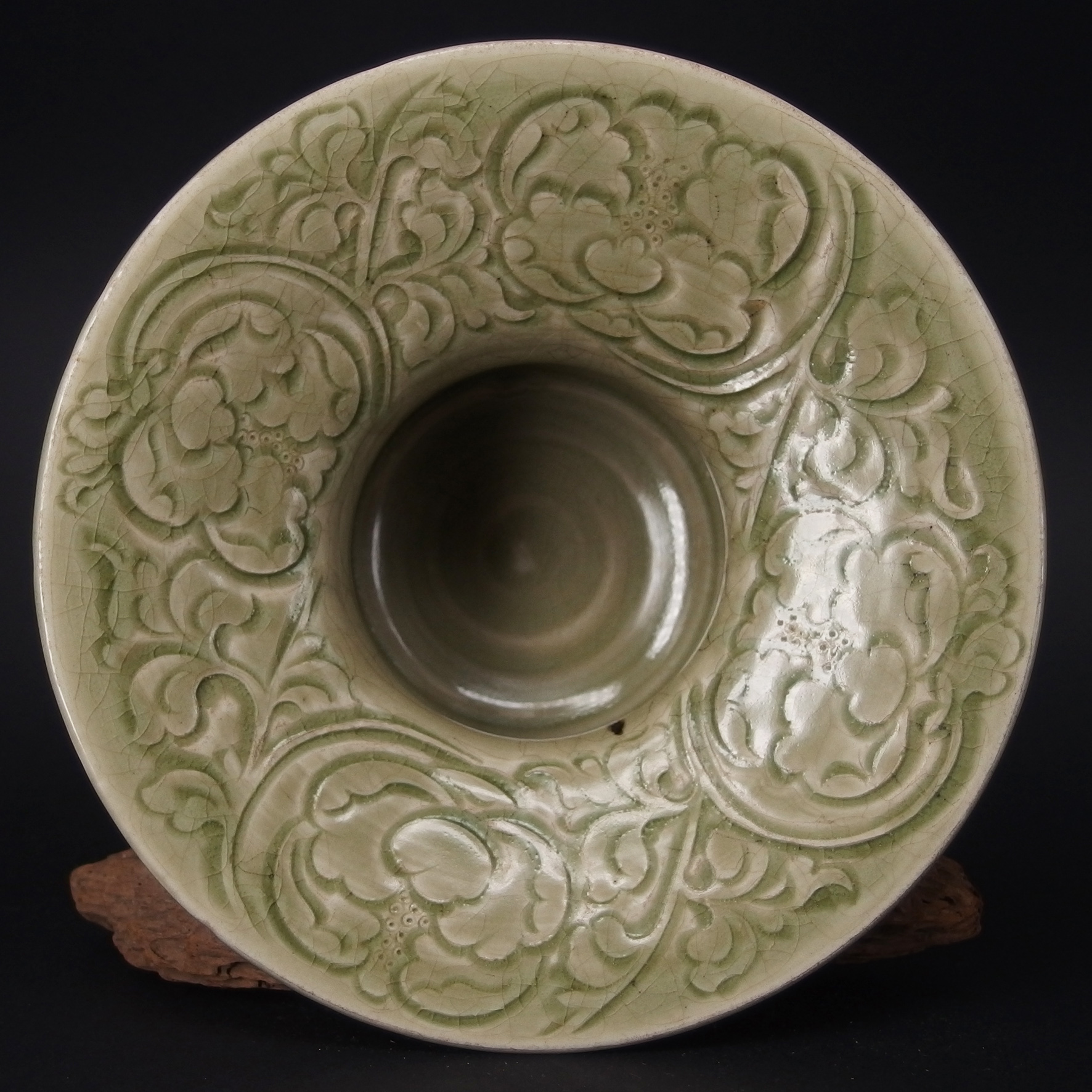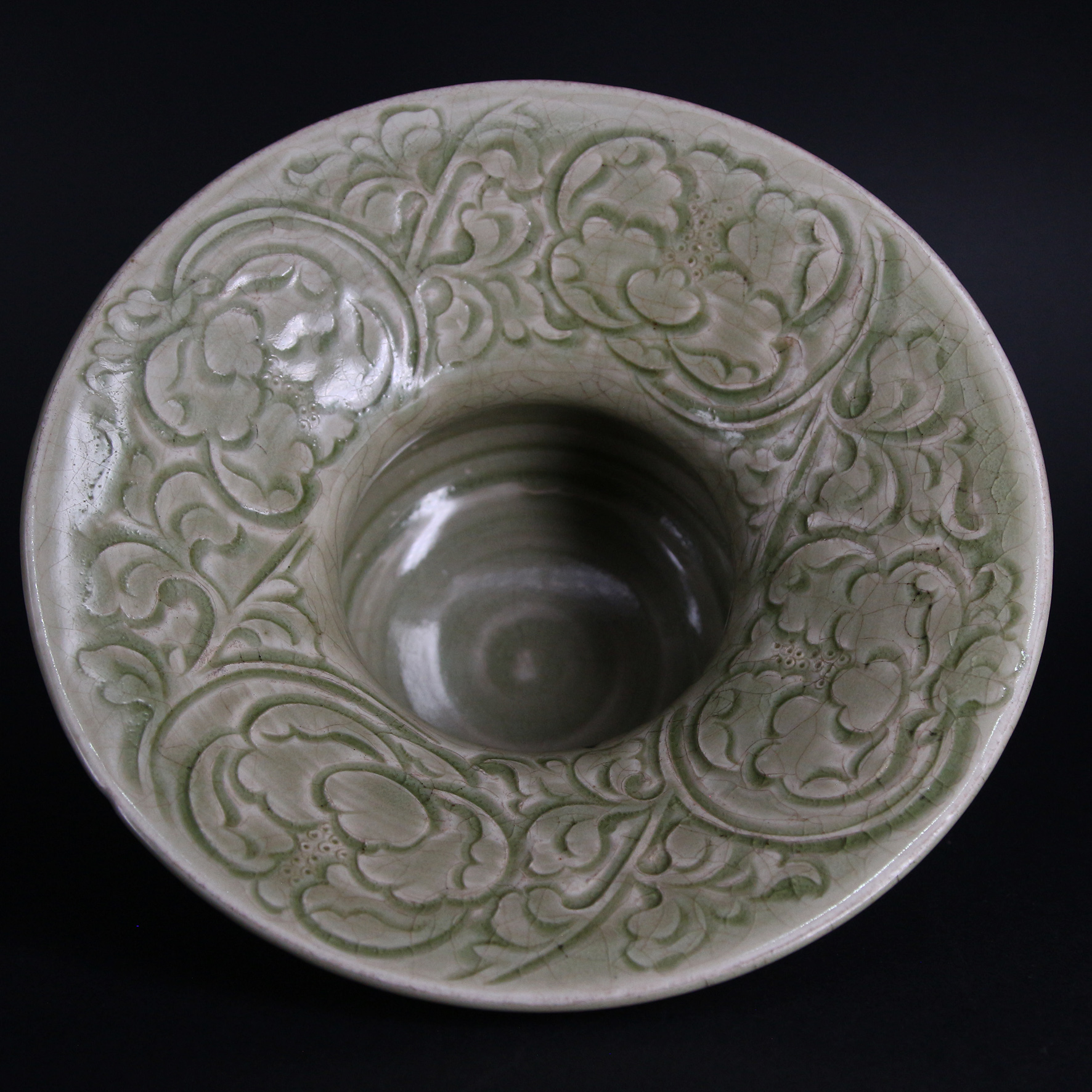 宋代耀州窯以青釉聞名,其胎質堅緻、釉色溫潤帶微黃綠。本器為渣斗,器形撇口深腹,下承圈足,線條簡勁有力。外壁以剔刻花卉紋飾,花瓣層疊錯落,與放射狀的刻線形成節奏感,光影流轉間顯露出宋瓷特有的典雅與樸素之美。