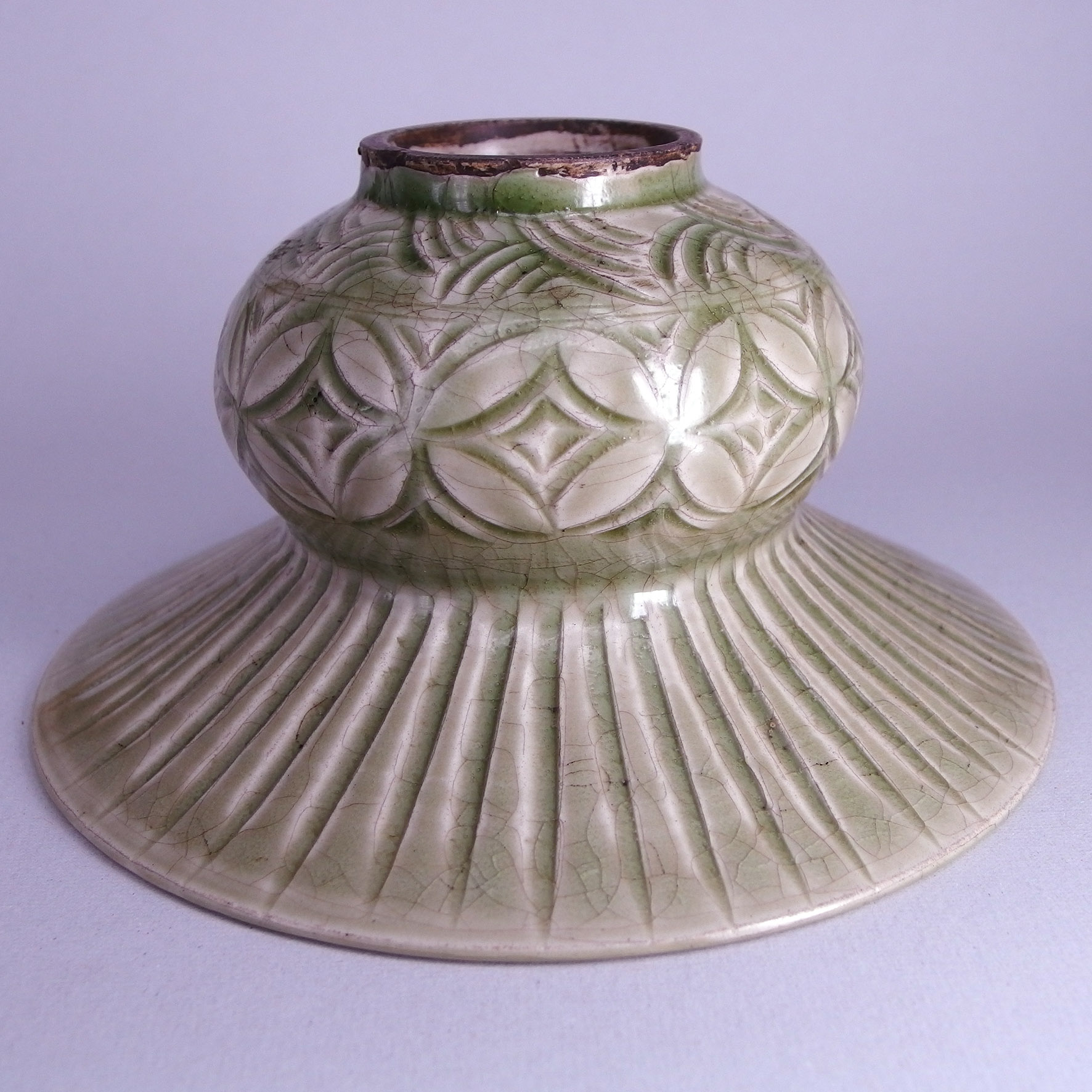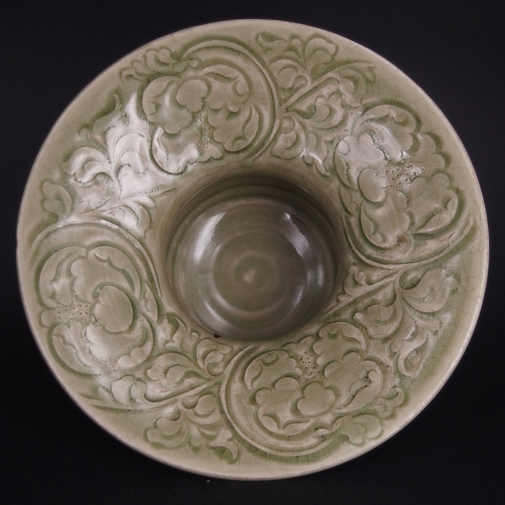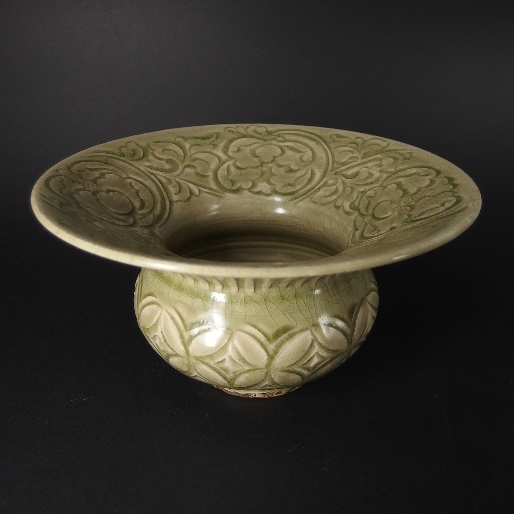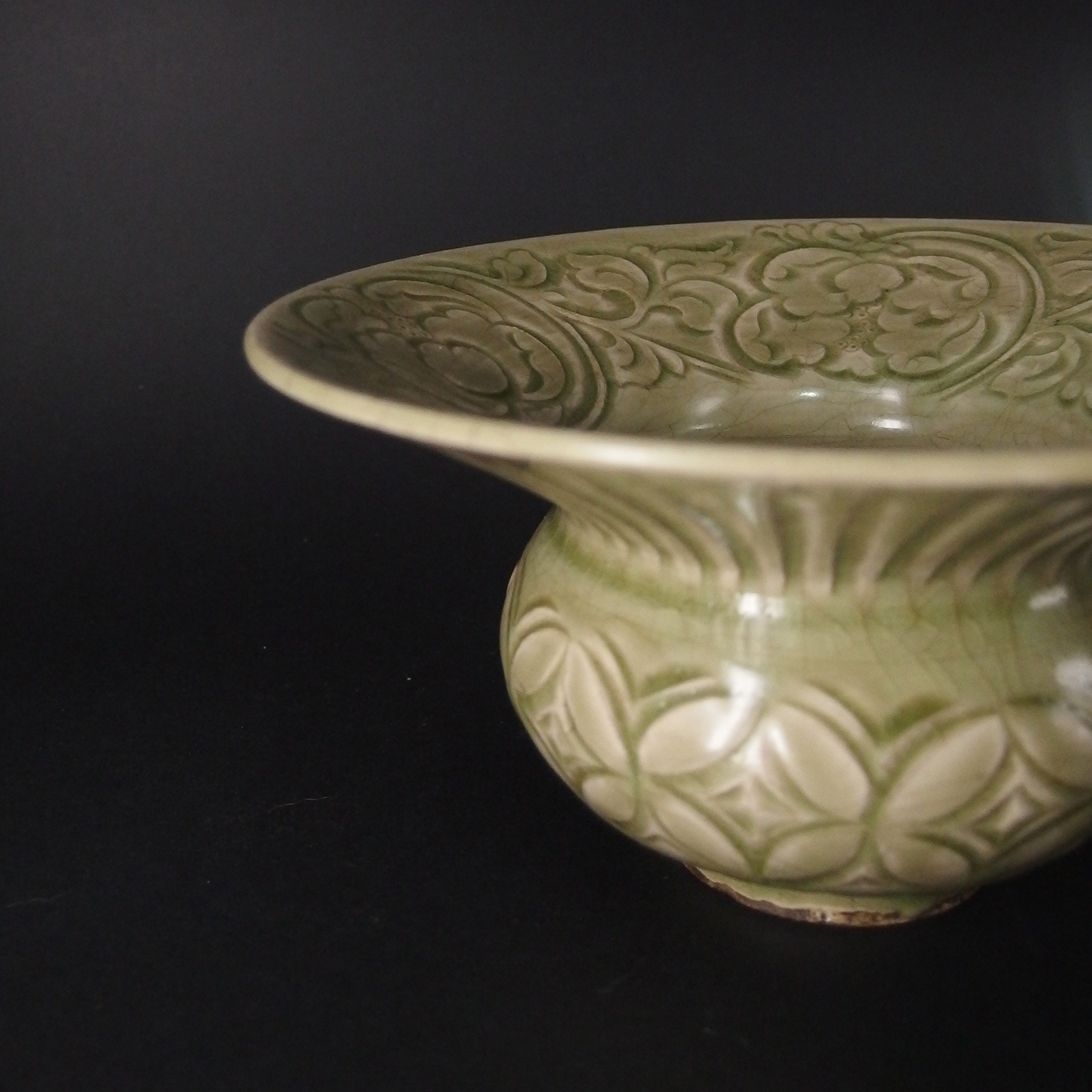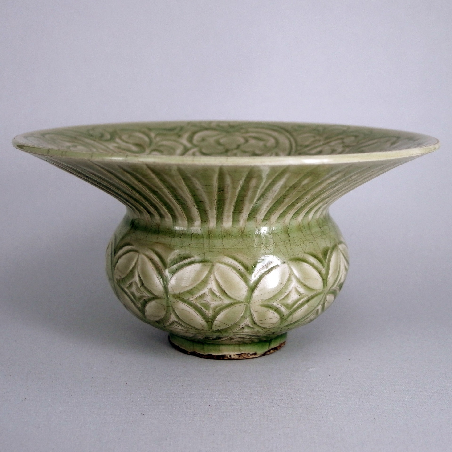 宋代耀州窯以青釉聞名,其胎質堅緻、釉色溫潤帶微黃綠。本器為渣斗,器形撇口深腹,下承圈足,線條簡勁有力。外壁以剔刻花卉紋飾,花瓣層疊錯落,與放射狀的刻線形成節奏感,光影流轉間顯露出宋瓷特有的典雅與樸素之美。