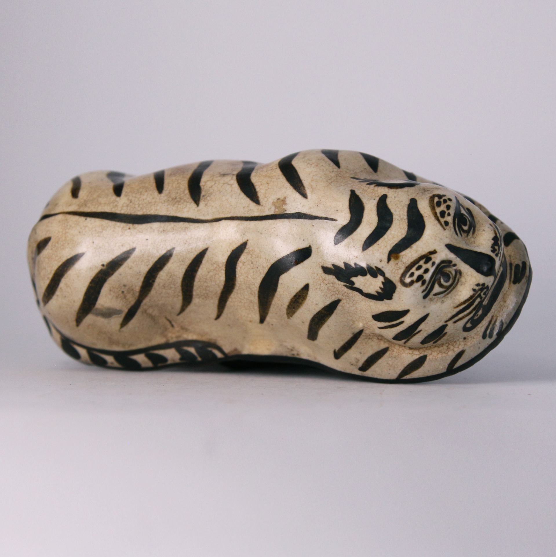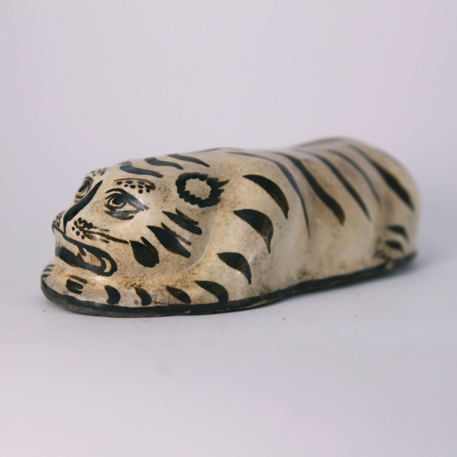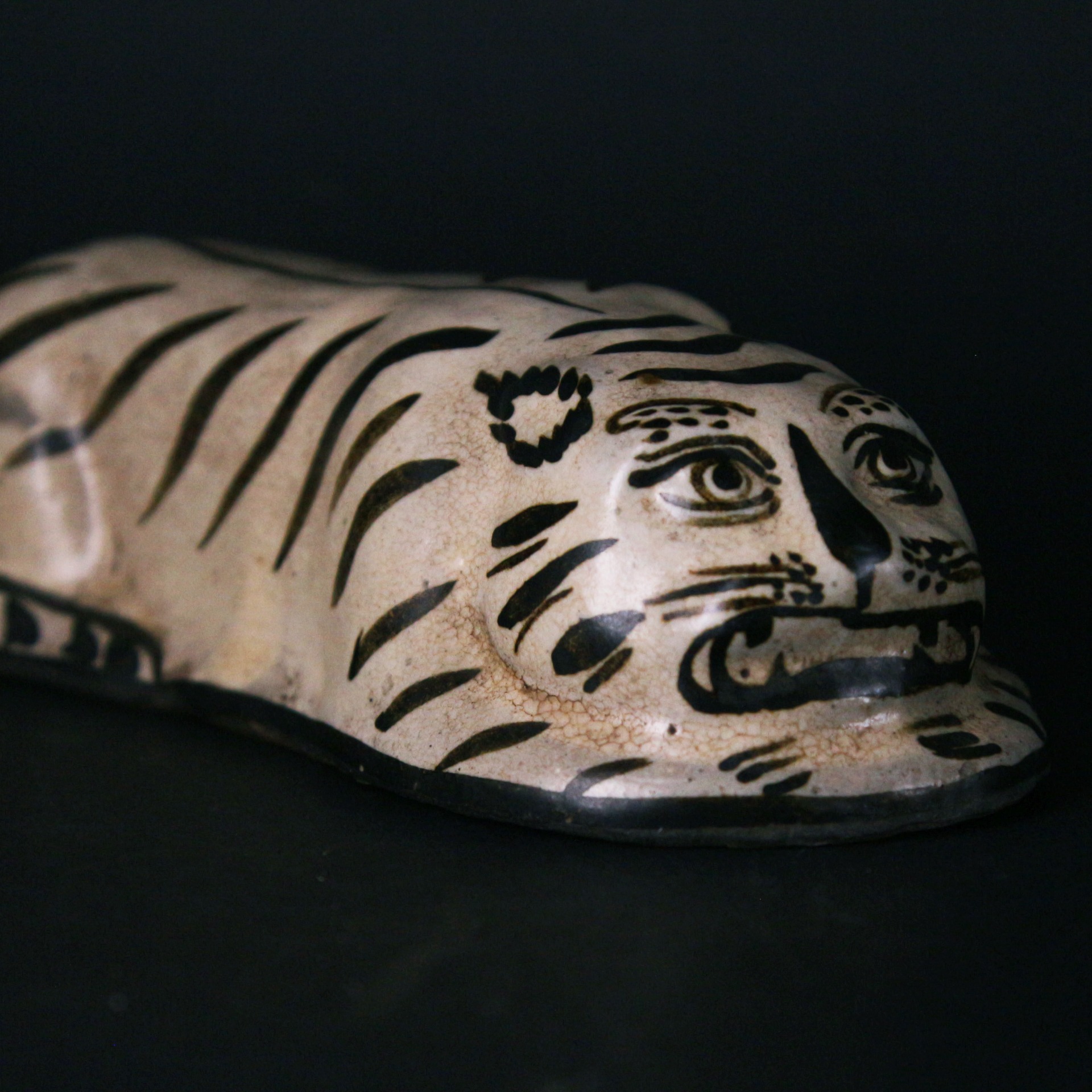 此件磁州窯虎形脈枕,造型取臥虎之姿,伏身蜷臥、首部前探,形態生動而富張力。虎面以黑彩描繪,雙目圓睜、獠牙微露,兼具威嚴與稚拙之趣,線條率意而不失神采,充分展現磁州窯白地黑彩器物奔放寫實的民間風格。通體施白釉,釉色溫潤,黑彩對比鮮明,使虎紋更顯醒目有力。