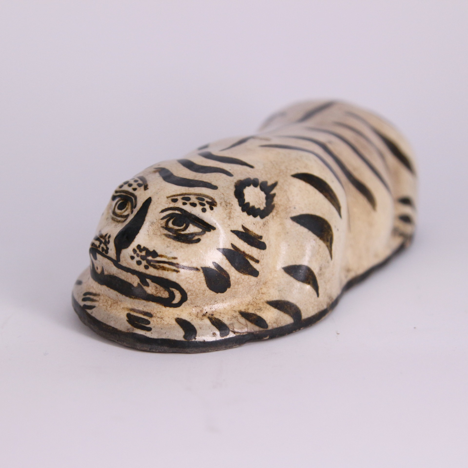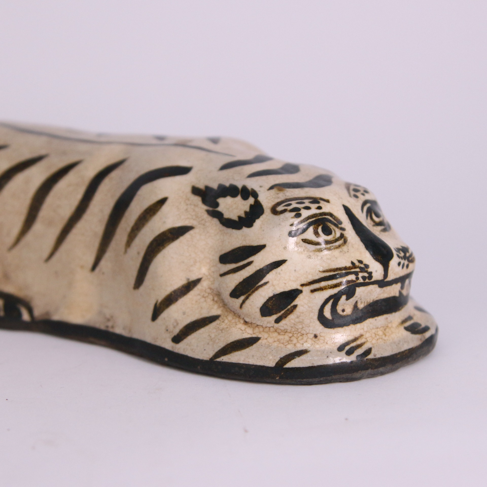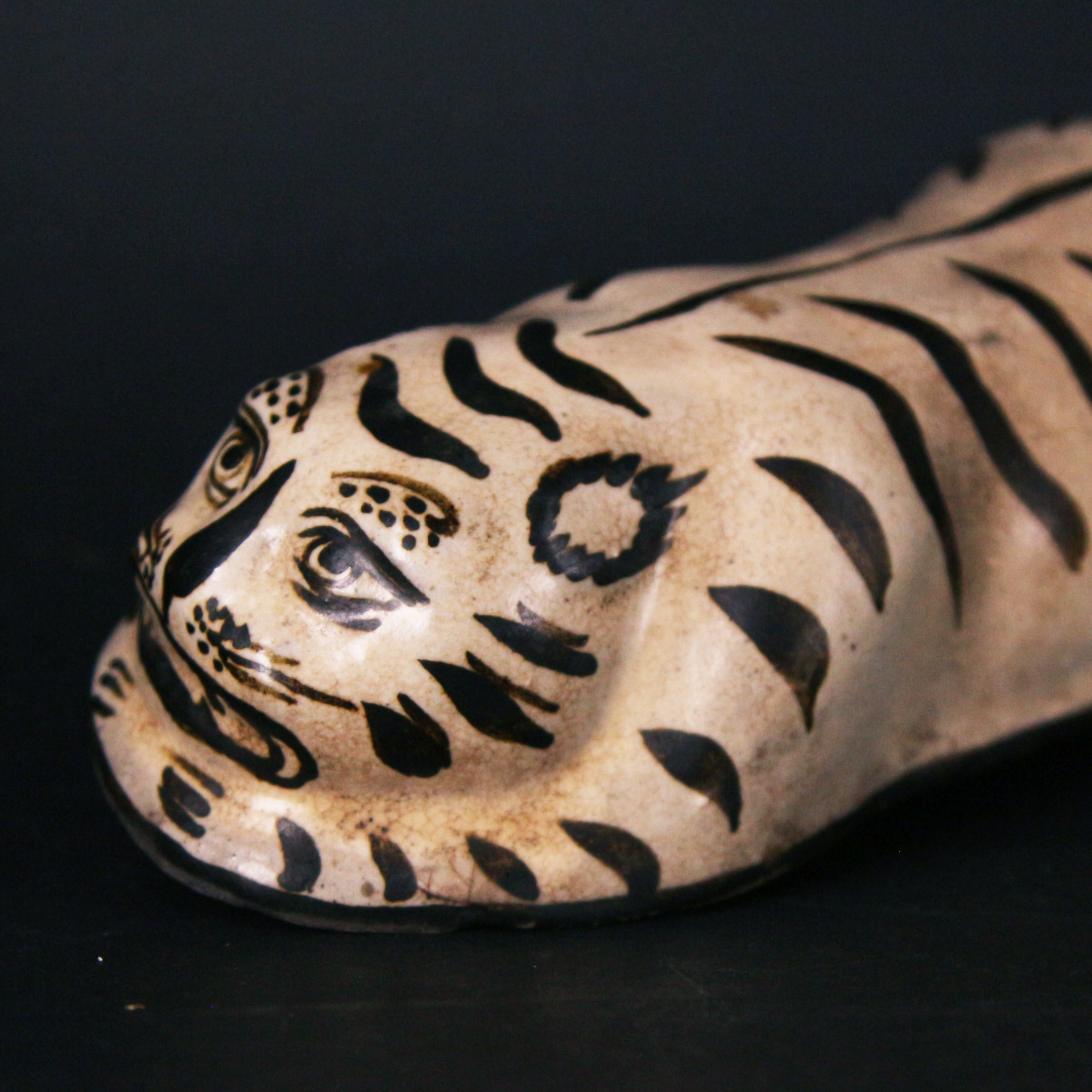 此件磁州窯虎形脈枕,造型取臥虎之姿,伏身蜷臥、首部前探,形態生動而富張力。虎面以黑彩描繪,雙目圓睜、獠牙微露,兼具威嚴與稚拙之趣,線條率意而不失神采,充分展現磁州窯白地黑彩器物奔放寫實的民間風格。通體施白釉,釉色溫潤,黑彩對比鮮明,使虎紋更顯醒目有力。