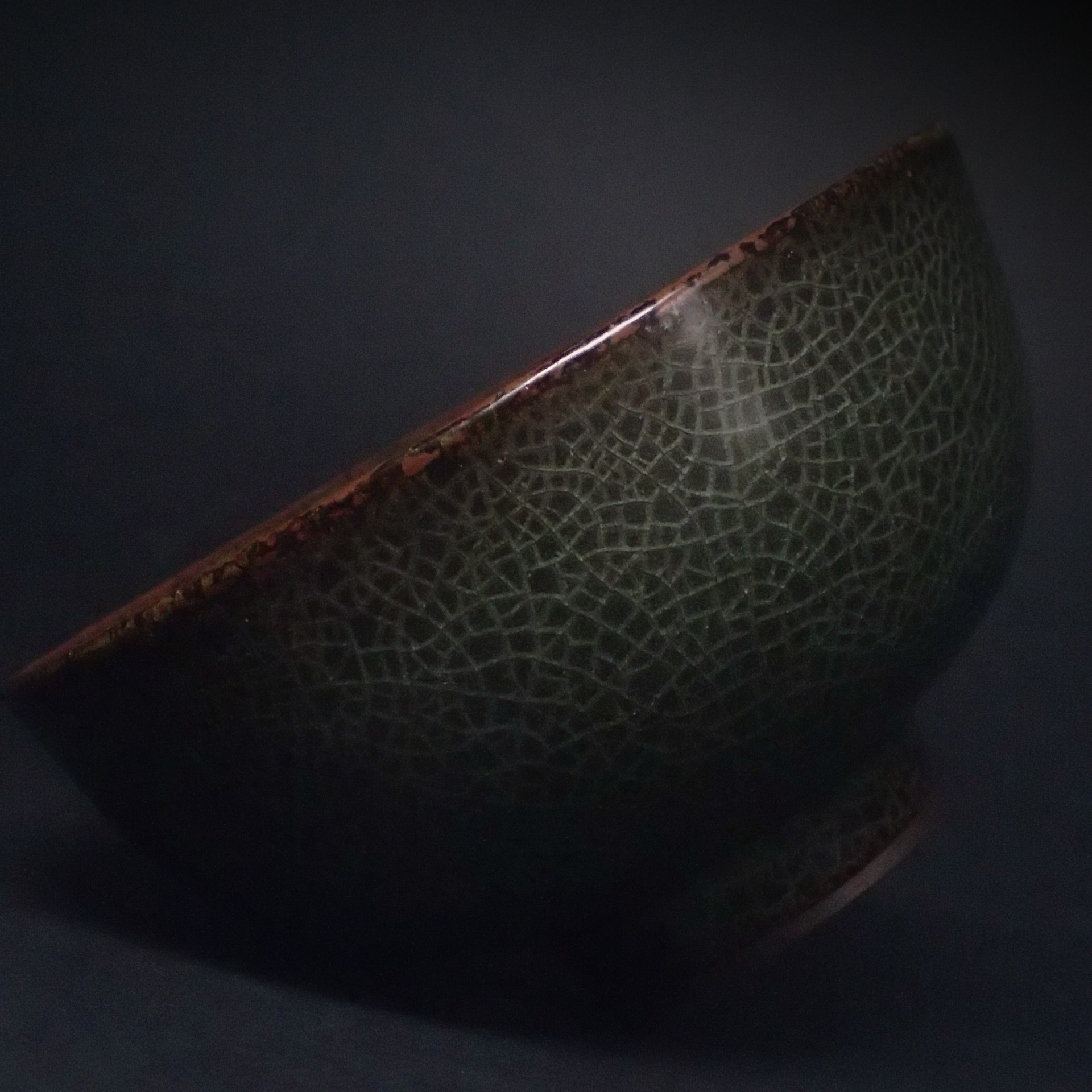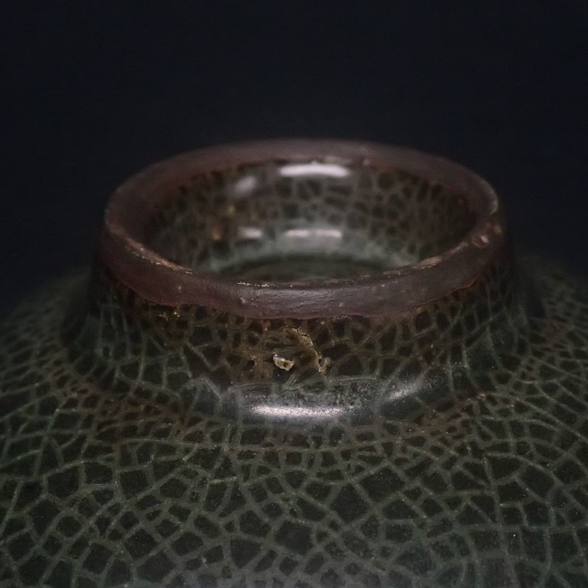 哥釉為宋代五大名窯之一,傳世真品極稀,歷來為宮廷與文人所珍視。龍泉窯仿哥釉作品,並非單純模仿,而是在南宋青瓷體系中,轉化哥釉審美精神,追求含蓄、靜謐與歲月感。此杯釉裂層次分明,氣韻溫潤,既具文人案頭的雅賞意味,亦體現宋人「以不完為美」的審美境界,耐人細品。