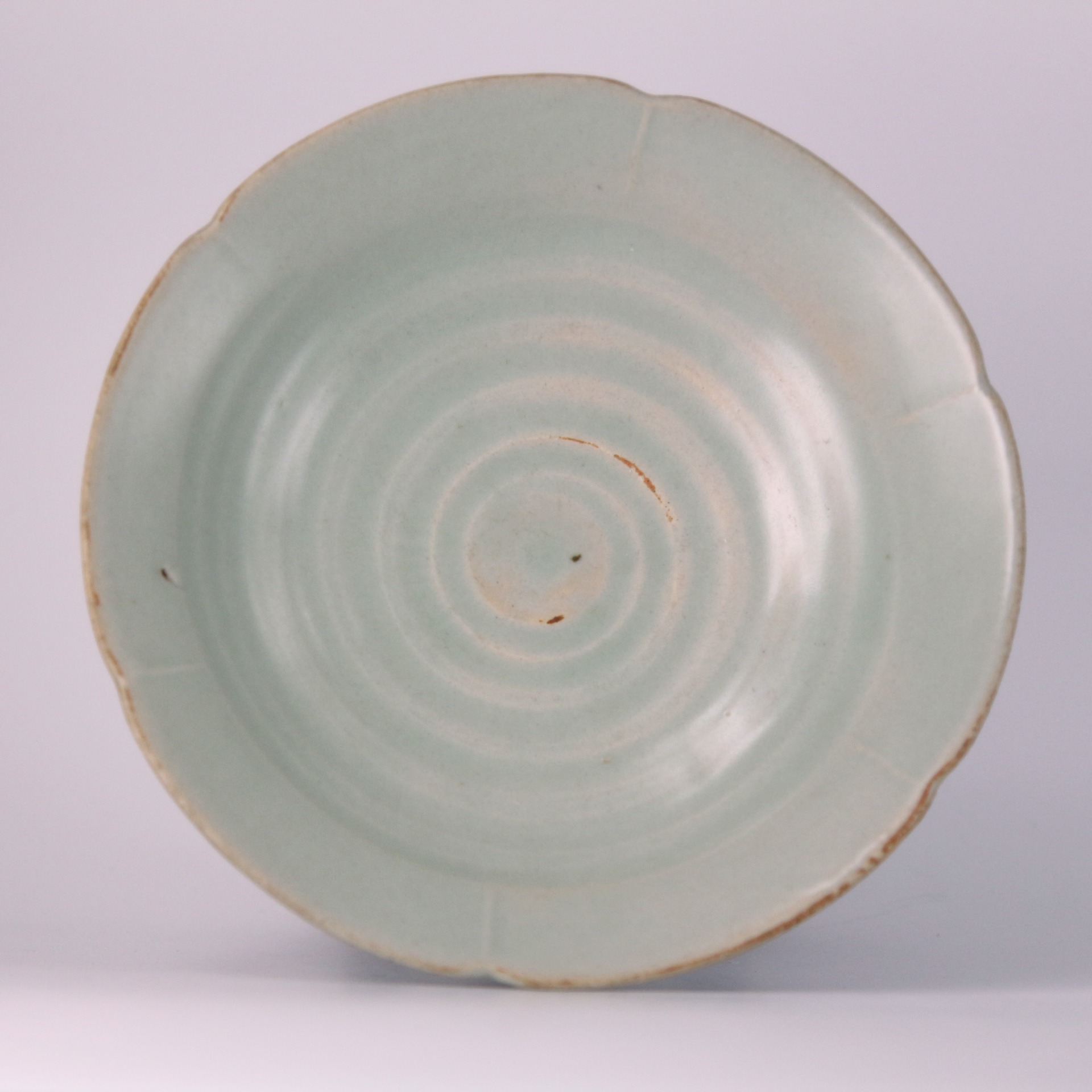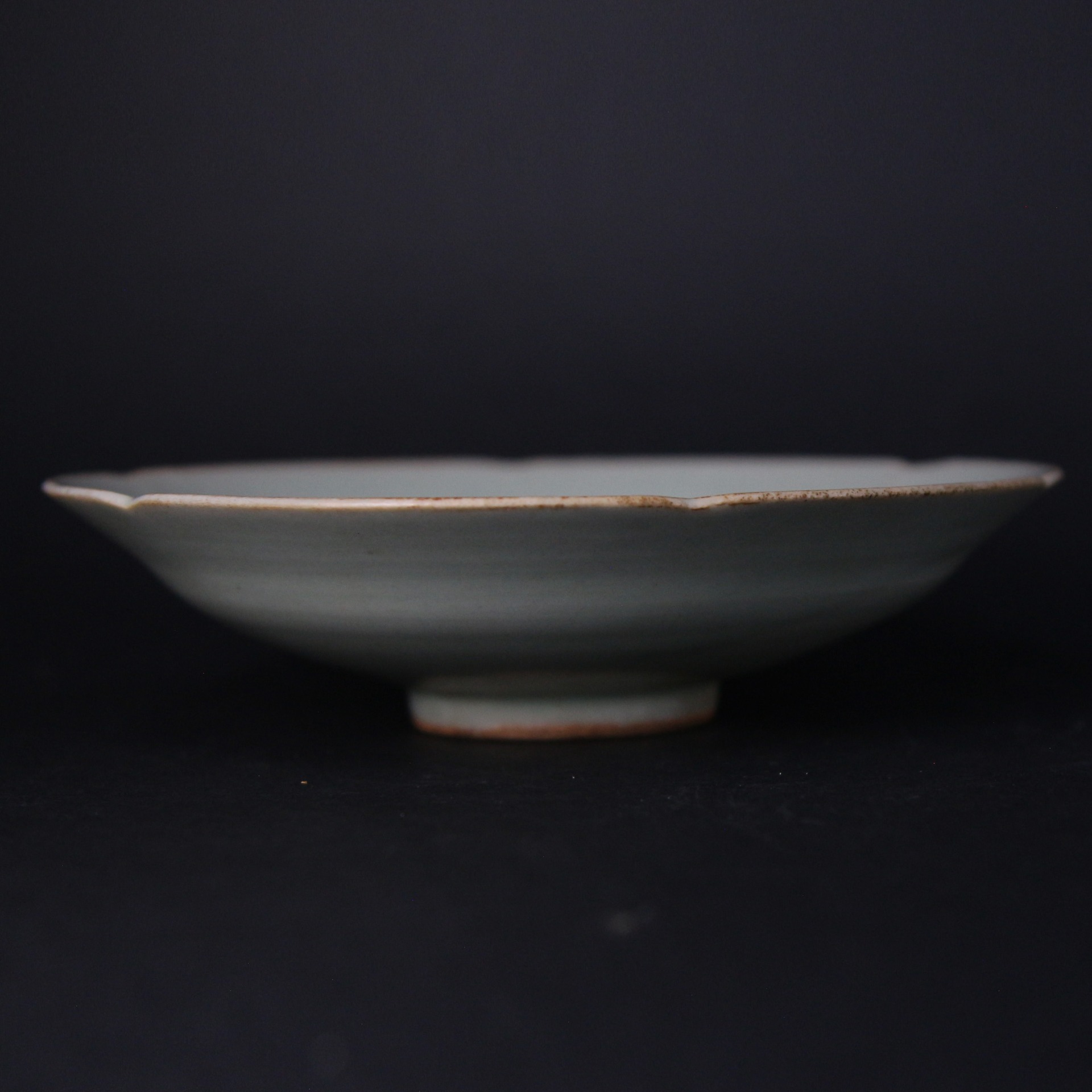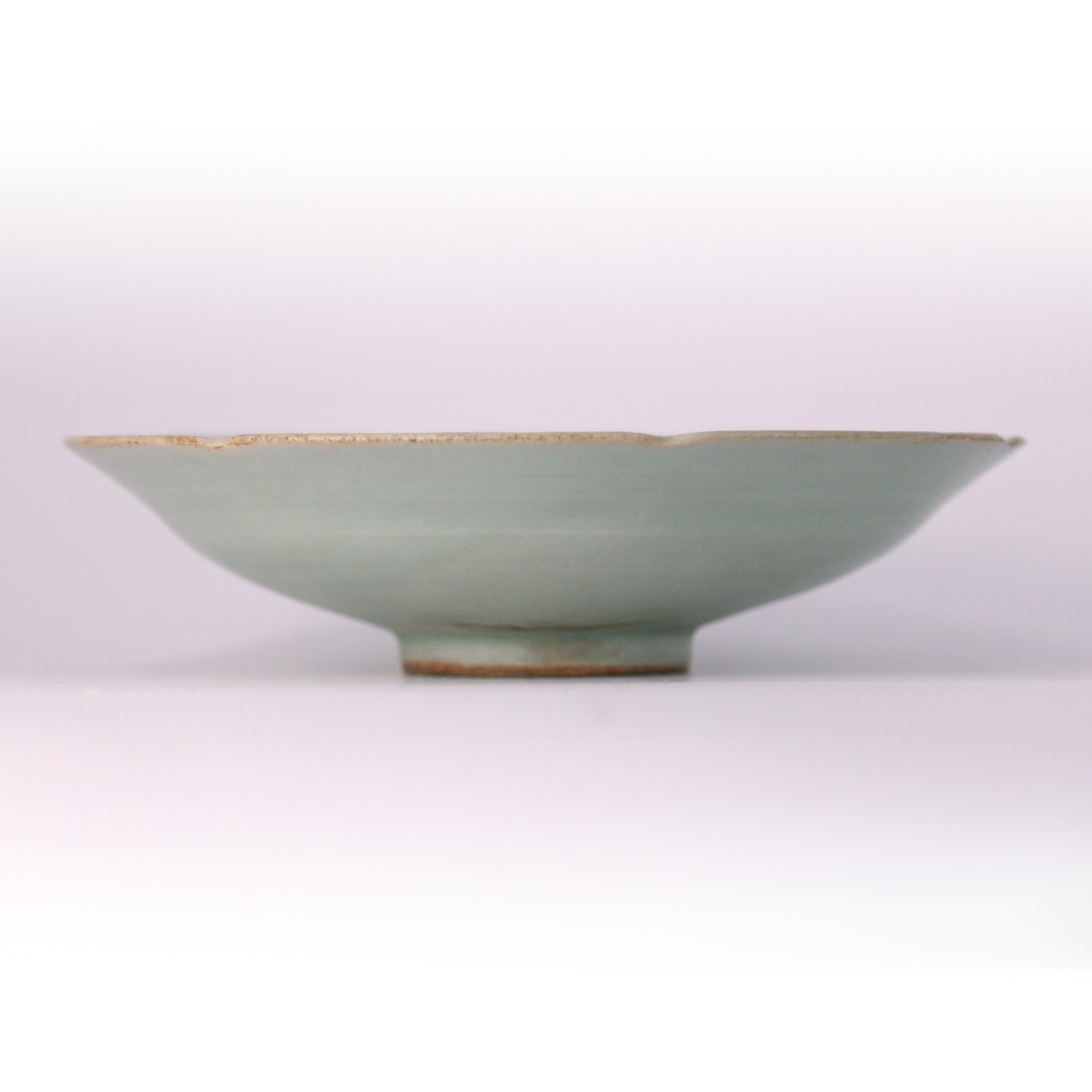 此盤出自宋代龍泉窯,以典雅的梅子青釉覆燒,色澤清潤柔和。器內自中央向外呈現六道環形筋紋,層層遞進,如水波般自然流動,展現胎土旋制時的匠心與節奏感。盤沿呈似花瓣的六瓣形,邊緣處自然透出泥色,與溫潤青釉相映成趣,整體氣息素淨大方。