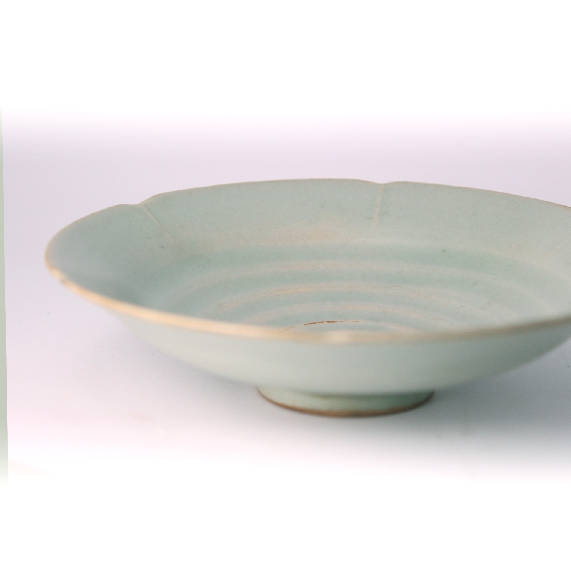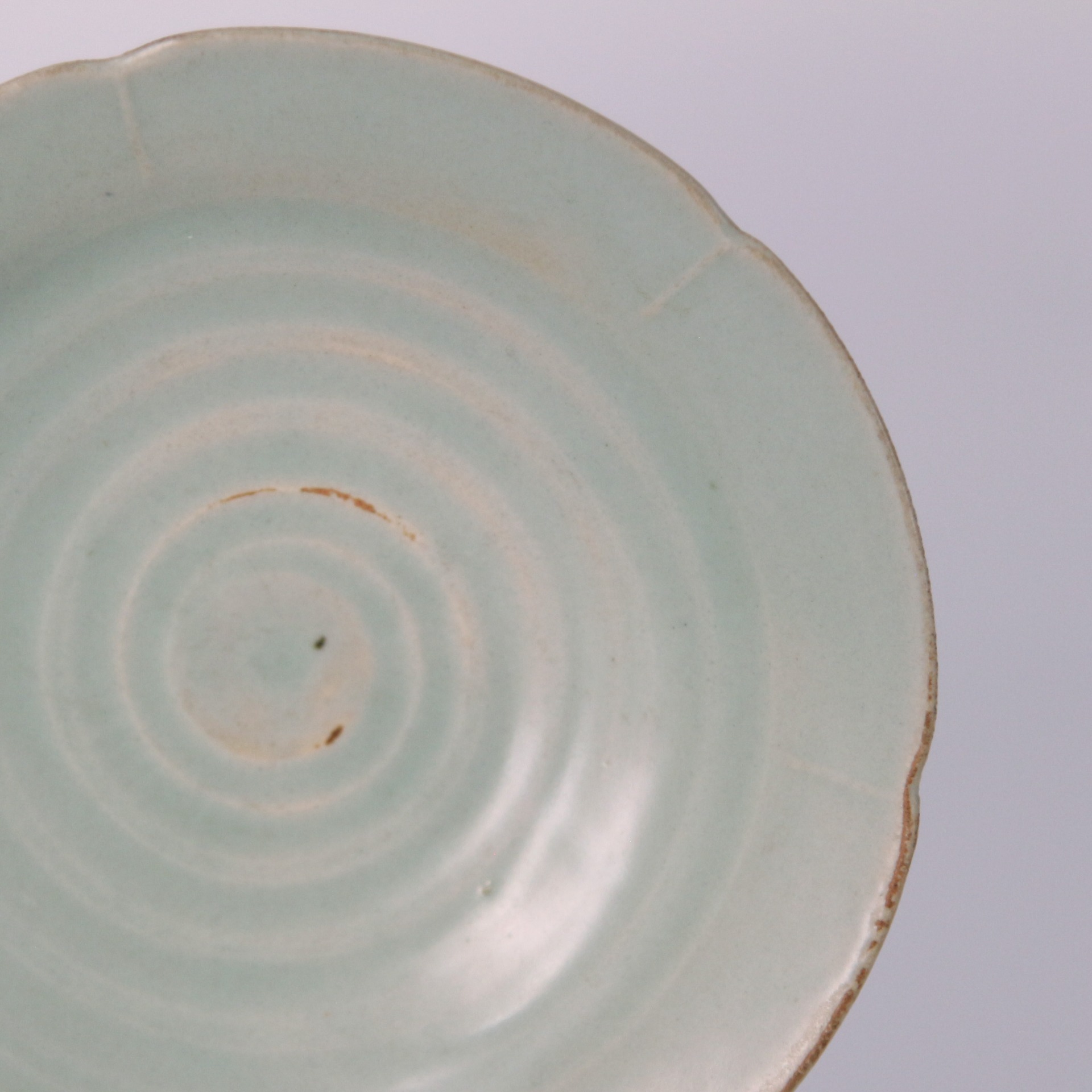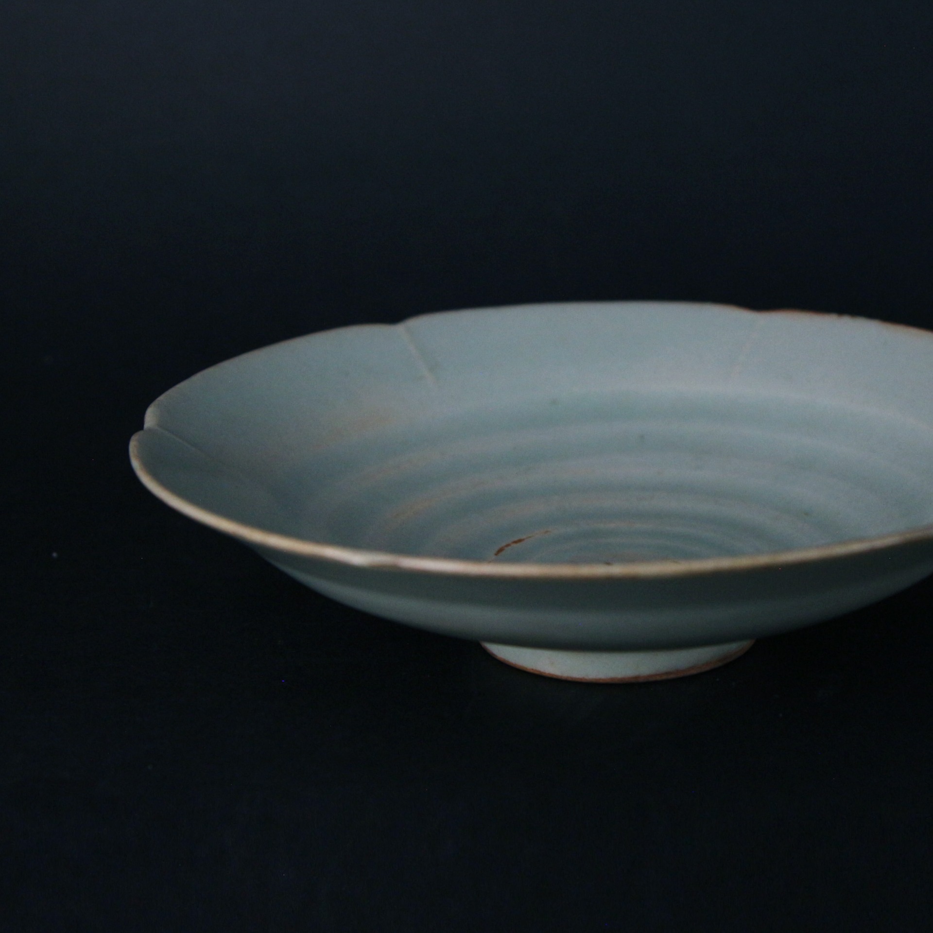 此盤出自宋代龍泉窯,以典雅的梅子青釉覆燒,色澤清潤柔和。器內自中央向外呈現六道環形筋紋,層層遞進,如水波般自然流動,展現胎土旋制時的匠心與節奏感。盤沿呈似花瓣的六瓣形,邊緣處自然透出泥色,與溫潤青釉相映成趣,整體氣息素淨大方。