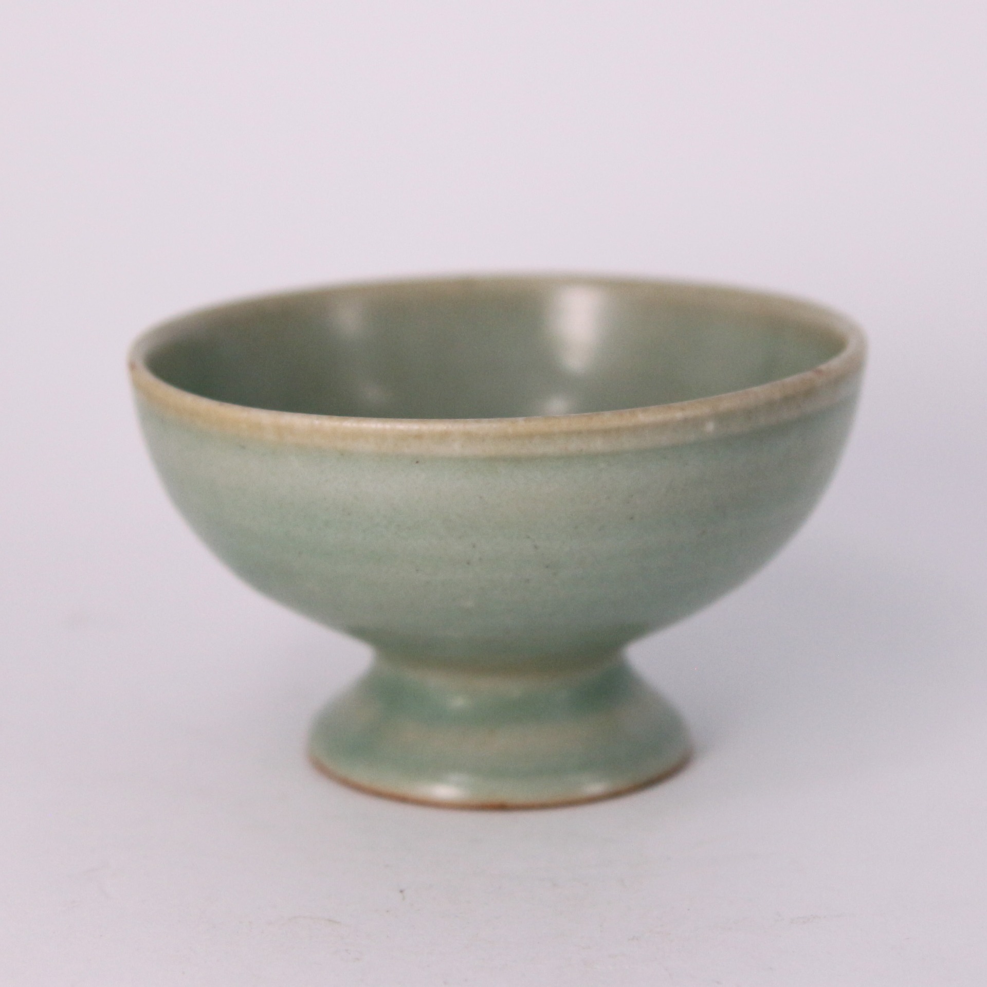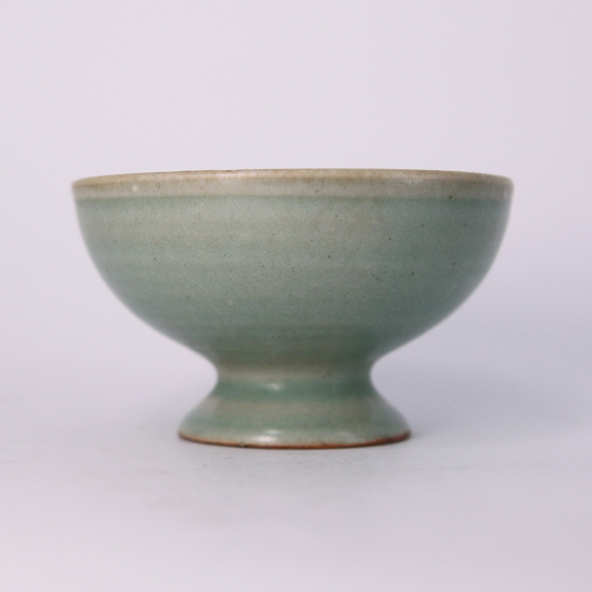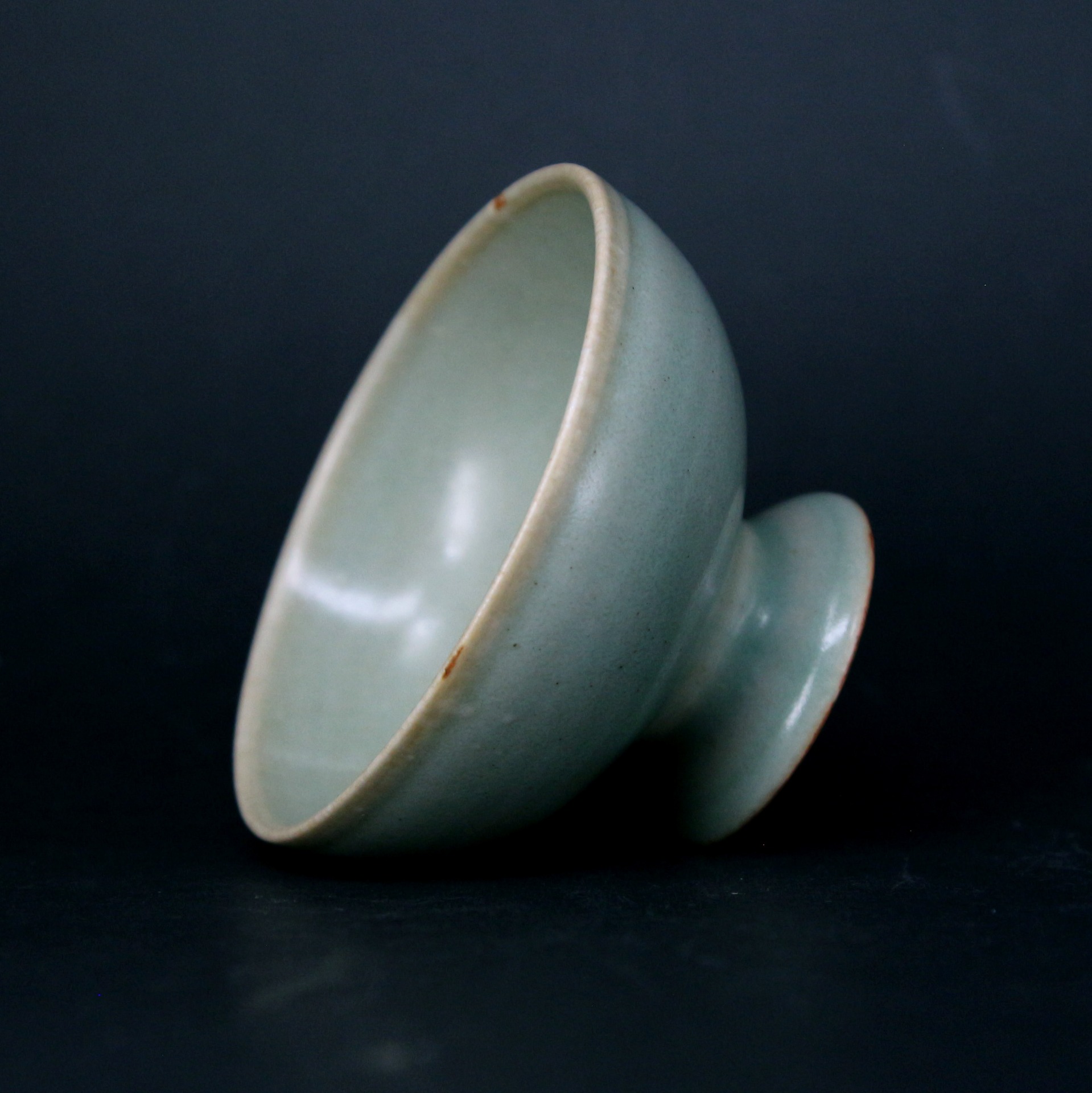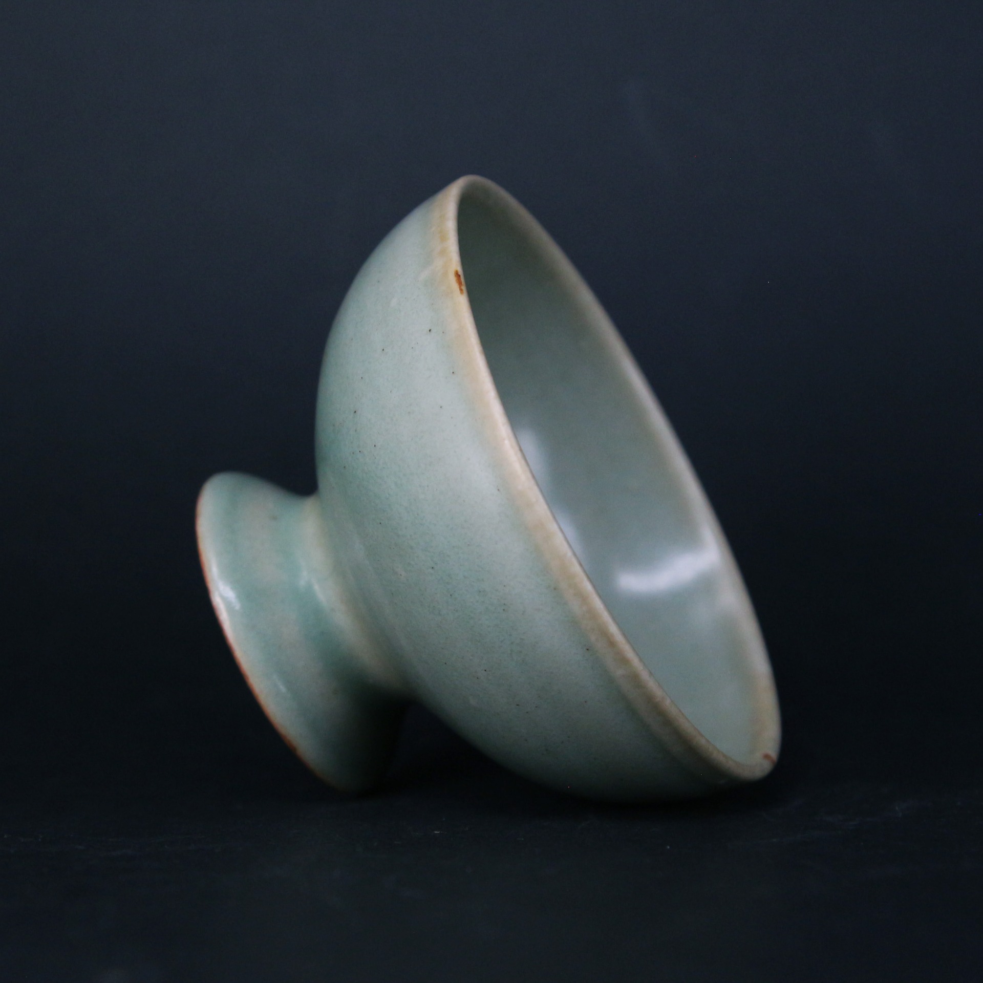 高足杯(又稱把杯)在元代極為盛行,受草原游牧文化影響而成為時尚,但在宋代已可見其雛形,作為文人雅士案頭的飲酒器或盛果器。相較於元代產品的胎體厚重與多樣化裝飾(如竹節足、刻劃花),宋代的龍泉高足杯更追求單純的釉色美與簡潔線條。其圈足通常修飾平整,足底露胎處常因高溫氧化呈現朱砂色,與翠綠的釉面形成鮮明對比,體現了宋代「君子如玉」的審美理想。