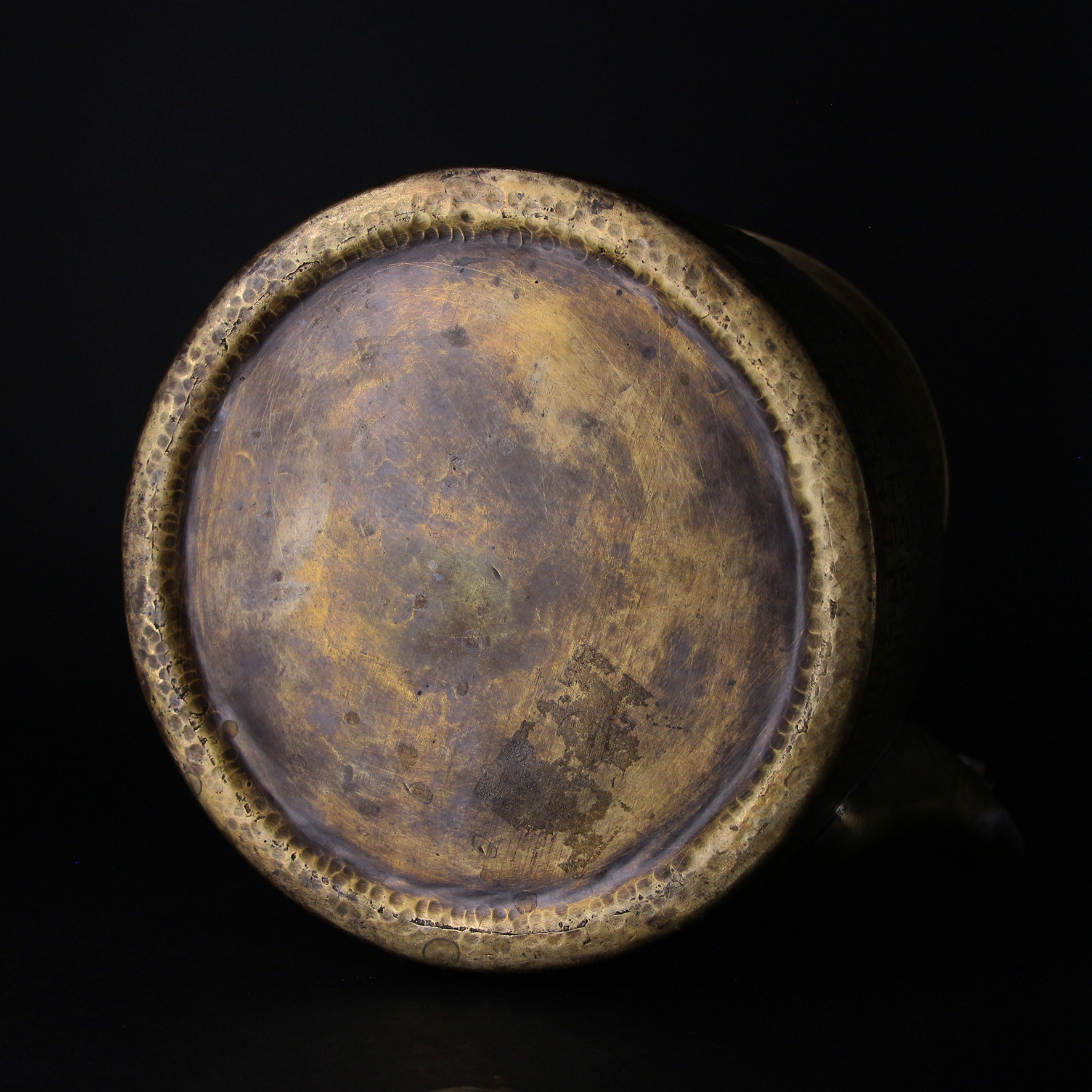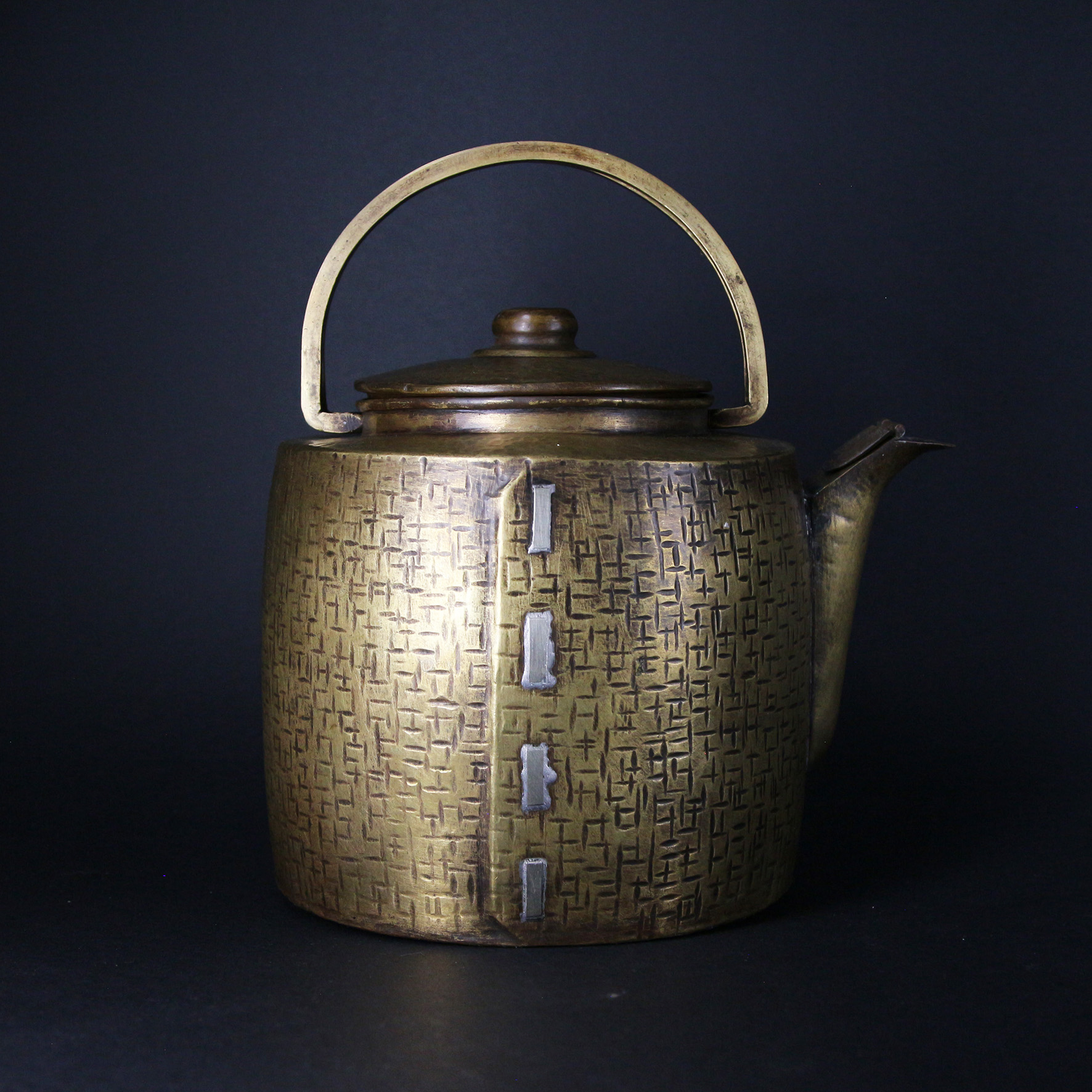 這是一把造型沉穩、工藝精湛的日本手打銅壺,主要用於燒水或泡茶。壺身採用傳統的鎚起技法 (Tsuiki),由匠人以一鎚一擊手工敲打成型,展現出獨特的方格或網狀紋理,不僅是視覺上的美感,更凝聚了職人的時間與心力。銅壺外部經過特殊的漆金(著色)處理,使其呈現出溫潤、帶有歷史感的深黃銅色澤,而非單純的亮銅色。壺蓋和提把則多為黃銅或相同色系的銅合金,整體風格古典而雅致。
