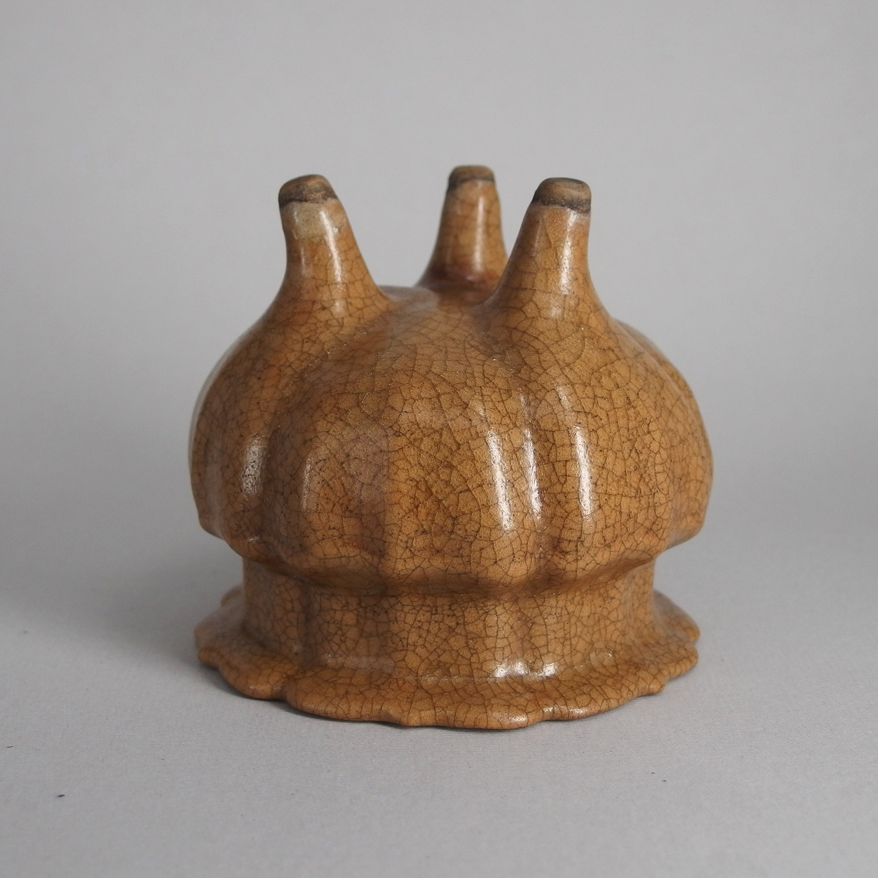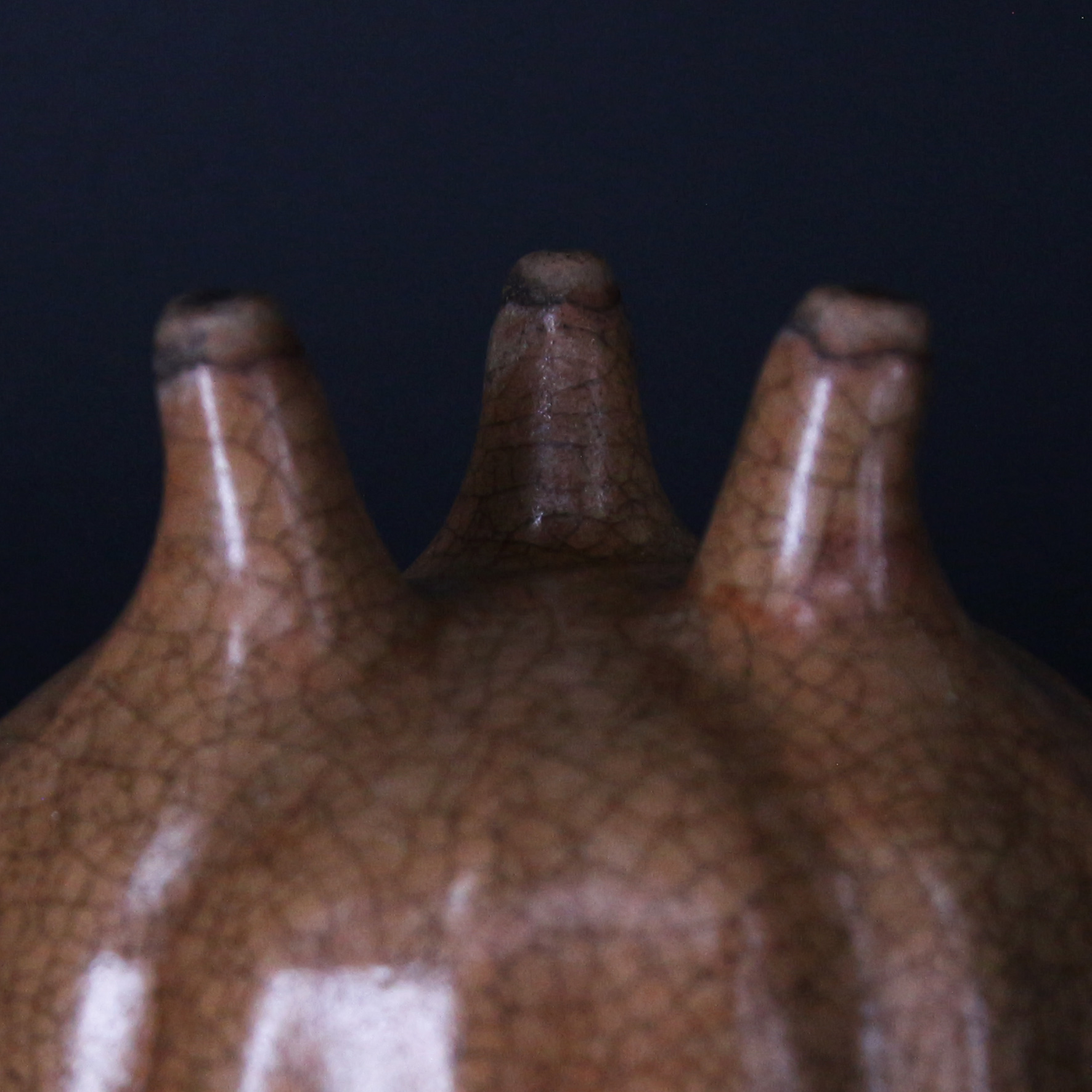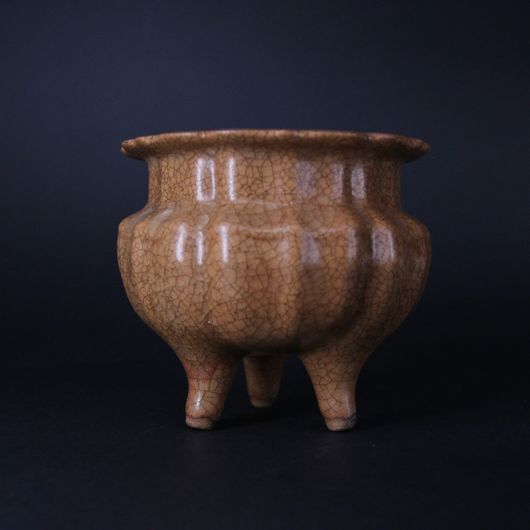 哥窯素以"金絲鐵線"開片著稱,此件香爐紋理清晰分明,釉色淡雅溫潤,展現出宋代美學精神。其沉靜的色調與細膩的裂紋相互呼應,透露出文人焚香、靜心賞器的清逸氛圍。