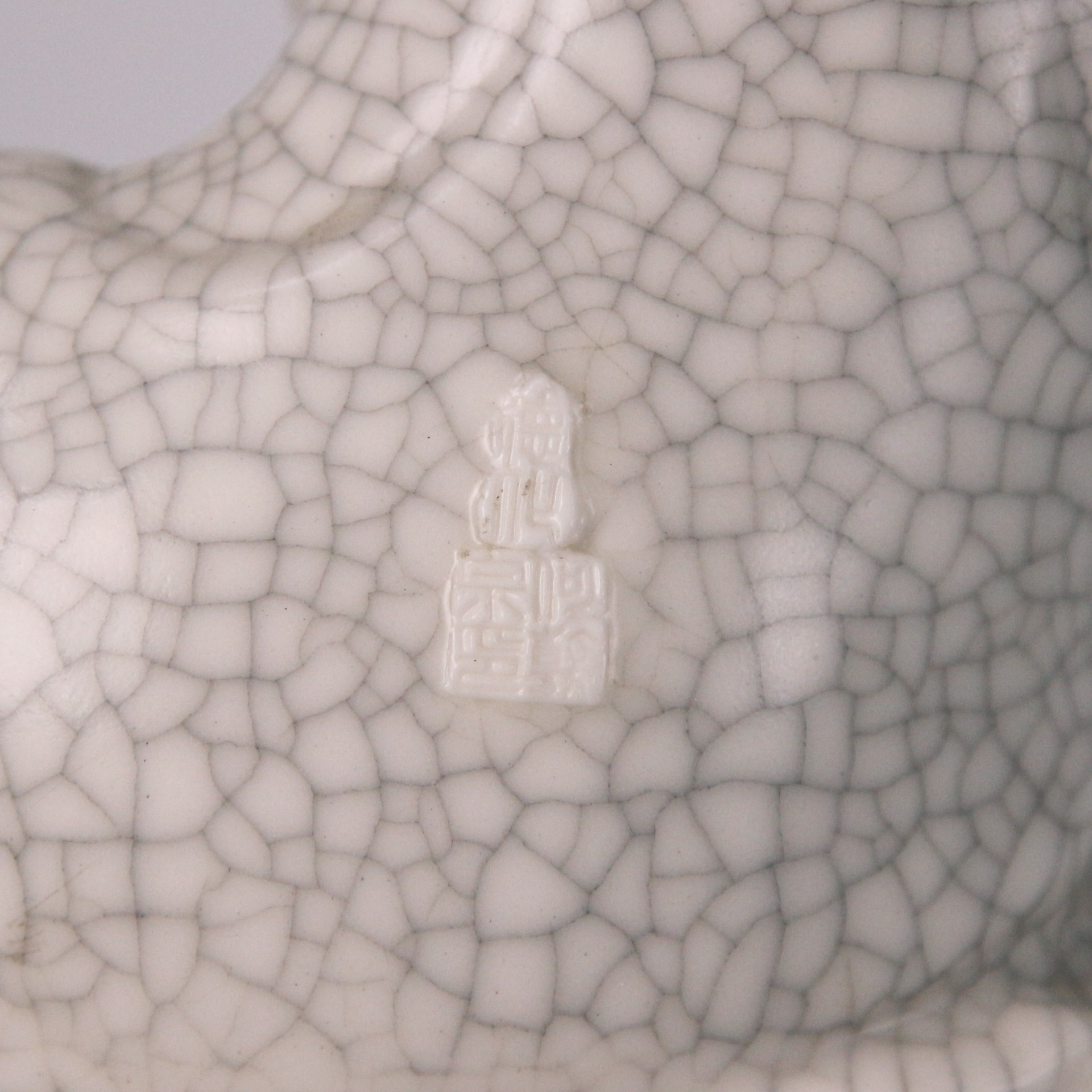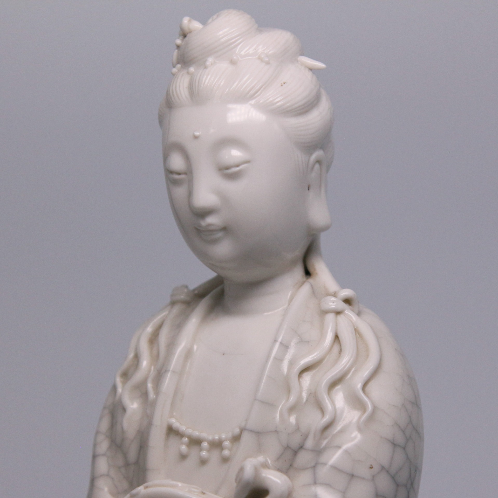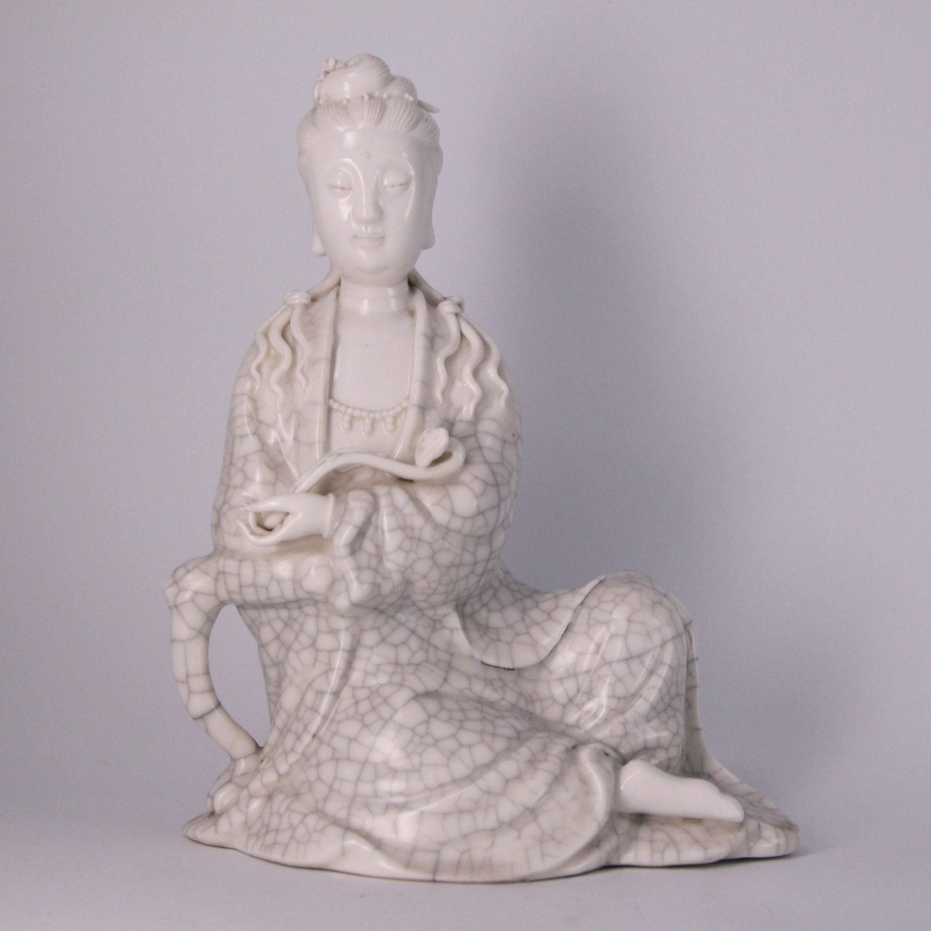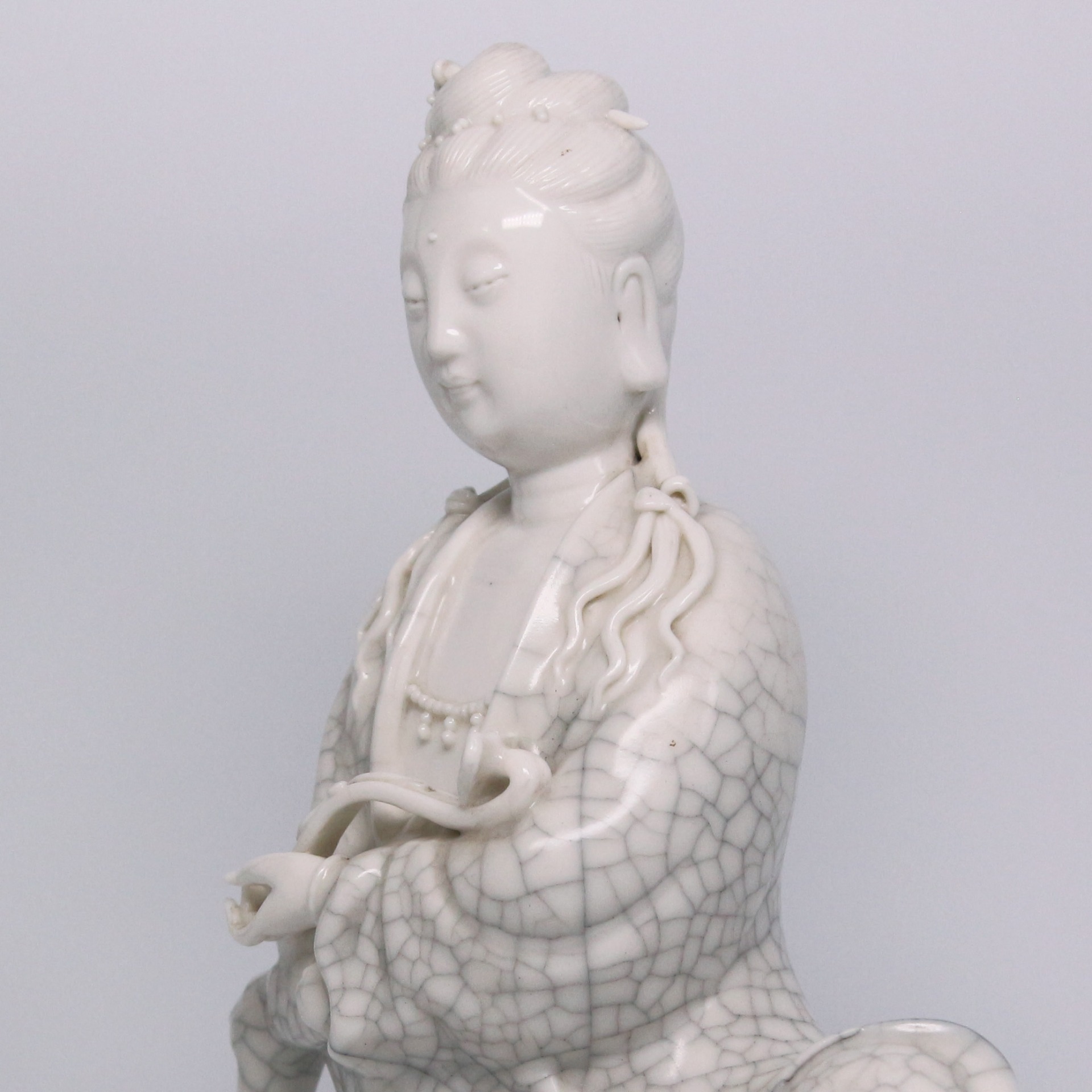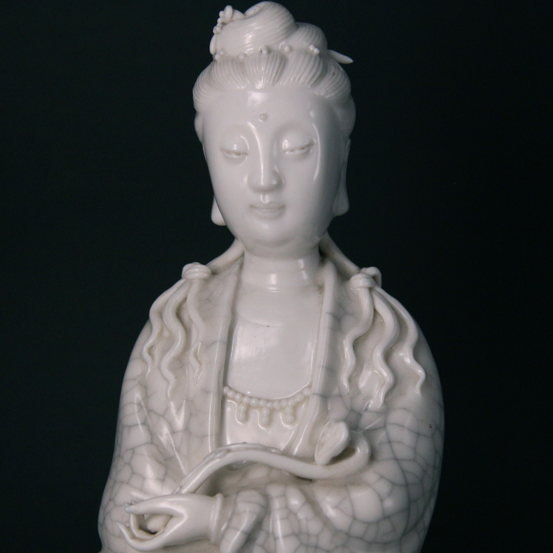 此件德化窯觀音坐像,通體施白釉,釉質溫潤如脂,隱現細密自然的開片紋理,為德化瓷高溫燒成後的典型表現。觀音結跏趺坐,身姿端莊而不拘謹,面容慈和寧靜,五官比例勻稱,衣紋線條流暢柔和,層層垂墜間富有立體感。整體造型兼具雕塑感與瓷質光澤,充分展現德化窯白瓷在人物塑造上的高度成就。