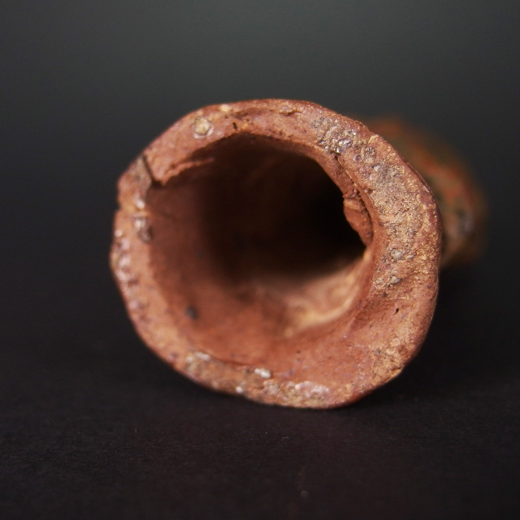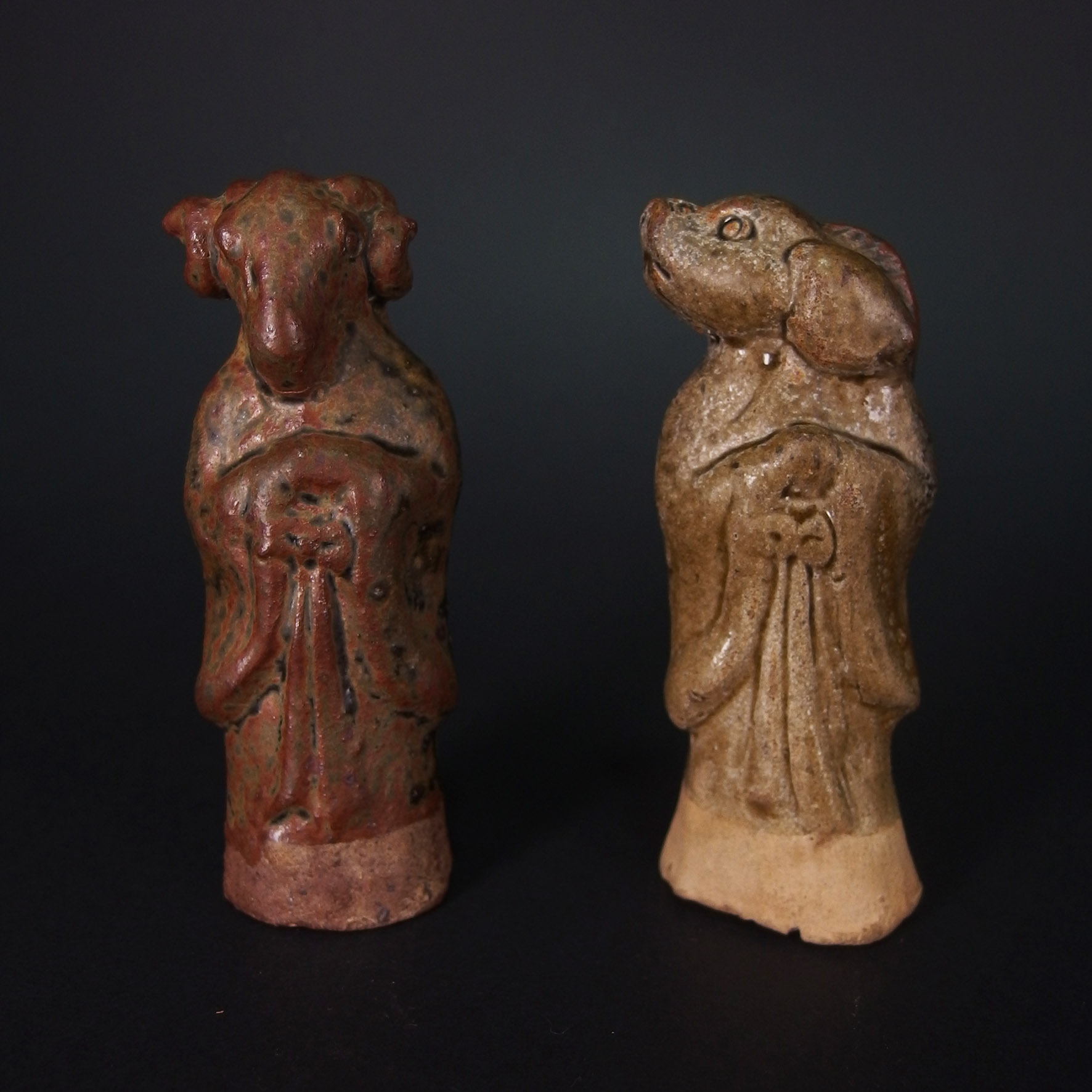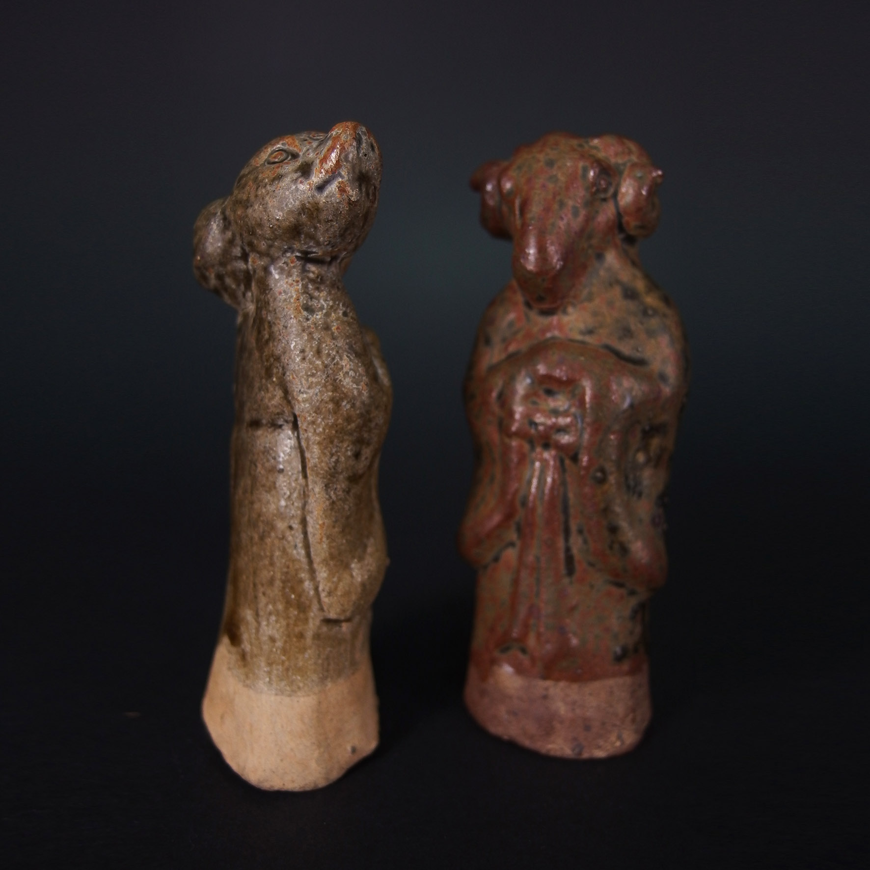 此件明代陶塑以誇張而富趣味的方式,將人身與羊首結合為一體:圓突的羊頭、卷曲的角與深邃眼部,搭配簡化卻清楚可辨的長袍衣褶,使整體呈現樸拙、原始而略帶靈性的視覺效果。胎質微粗、施以紅褐調釉色,局部自然斑駁,呈現年代沉積出的土氣與手工感。