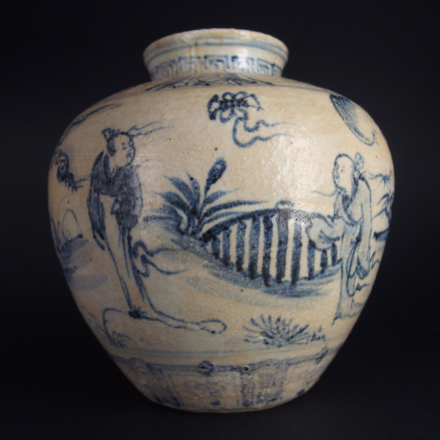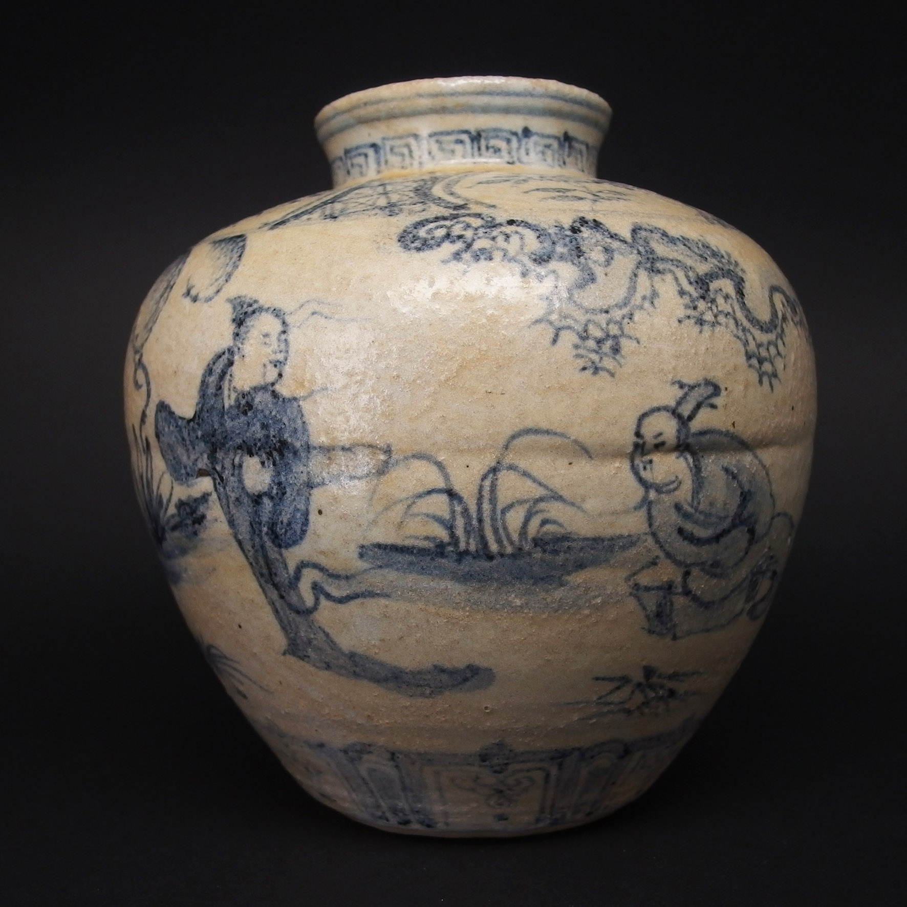 此罐以蘇麻離青繪製,青花發色濃艷沉穩。罐身圓潤豐碩,通體以青花繪山水人物,筆觸灑脫自然 ,人物衣褶流暢,神態悠然,展現明代中期青花瓷繪的典雅風致。