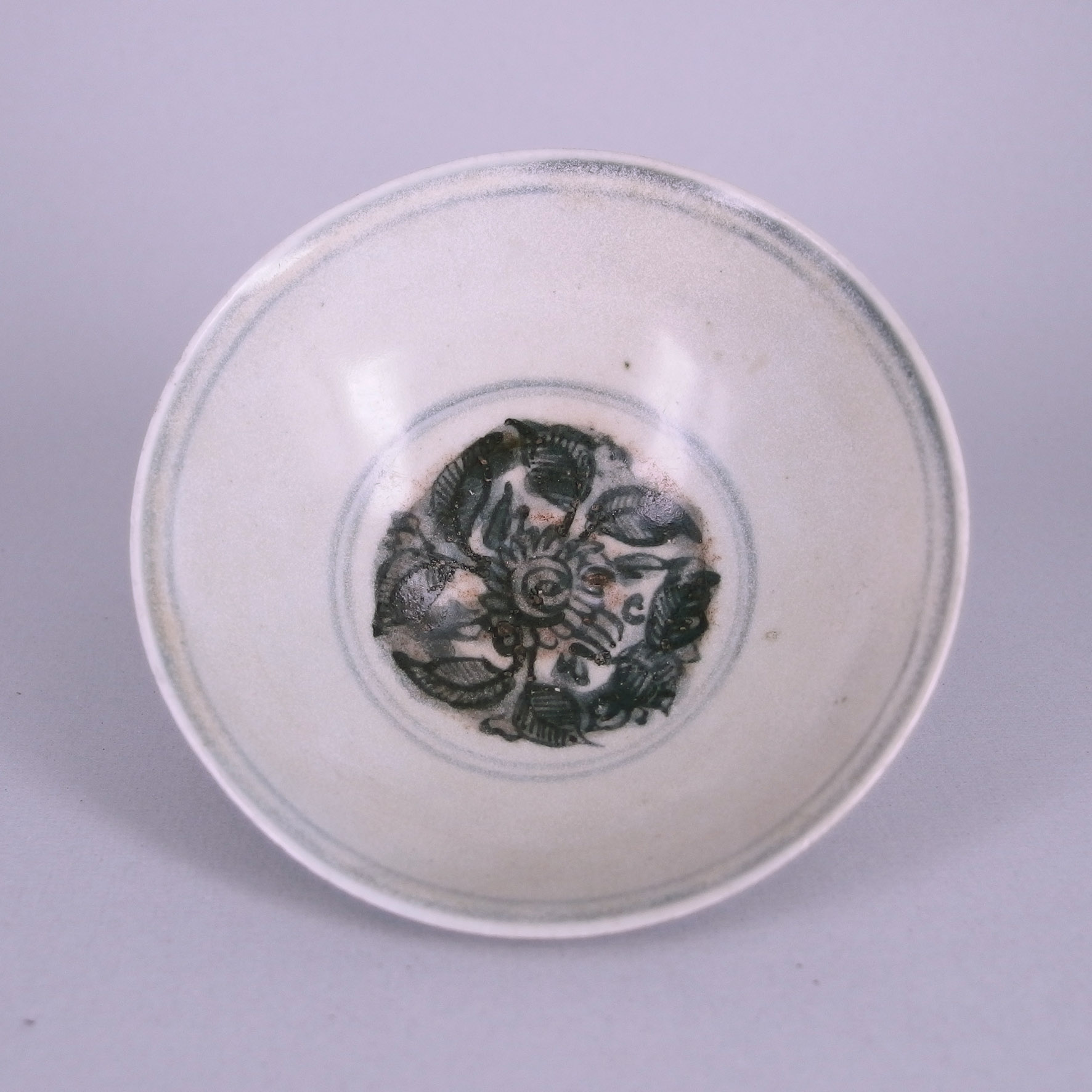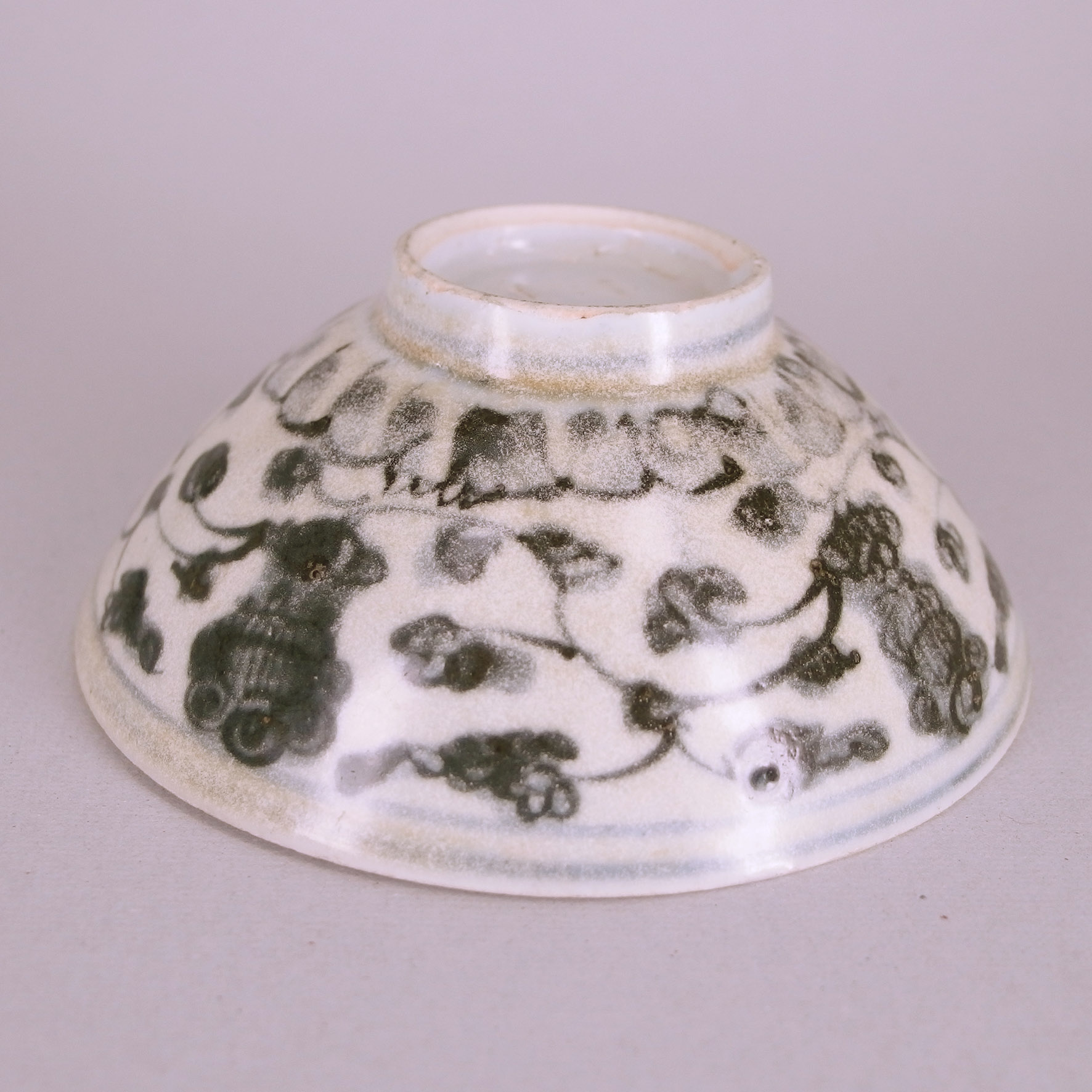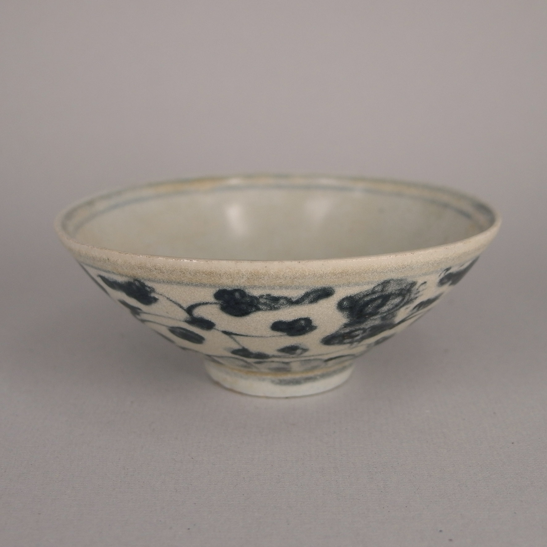 纏枝紋象徵綿延不絕的生命力與吉祥之意,為明代瓷器常見紋樣之一。此碗造型端莊,器形比例和諧,既具實用性,又展現文人器物之雅致,為明代日用與審美兼具的青花佳作。