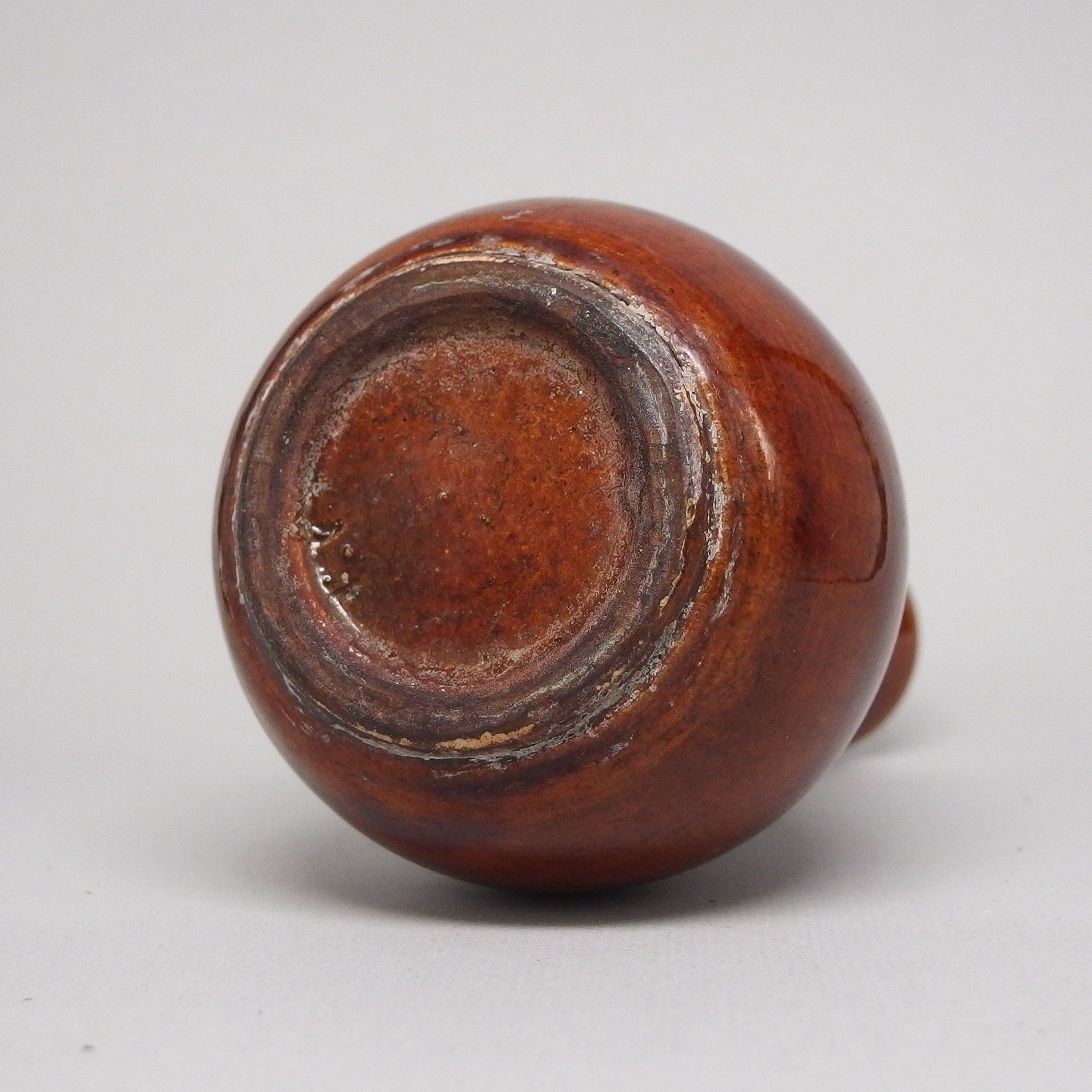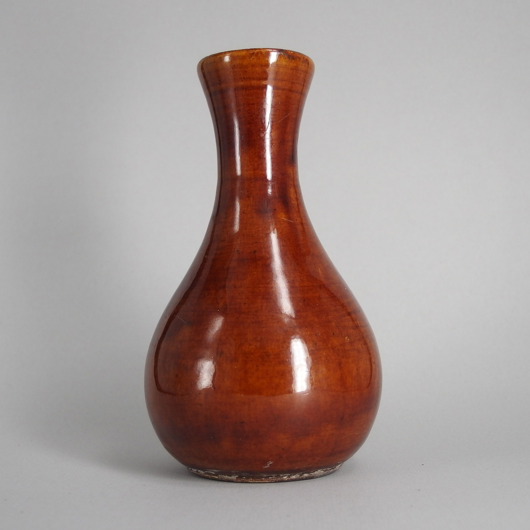 此瓶小口、長頸、豐肩、下收圈足,造型典雅柔潤。通體施醬釉,色澤深沉如栗,釉面瑩潤細膩,呈現出厚重溫潤的質感。瓶身隨光轉動,映現微妙的紅褐層次與內斂光澤,展現出明代高超的控釉技藝與審美格調。