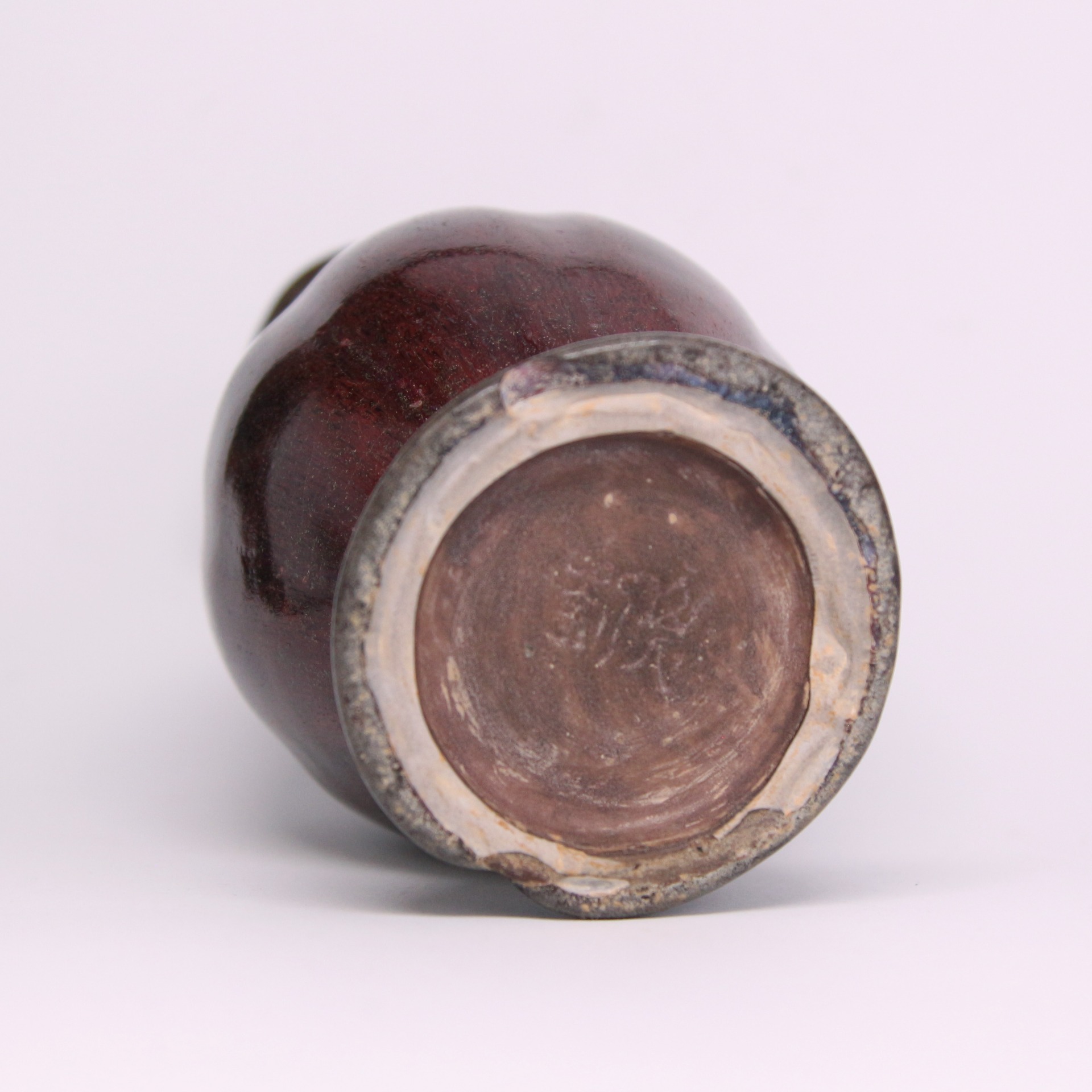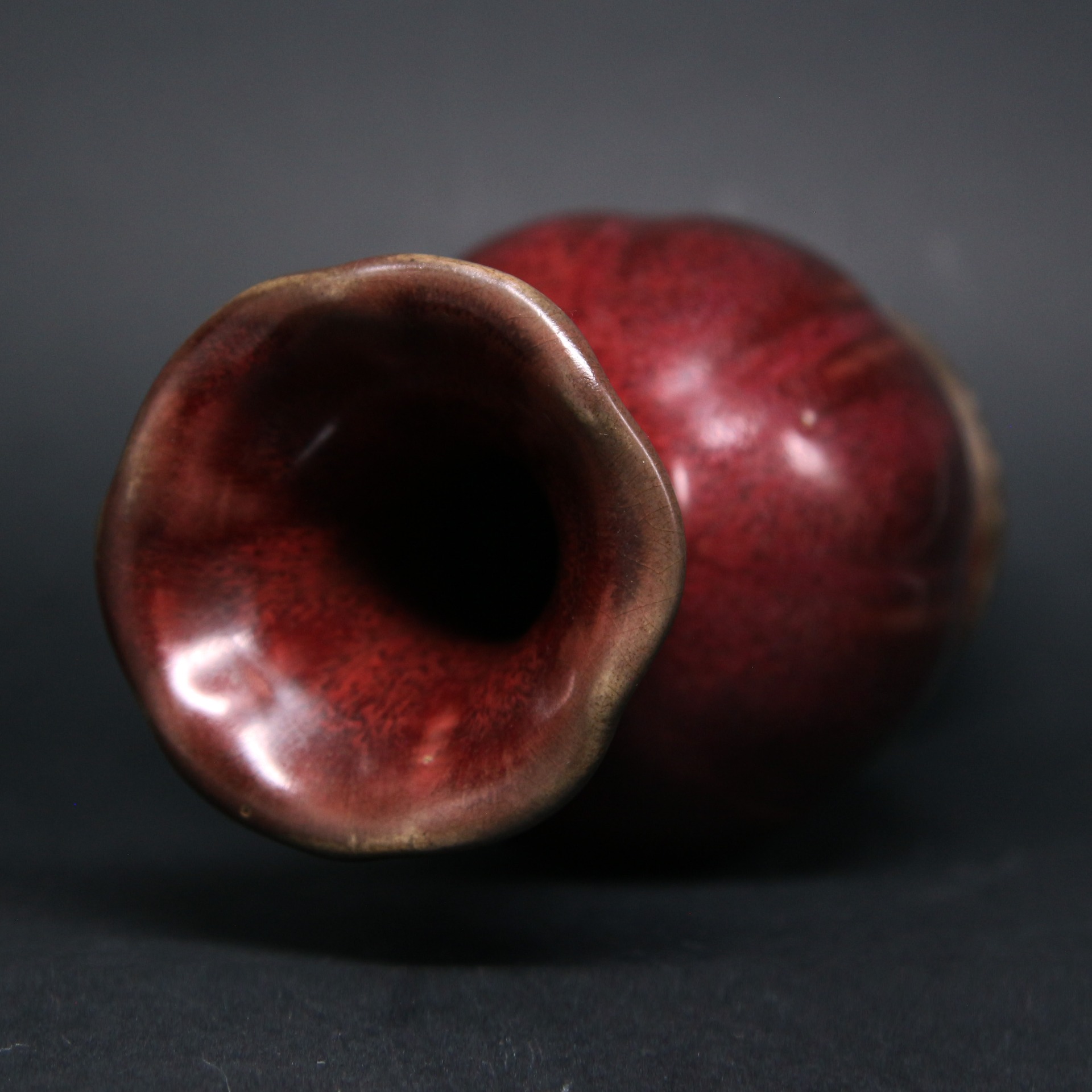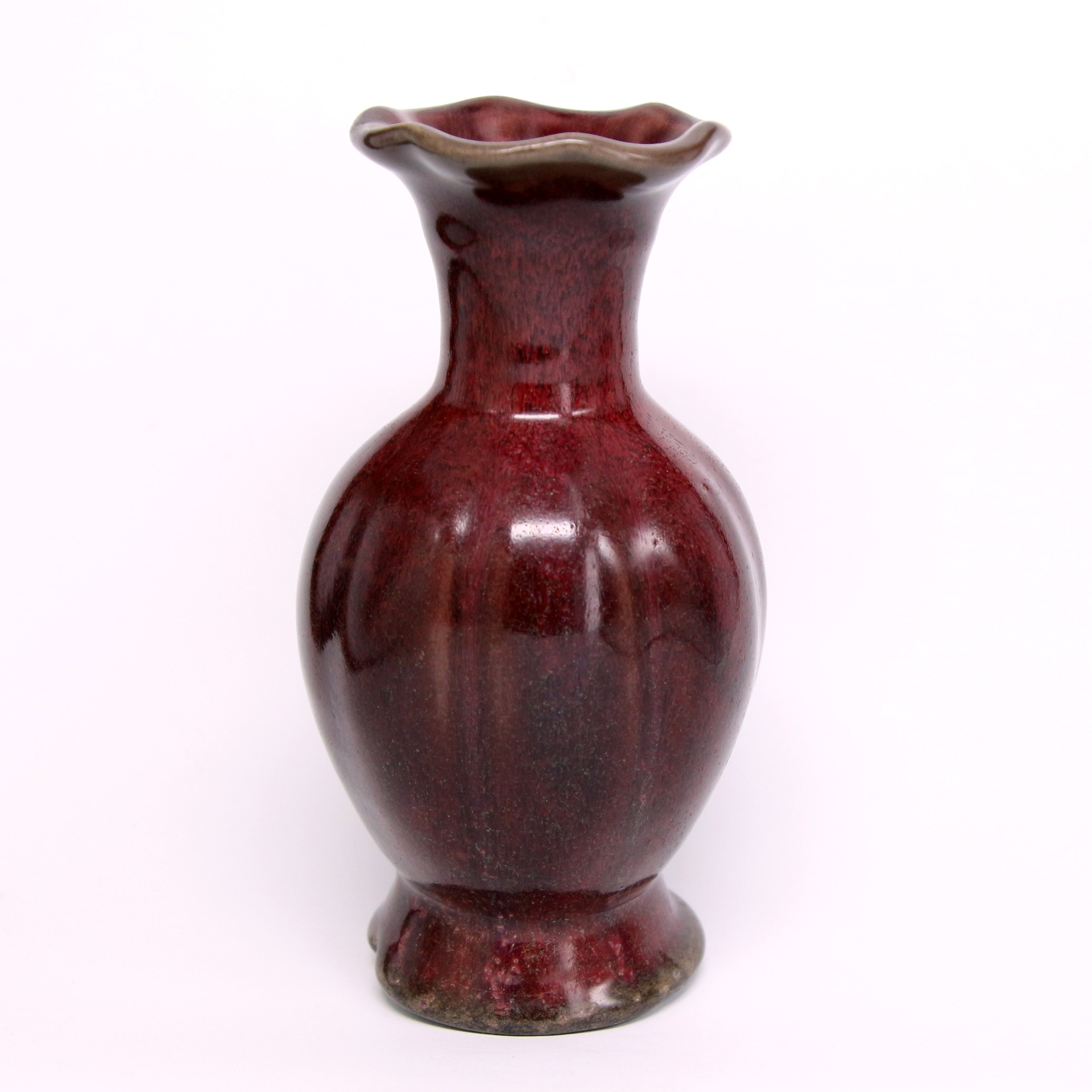 鈞窯在明代承襲了宋、元以來的傳統並有所發展。此瓶反映了明代早期對陳設類鈞瓷的喜好,其乳濁釉層中含有微小的氣泡與晶體,使光線產生折射,形成如玉般的溫潤質感。口沿處因釉層流動變薄,透出褐色或薑黃色的胎骨,俗稱「紫口鐵足」。這類花口瓶多作為宮廷或文人雅士的陳設花器,不僅具備實用功能,更是明代陶瓷藝術中將「自然色彩」與「人工造型」完美結合的代表作。
