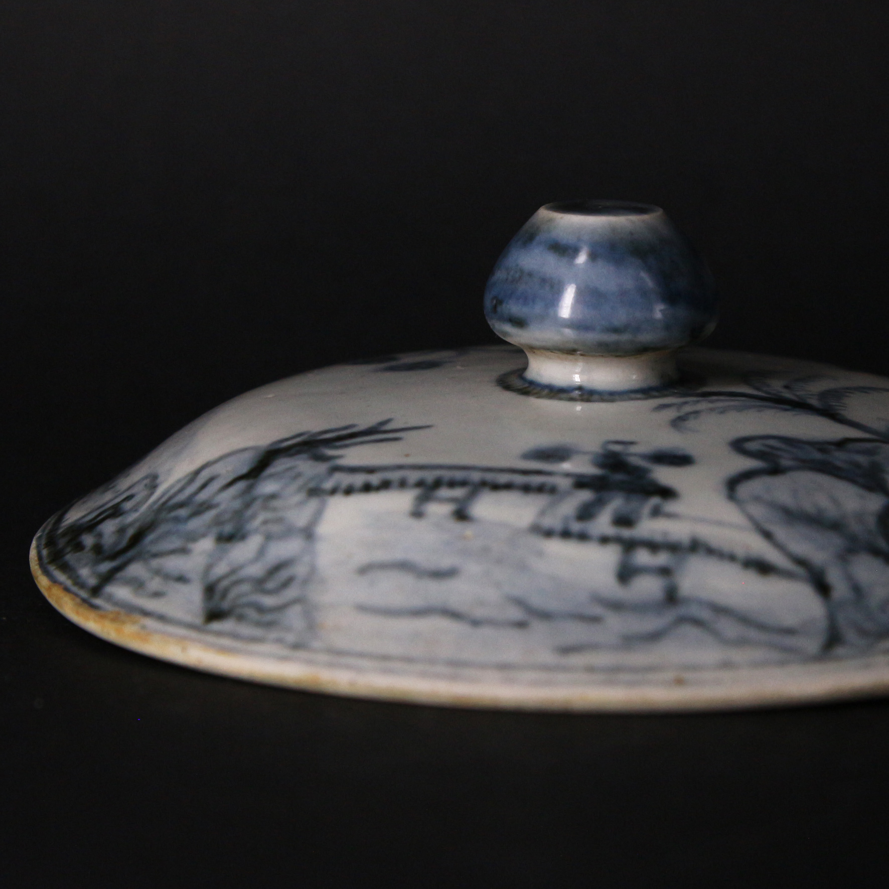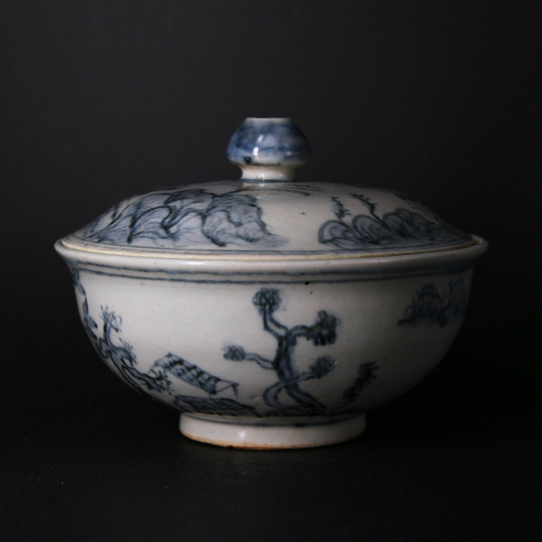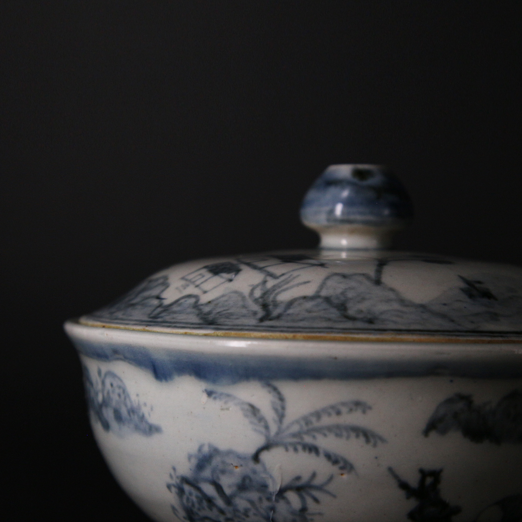 明代青花瓷在永樂、宣德之後走向民窯蓬勃的自由風格,山水題材更是文人審美的象徵。此蓋碗所繪山水雖非宮廷式工筆,而是更接近文人畫的「興筆」、清簡與神韻,流露出當時生活器物中可貴的文化氣息。作為茶席或日常陳設之器,它承載的不僅是功能,也反映明代青花藝術由宮廷走入士人生活的審美轉變,質樸而耐人尋味。
