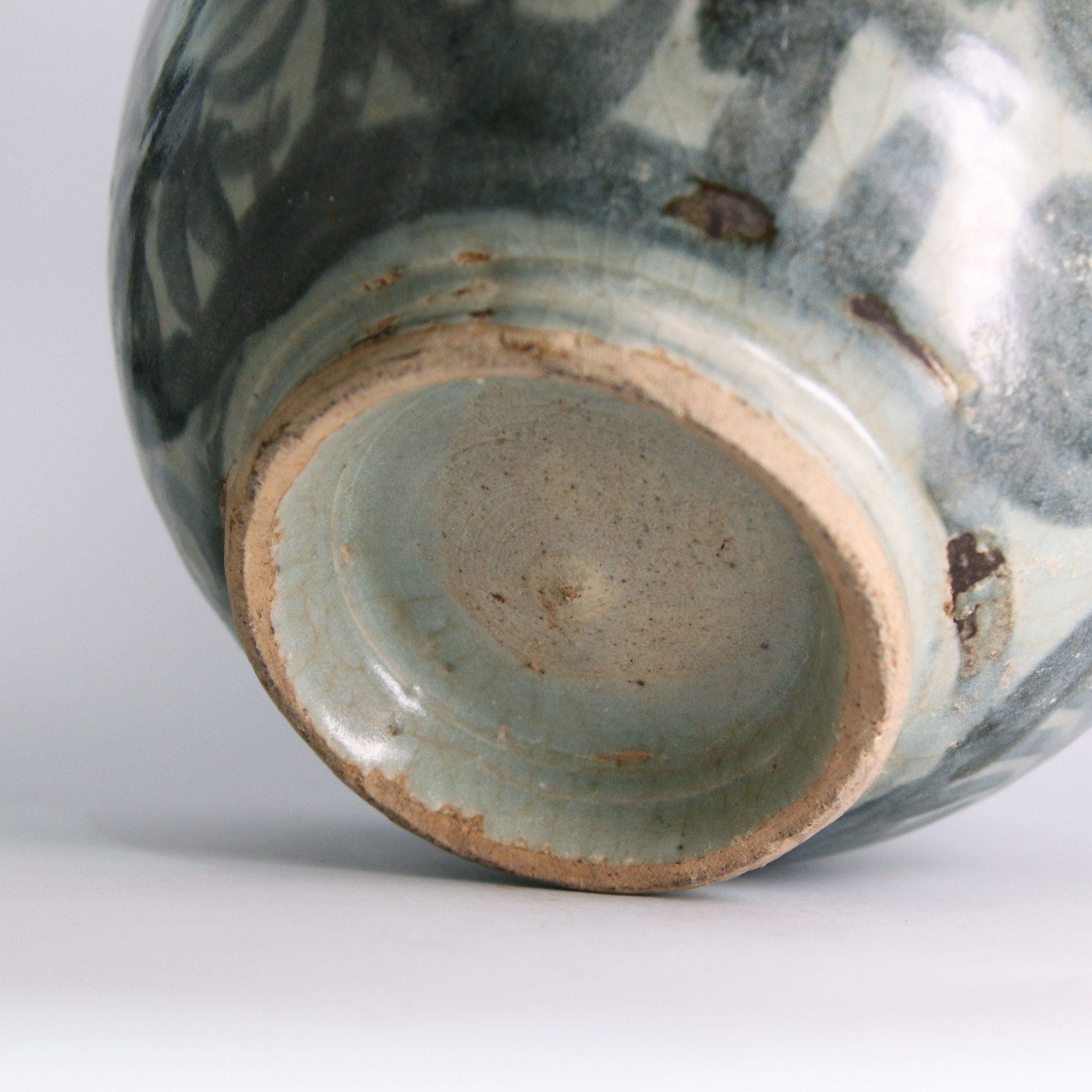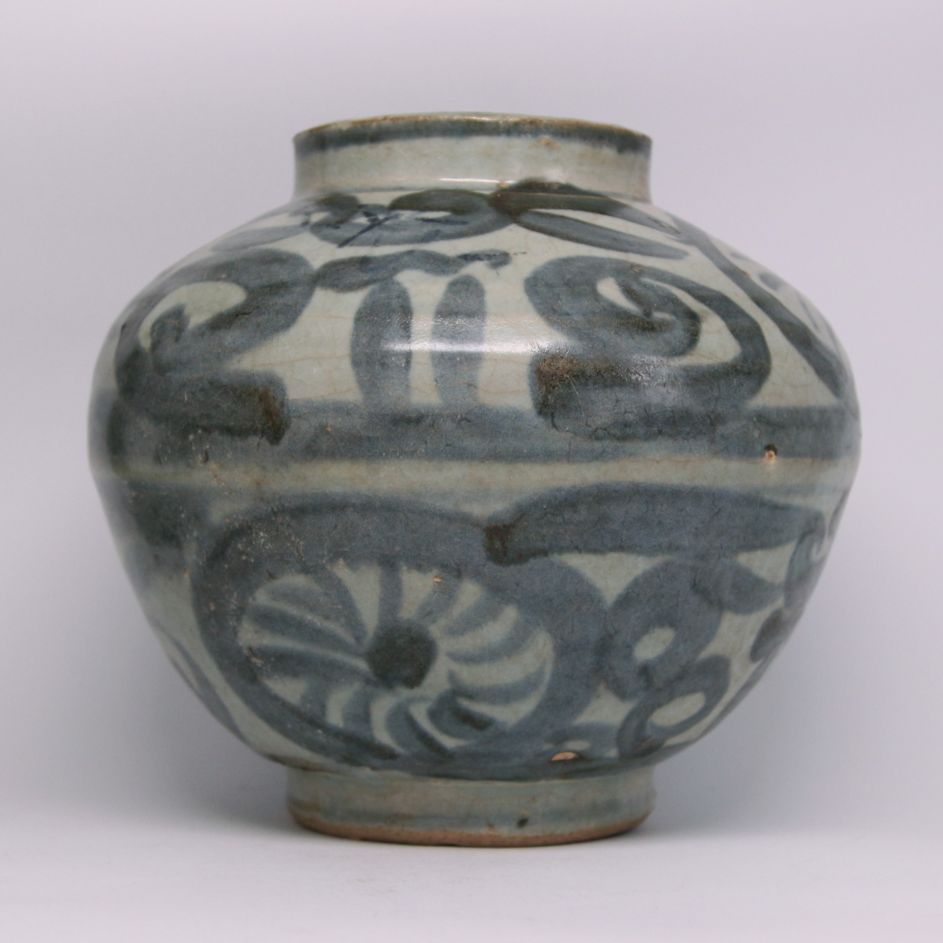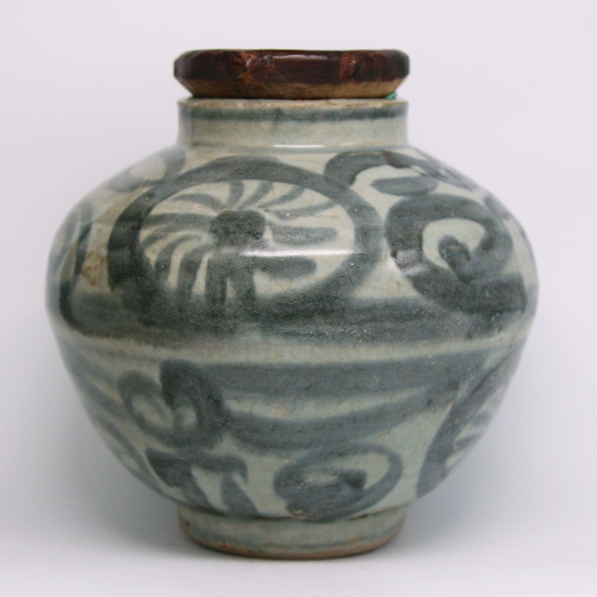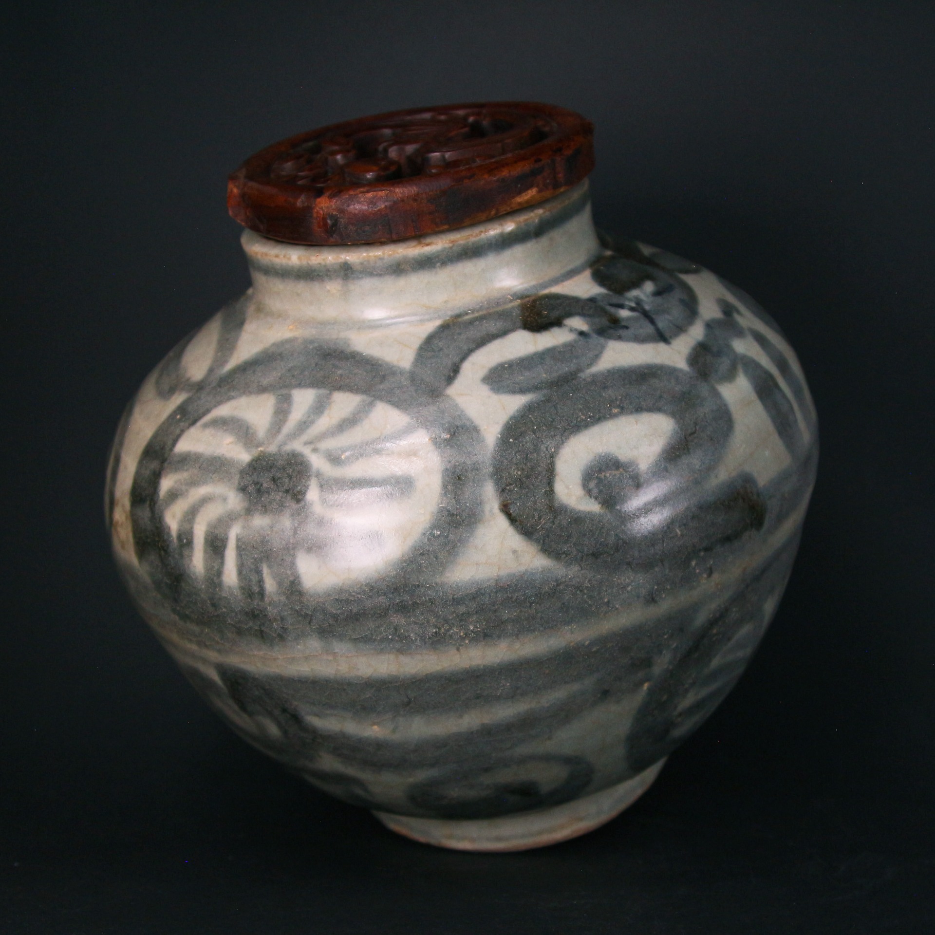 此件為明代青花茶葉罐,器形端正圓潤,短頸豐肩,腹部飽滿,屬實用性極強的儲藏器。通體以青花繪飾折枝花卉紋,筆意流暢自然,青料色澤沉穩內斂,與溫潤白釉相映成趣,呈現明代民窯青花樸實而耐看的風格。口沿配有木雕鏤空蓋,雕飾瑞獸紋樣,線條圓熟,為後配佳蓋,既實用亦增添雅趣。