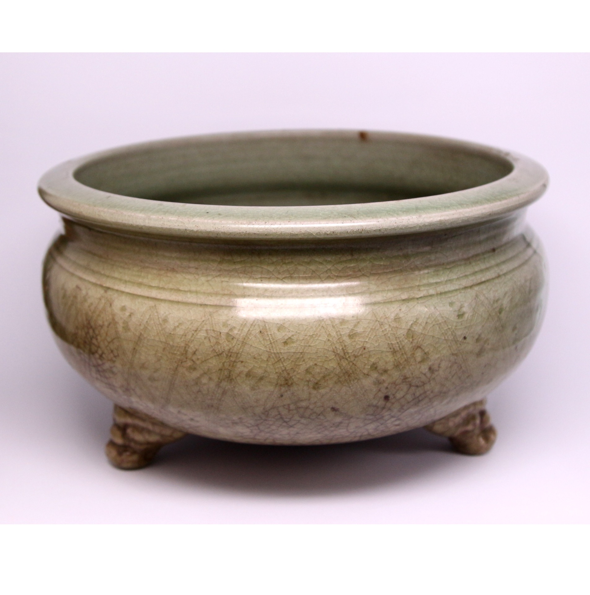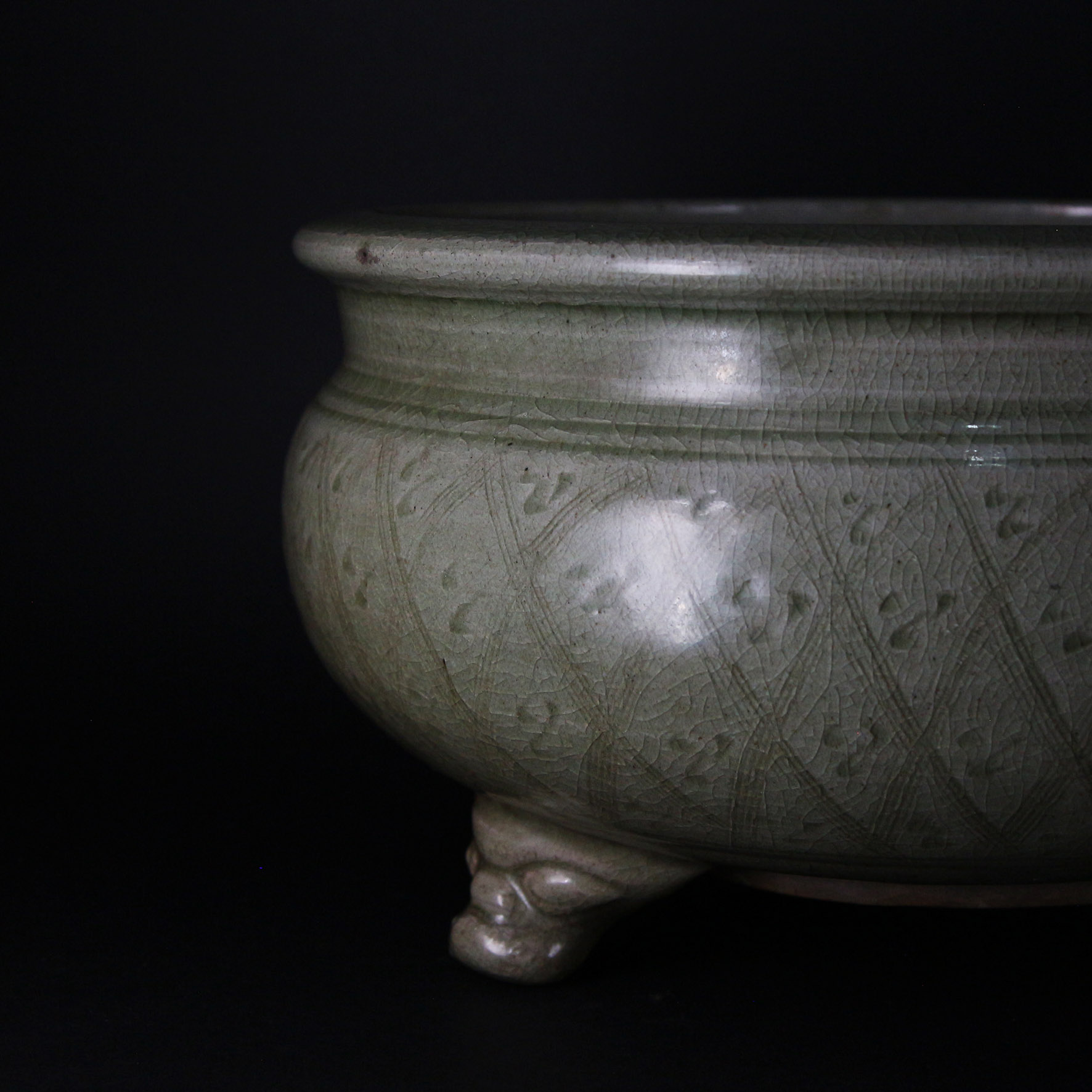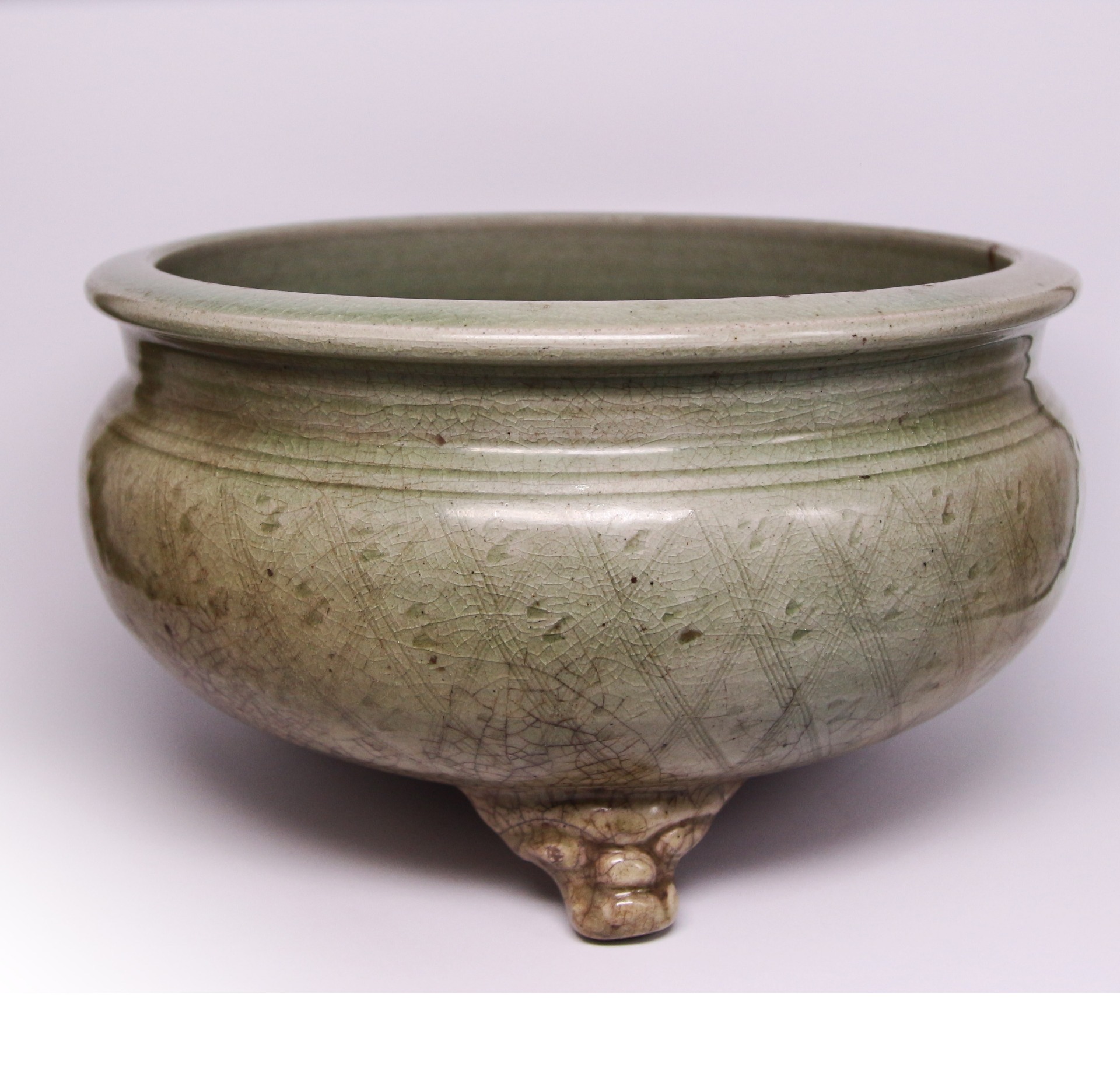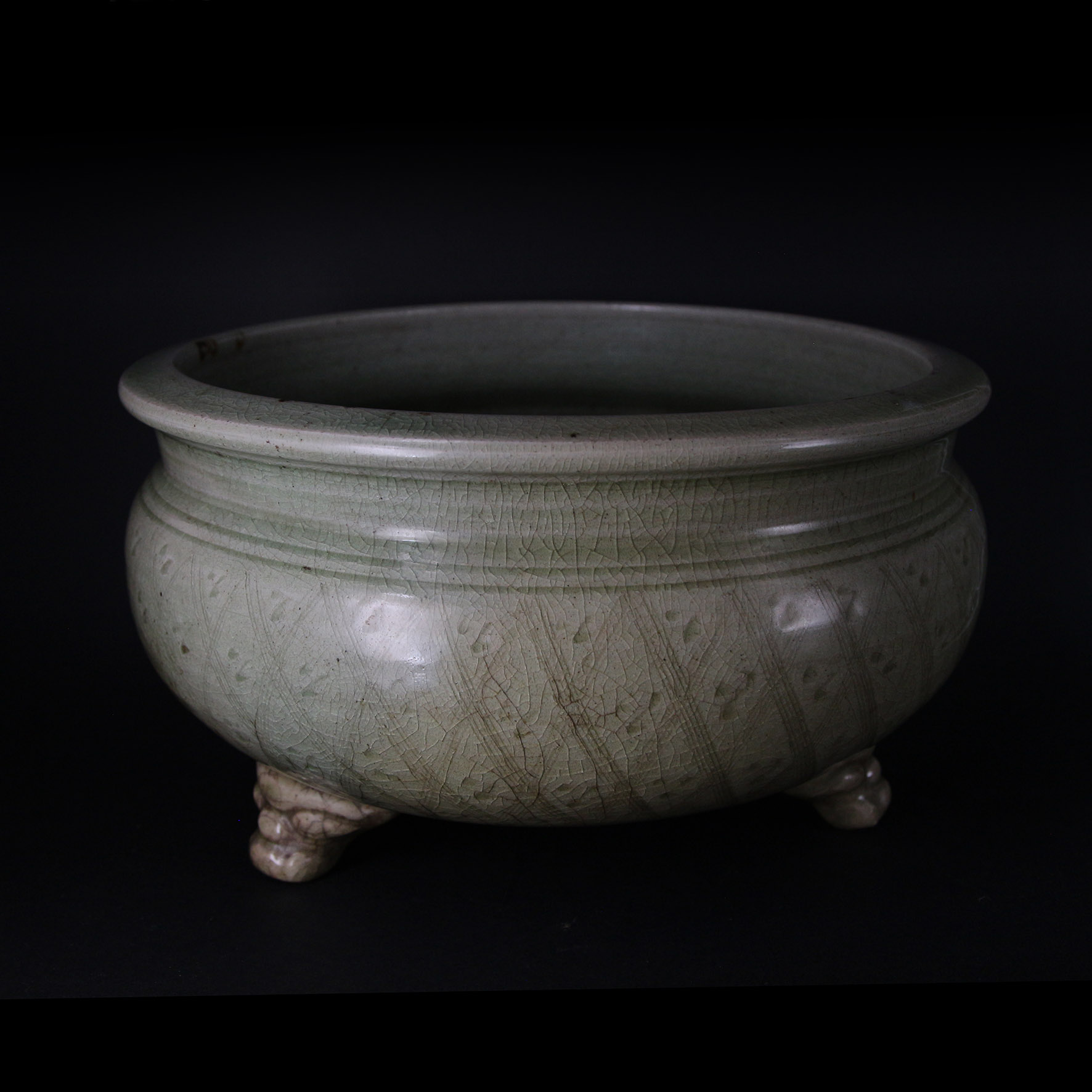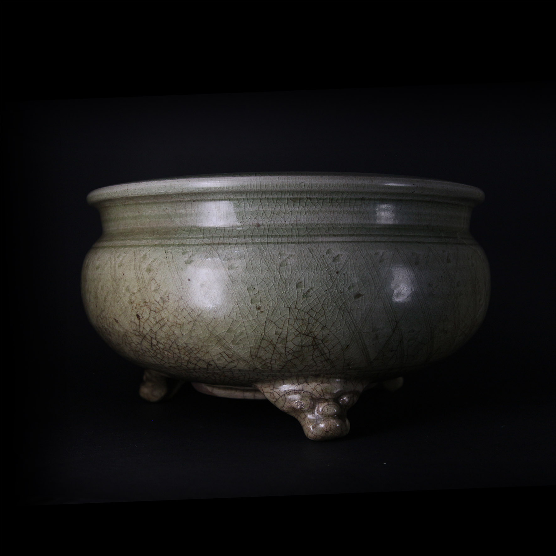 28公分大香爐。龍泉窯是中國著名窯系,在明代進入成熟期,主要燒製釉色呈青中泛黃的「豆青」釉瓷器。明代龍泉窯的器物胎體厚重碩大,造型規整,此類三足爐是仿古代青銅鼎的形制,常作為焚香禮佛或文房清供使用。爐口多為斂口鼓腹,下承三足,器型莊重沉穩,體現了明代崇古的藝術風尚。