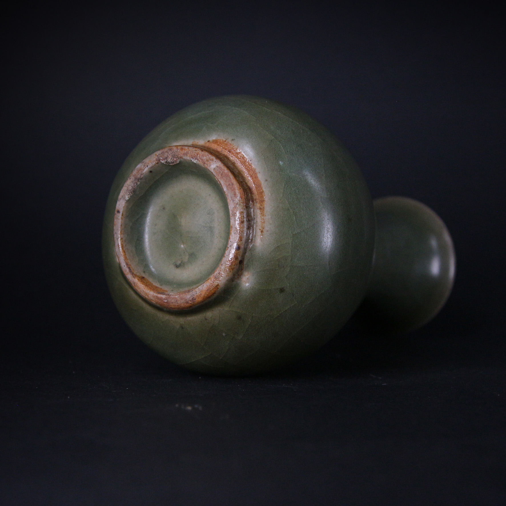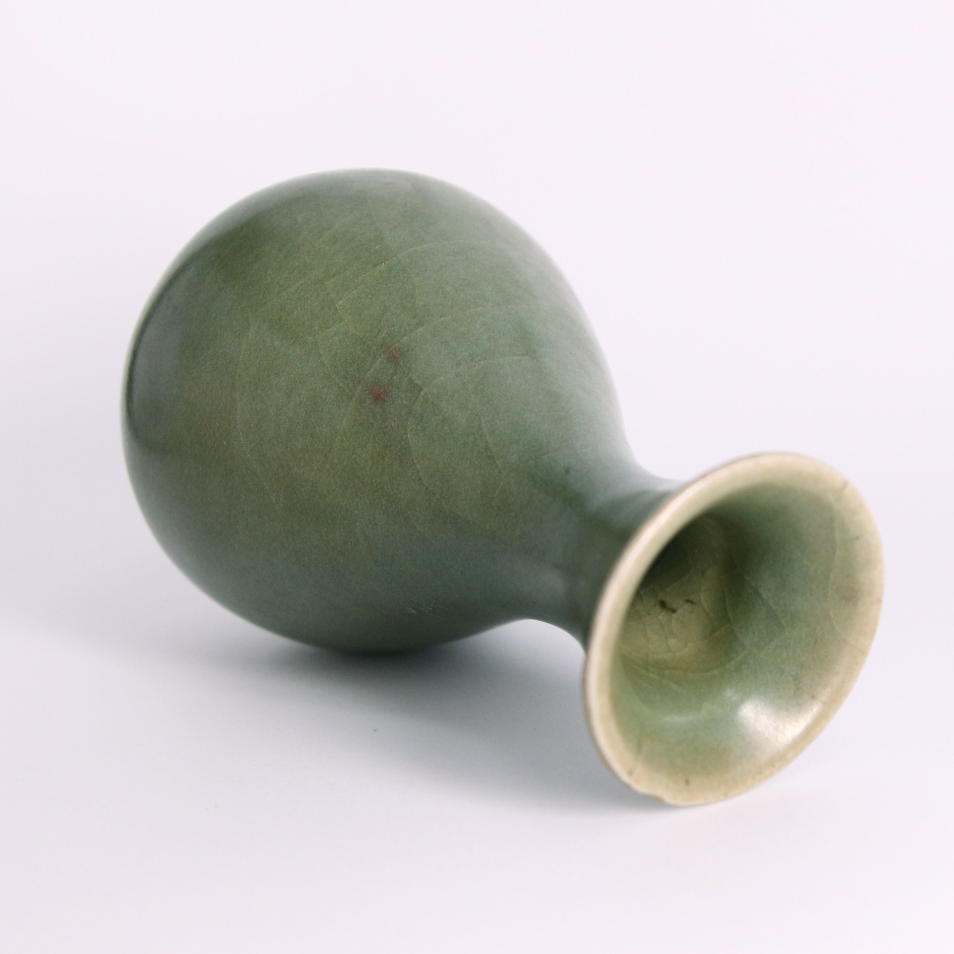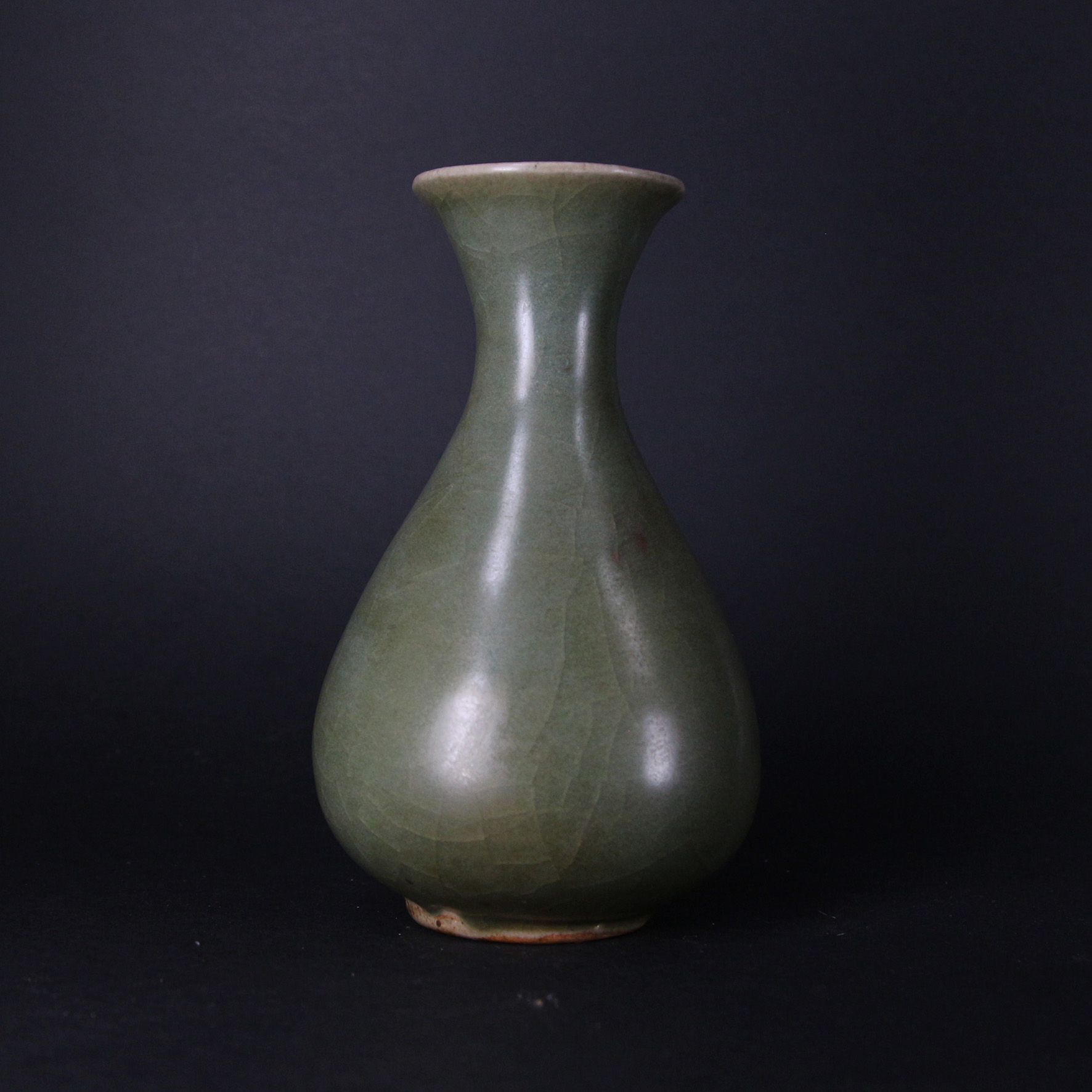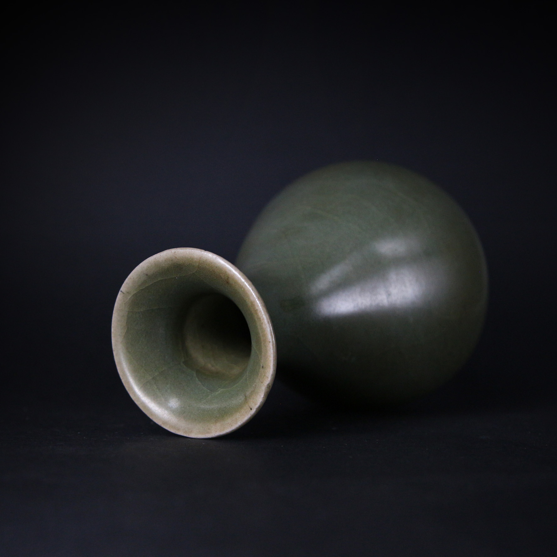 瓶身的弧線如水般柔和,青釉在光影下呈現深淺變化,顯得內斂而富質感。玉壺春瓶自古象徵吉慶、和美,此件作品更以青瓷特有的溫雅氣息,展現明代審美的純粹與含蓄。靜置案頭,便能感受龍泉青瓷「如玉非玉」的永恆魅力。
