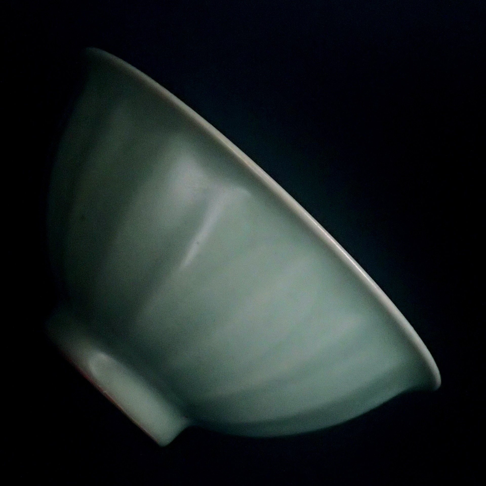 此碗為明代龍泉窯青瓷代表作之一,器形敞口深腹,線條柔和勻稱,碗壁外撇,隱約呈蓮瓣起伏之勢,故稱「蓮花碗」。通體施青釉,釉色清潤柔和,呈淡雅粉青調,釉面平整光潔,積釉處色澤略深,展現龍泉窯成熟穩定的燒造水準。胎體細膩,足部修整利落,整體觀感端莊而不失秀雅。