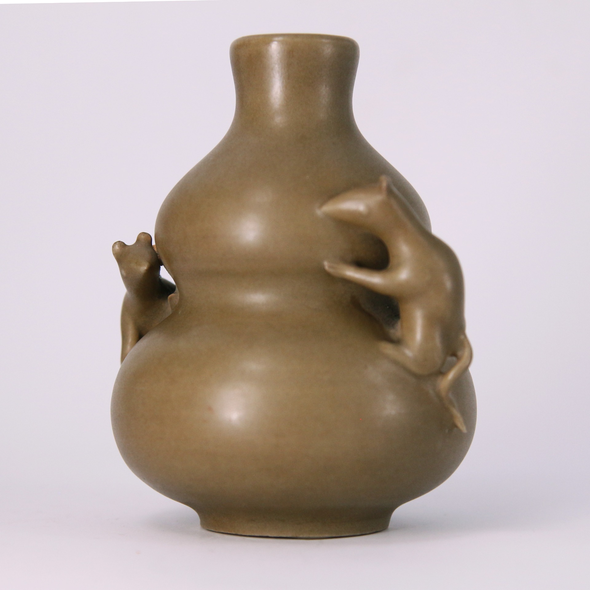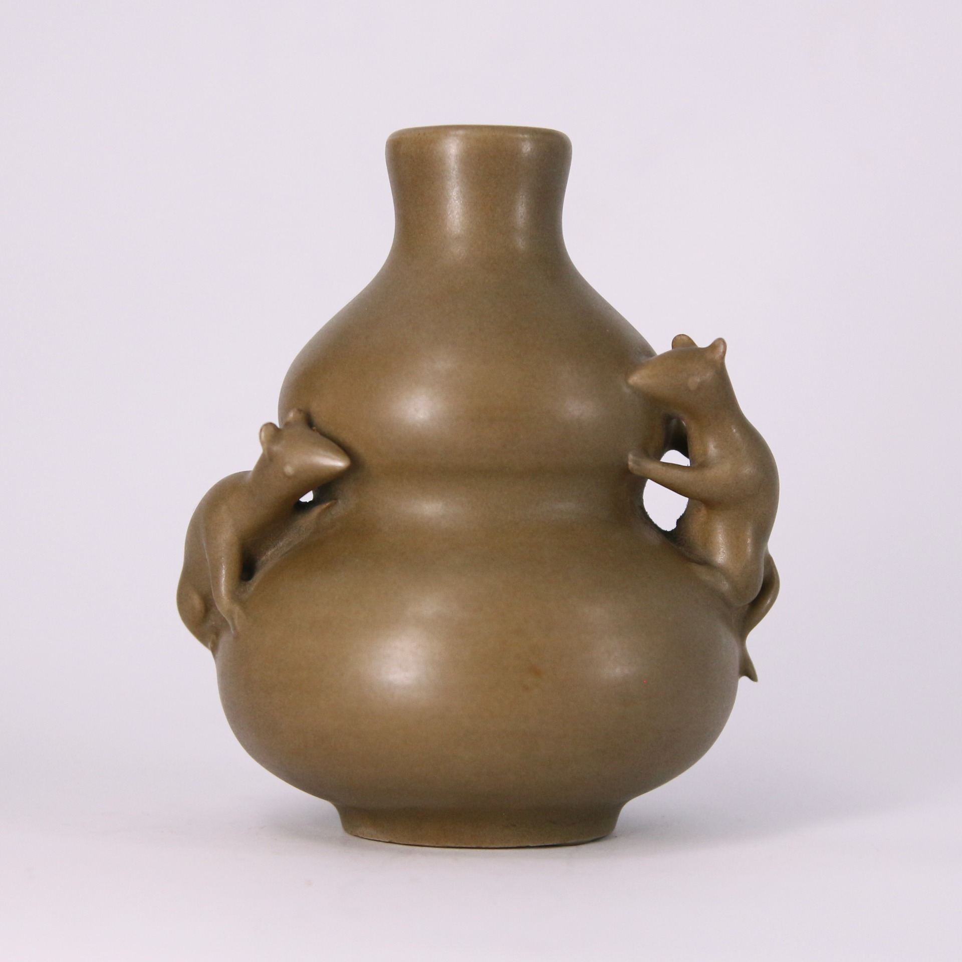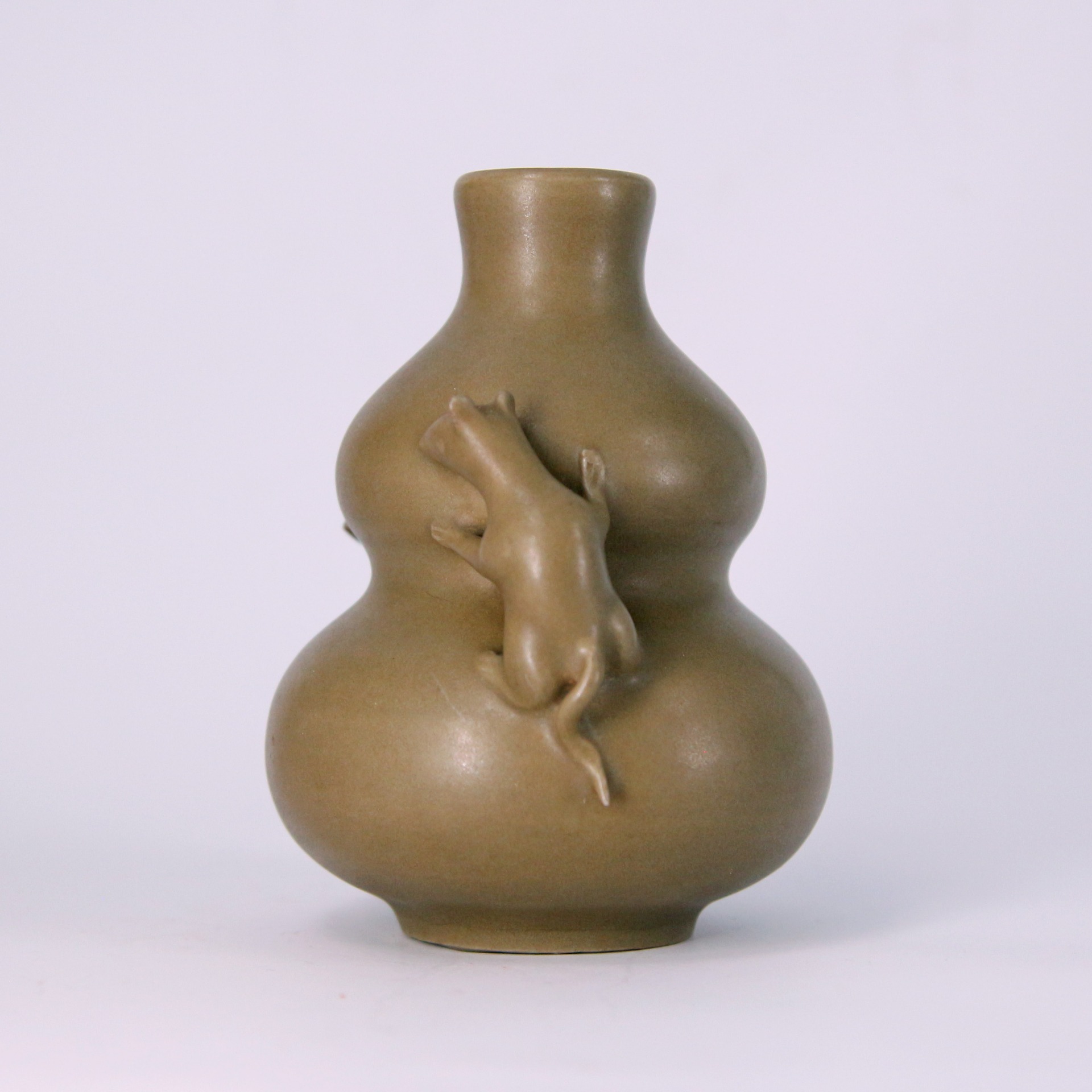 此件葫蘆形瓶出自明代龍泉窯,胎質細緻,通體施青釉,色澤溫潤含蓄,呈現龍泉青瓷特有的玉質光澤。器形以葫蘆為式,上小下大、曲線圓融,腹部塑貼兩鼠攀附其上,立體雕塑與器身一體成形,轉折自然。整體修坯流暢、釉層肥厚而勻淨,反映明代龍泉窯在傳承宋元技法基礎上,對器型比例與造型表現的成熟掌握。