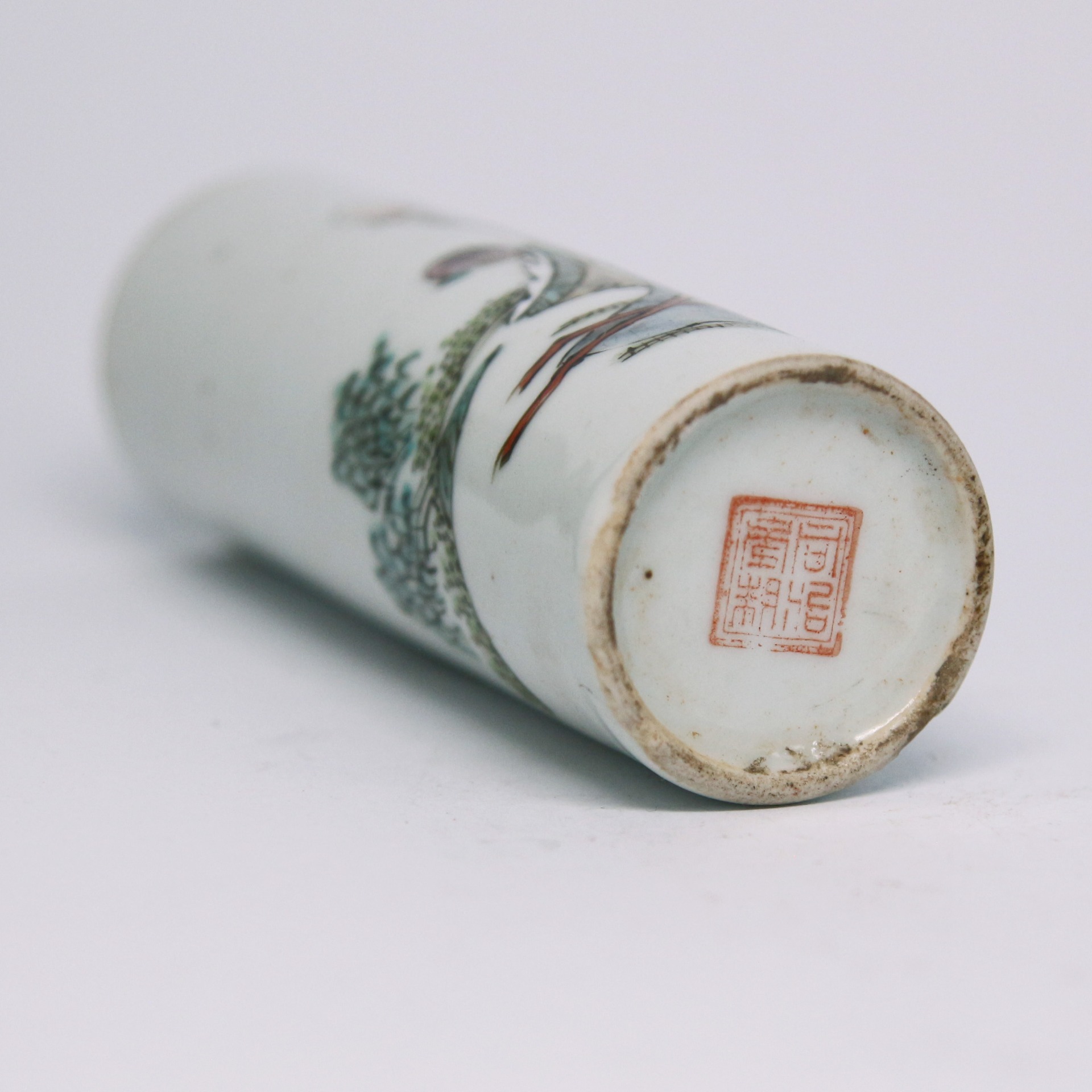 此類筒形瓷器在清代至民國時期常見,主要作為香筒(用於插線香,有穿孔)或帽筒(用於放置官帽或文人頭飾)。由於圖片只顯示局部,其具體用途需根據器身是否有穿孔來判斷。民國時期(1912-1949)是中國瓷器發展史上的轉型期,景德鎮的製瓷業開始從官窯體系轉向民間生產,並出現了如「珠山八友」等繪瓷名家。這件壽翁題材的粉彩瓷器,是當時社會追求吉祥、福壽美好願望的體現,常作為室內陳設或賀壽禮品。