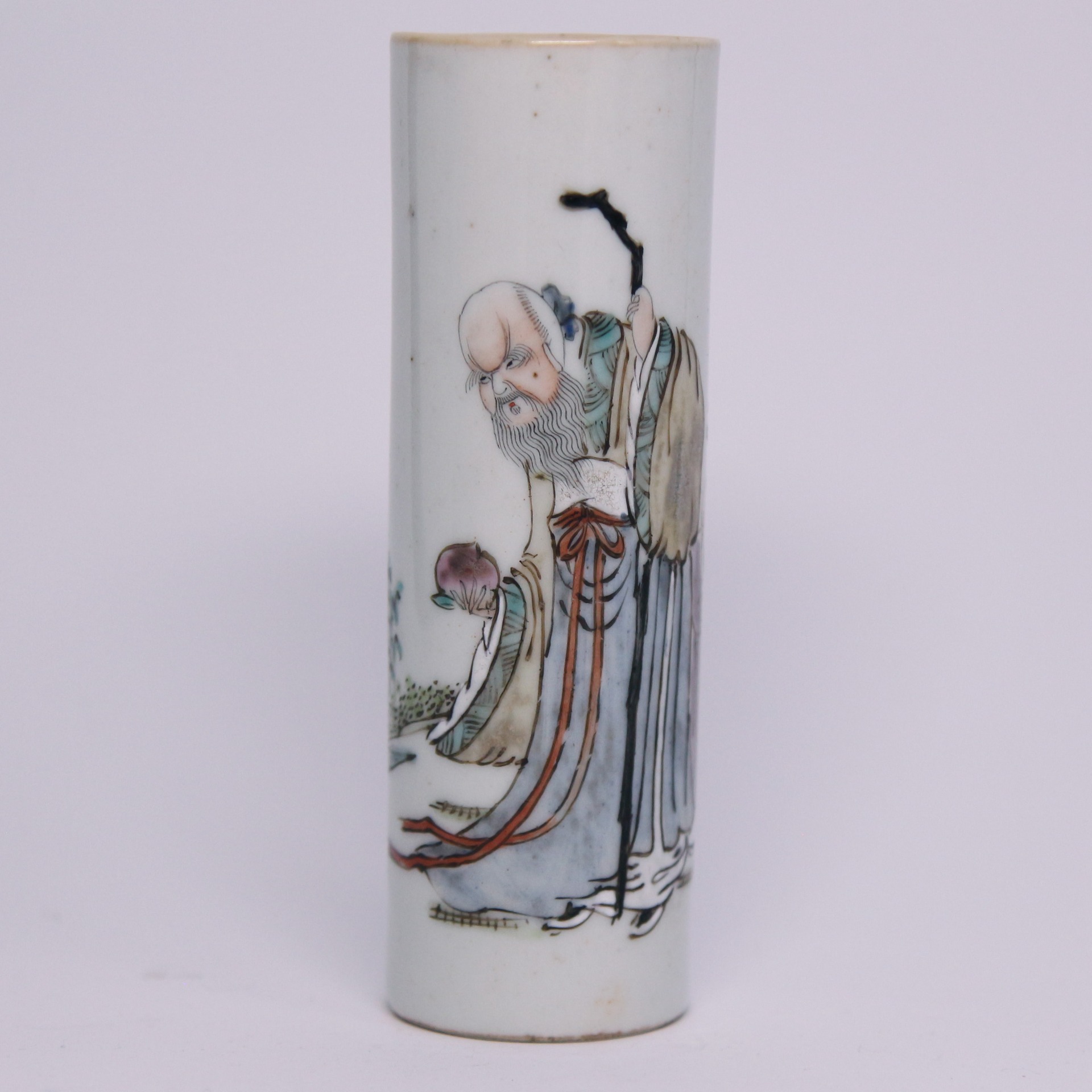 此香筒(或類似器形)運用中國傳統粉彩工藝繪製。粉彩是清代康熙晚期在景德鎮創燒的釉上彩品種,以其柔和、粉潤的色彩層次和細膩的畫工著稱。畫面主題為壽翁(即南極仙翁),他是道教神祇,象徵長壽。圖中的壽翁頭部高聳、白鬚飄逸,手持拐杖,另一手握有或捧著一顆仙桃,仙桃是長壽的象徵,與壽翁的主題相呼應,寓意吉祥長壽。人物衣紋線條流暢,設色淡雅,具有民國時期瓷器繪畫的風格特點。