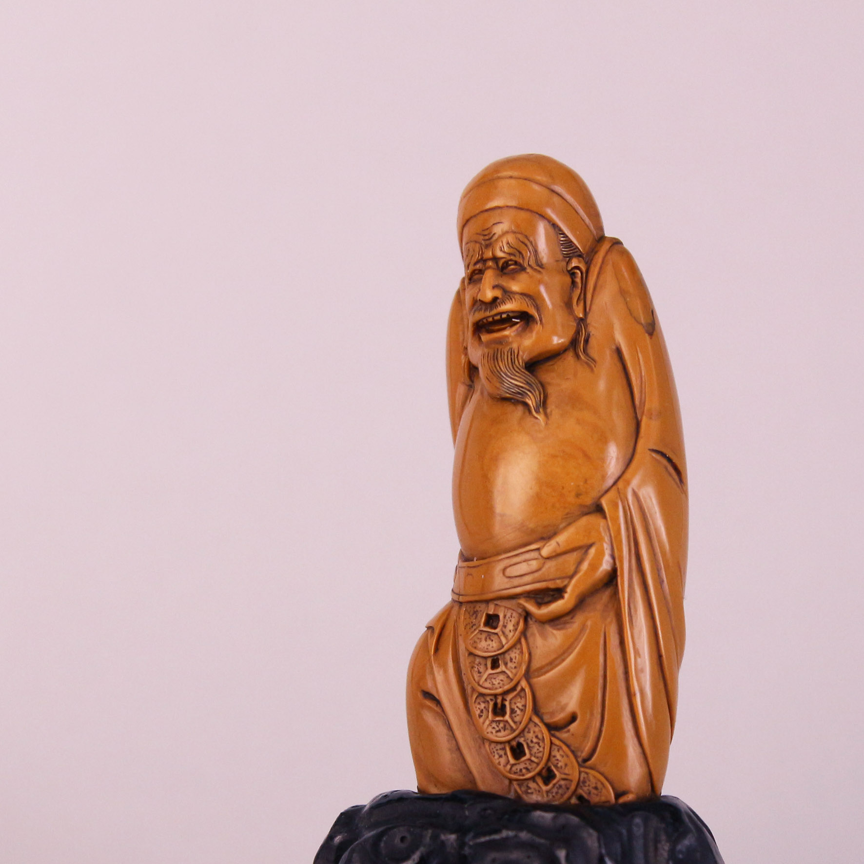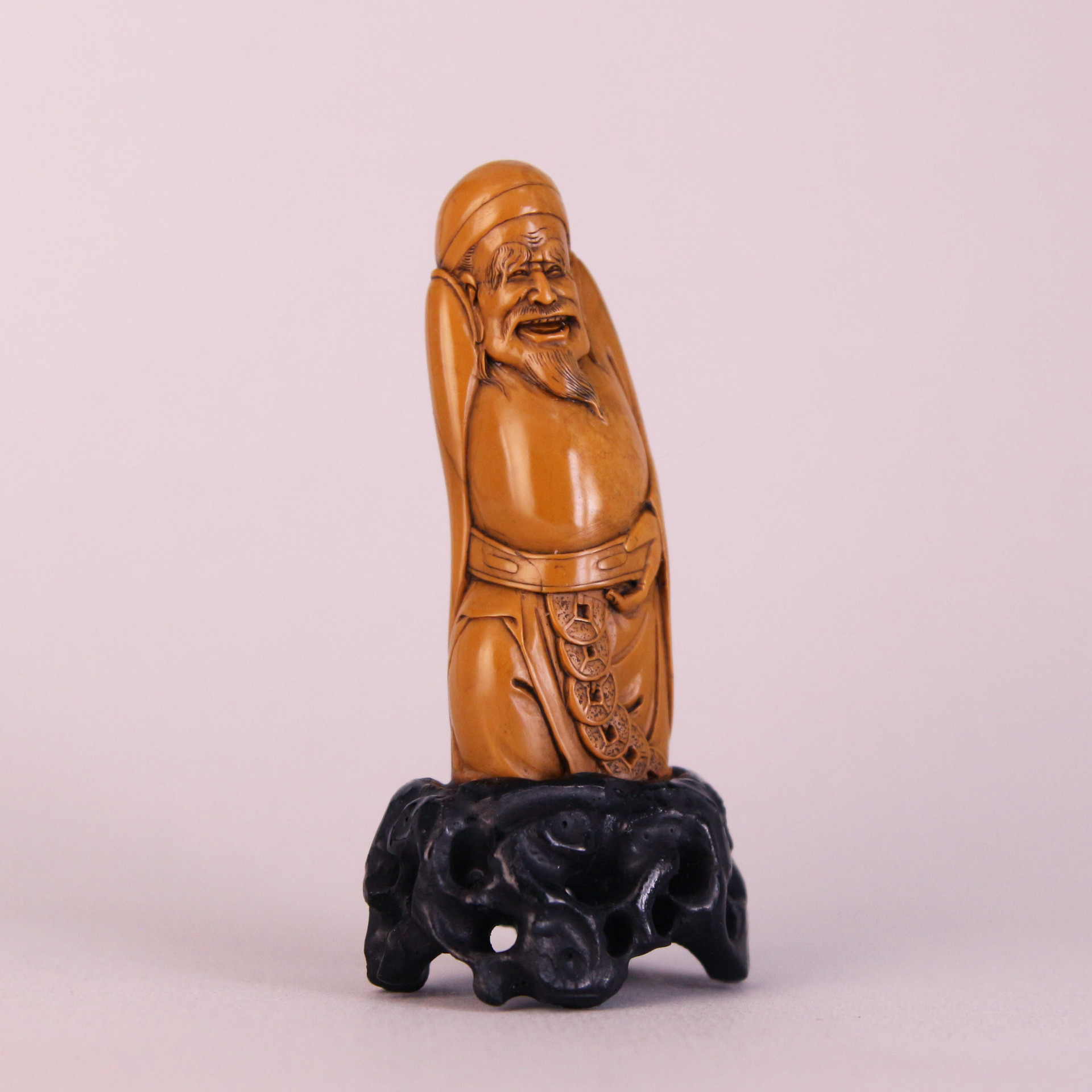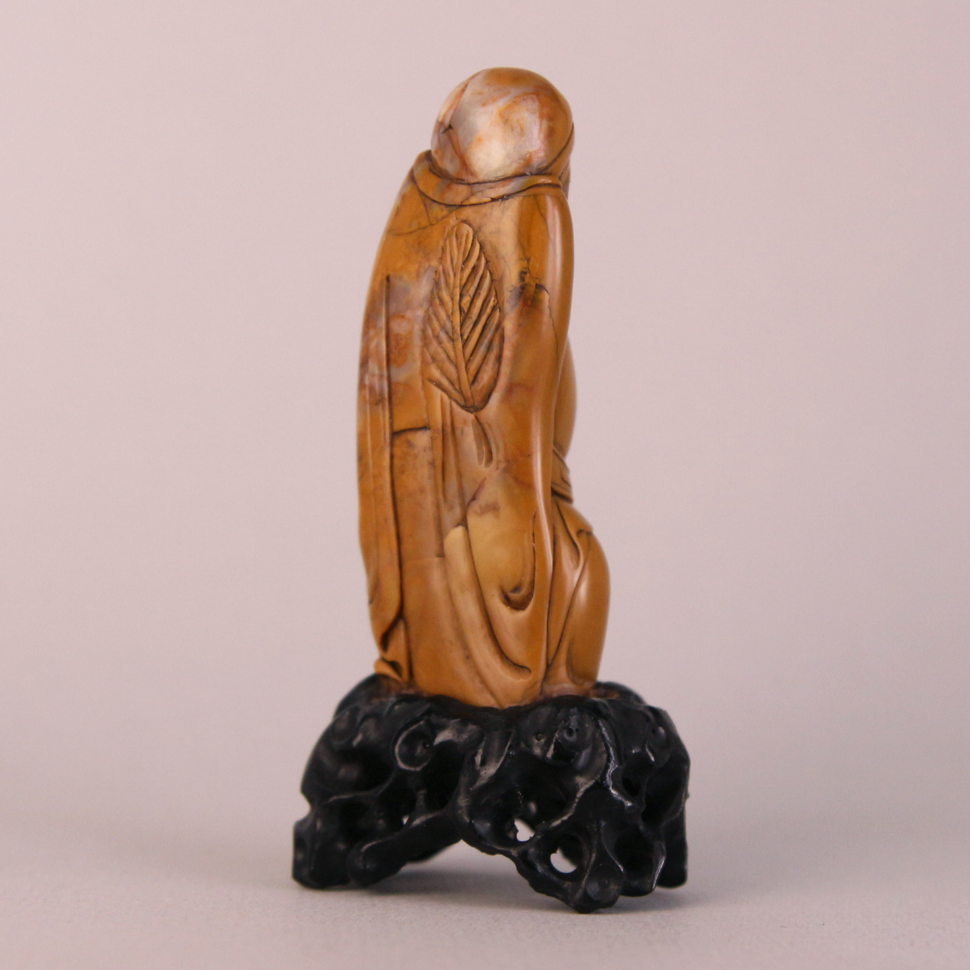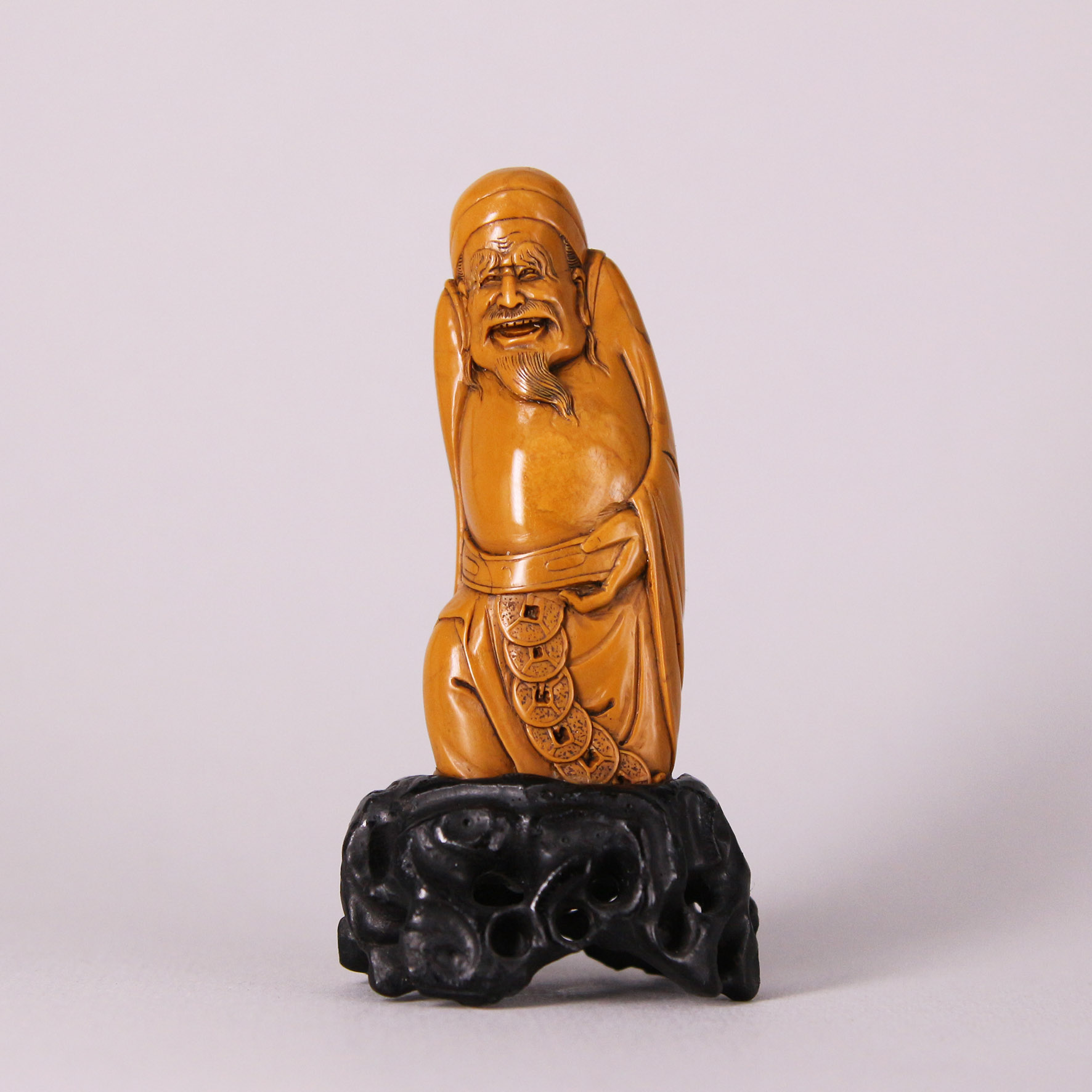 此件以壽山石雕成的財神老翁,石質溫潤瑩亮,色澤橙黃如蜜。老翁長眉笑目,神情慈和,雙手拱於胸前,寓意聚財納福。雕工精緻流暢,衣褶自然生動,展現民國時期文人雕刻的靈氣與雅趣。