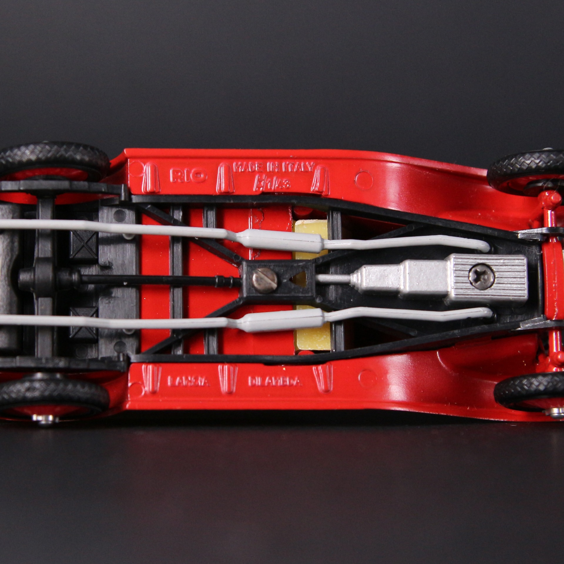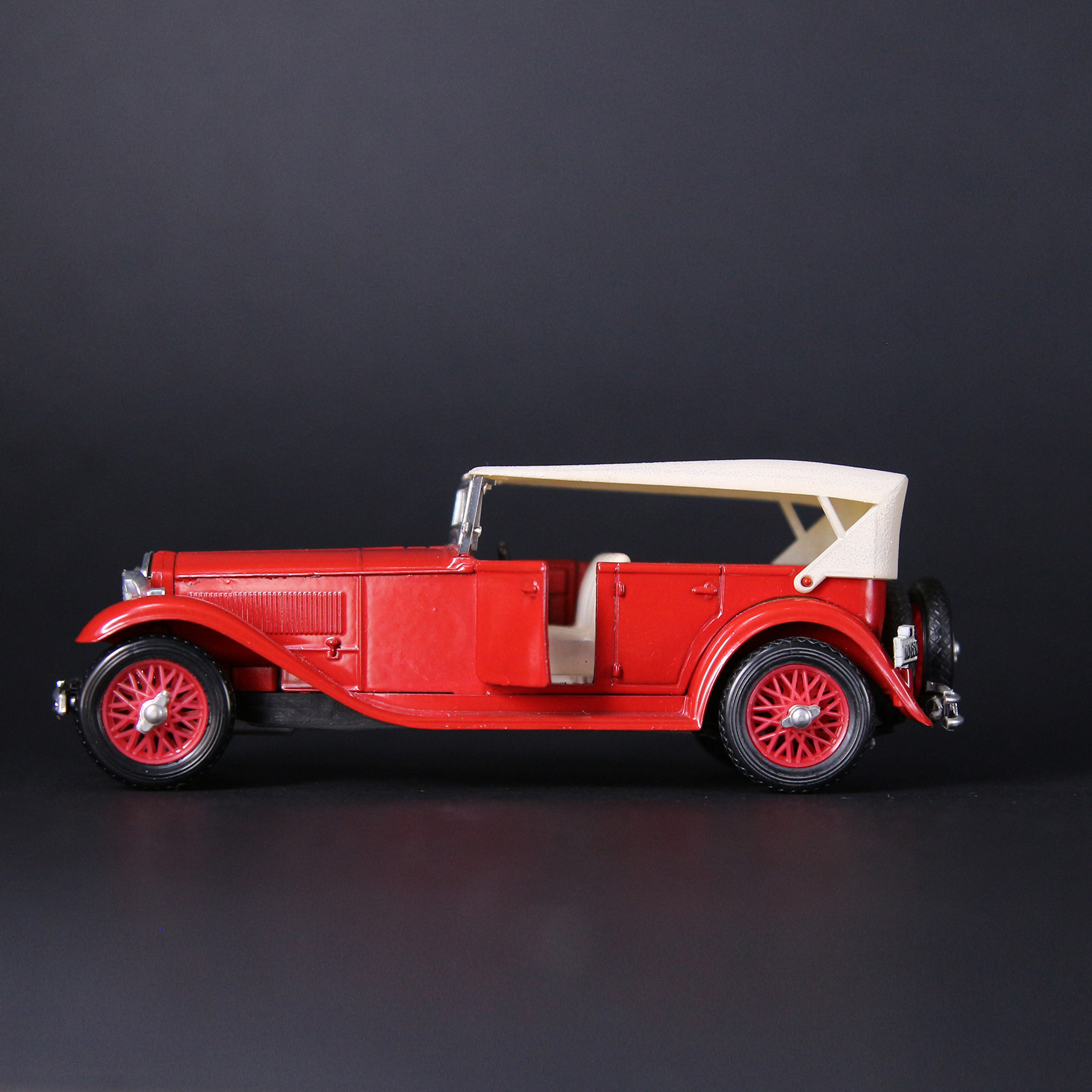 這是一件仿製早期經典車型的老爺車模型,推測製造於民國時期,即20世紀中期前後,產地為義大利。模型整體採用亮麗的紅色塗裝,搭配米白色的軟頂篷,呈現出復古且醒目的外觀。它屬於壓鑄(Die-cast)合金或類似金屬/塑料混合材質製成,精細地再現了老爺車的諸多細節,包括獨立的擋泥板、經典的矩形水箱護罩、圓形頭燈以及可開合的車門等。這類模型強調對真實車輛的縮小與還原,具有較高的仿真度,是當時廣受歡迎的收藏級玩具或裝飾品。