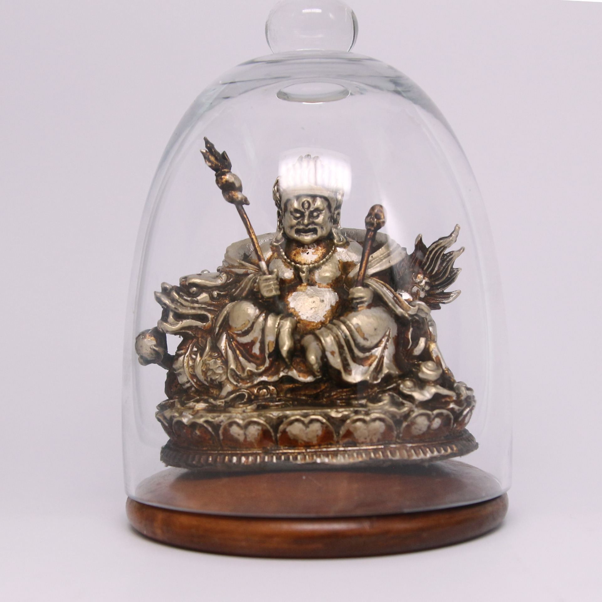 這尊白財神以銀質為體、通體鍍金,色澤溫潤華麗,展現密教財神造像的莊嚴力量。白財神面容威猛,額現法眼,手持權杖與法器,象徵降伏障礙、開啟福運。其衣紋起伏細密,鍍金與殘留彩繪交映,使神像呈現歲月沉澱後的瑰麗光彩。